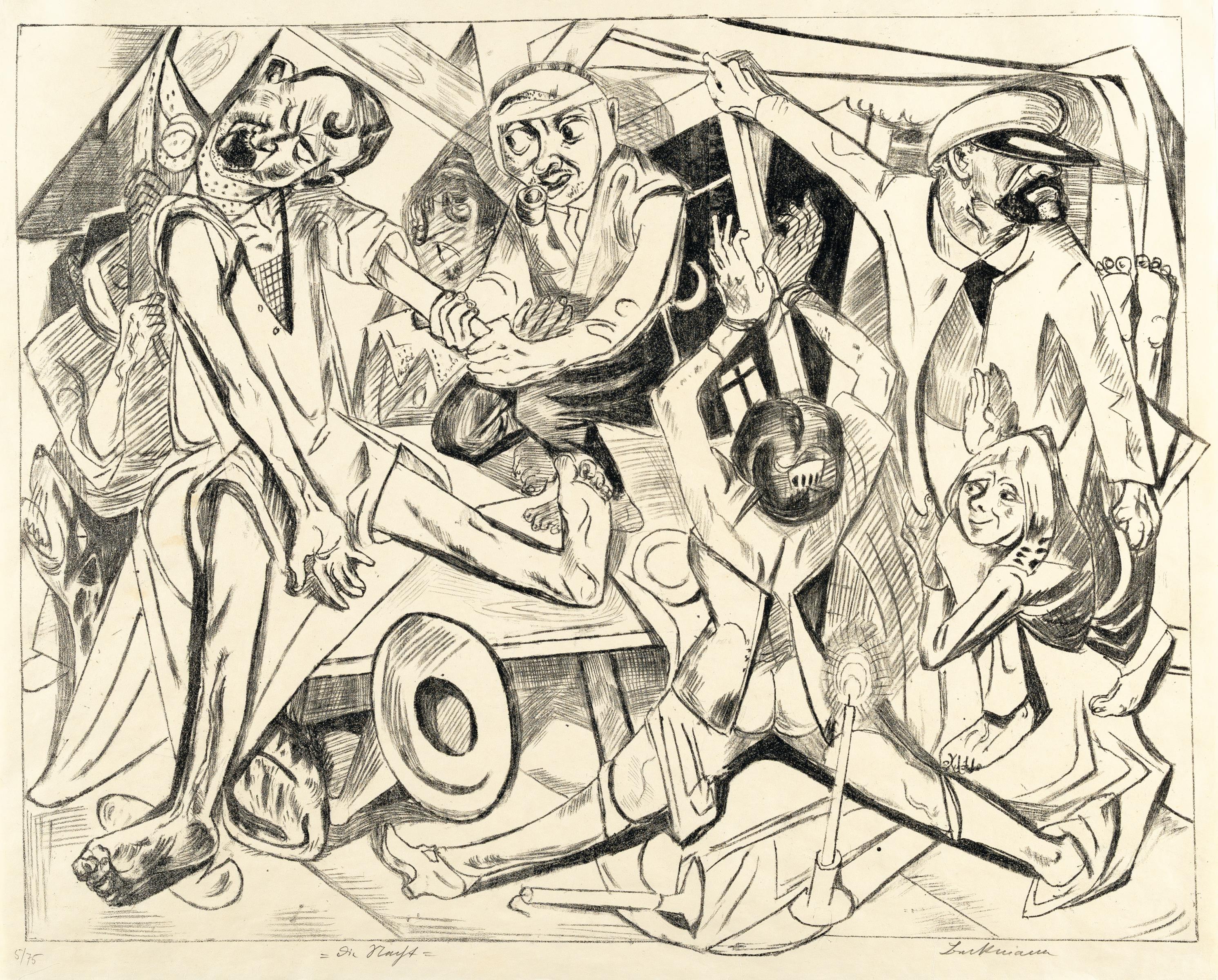 Als er 1918/19 sein Gemälde „Die Nacht“ malt und den dazu passenden Grafikzyklus „Die Hölle“ herausbringt, ist der Erste Weltkrieg gerade vorbei. In Compiègne wird ein Waffenstillstand geschlossen, die Materialschlachten und wahrgewordenen Alpträume in Schützengräben sind vorbei. Heute, über 100 Jahre später, klingt das wie ein Grund zur Freude. Doch die Realität ist eine andere: Im Deutschen Reich eskaliert die Situation bis zur Novemberrevolution 1919, Inflation und Not, Kriegsversehrte und Mittellose, Großstädte gleichen Bürgerkriegsgebieten, es gilt das Recht des Stärkeren. Die von vielen Intellektuellen, etwa Nietzsche und eben auch der von ihm beeinflusste Beckmann, erhoffte reinigende Wirkung des Krieges weicht der Erkenntnis, dass es im Krieg eben nur Verlierer gibt.