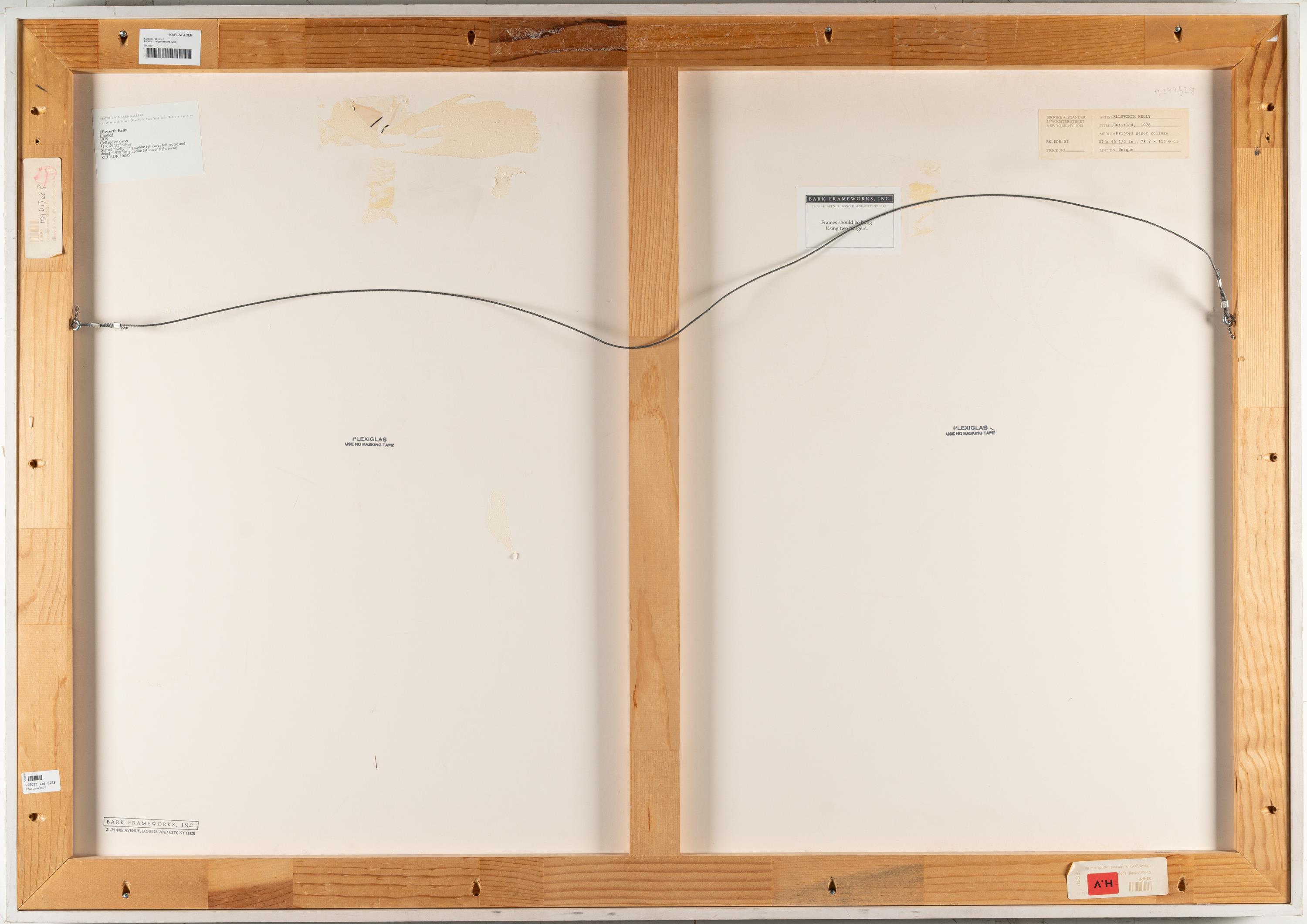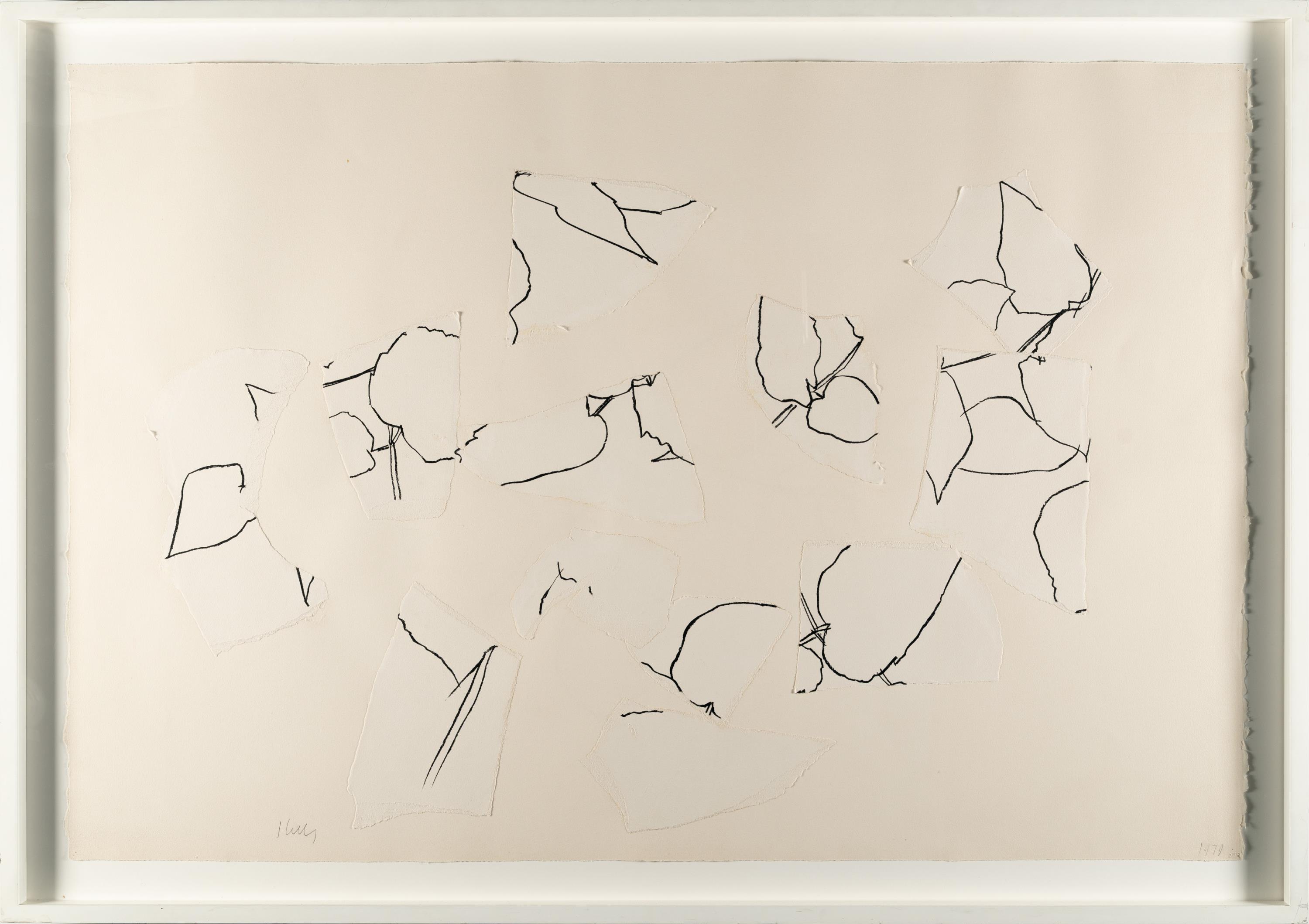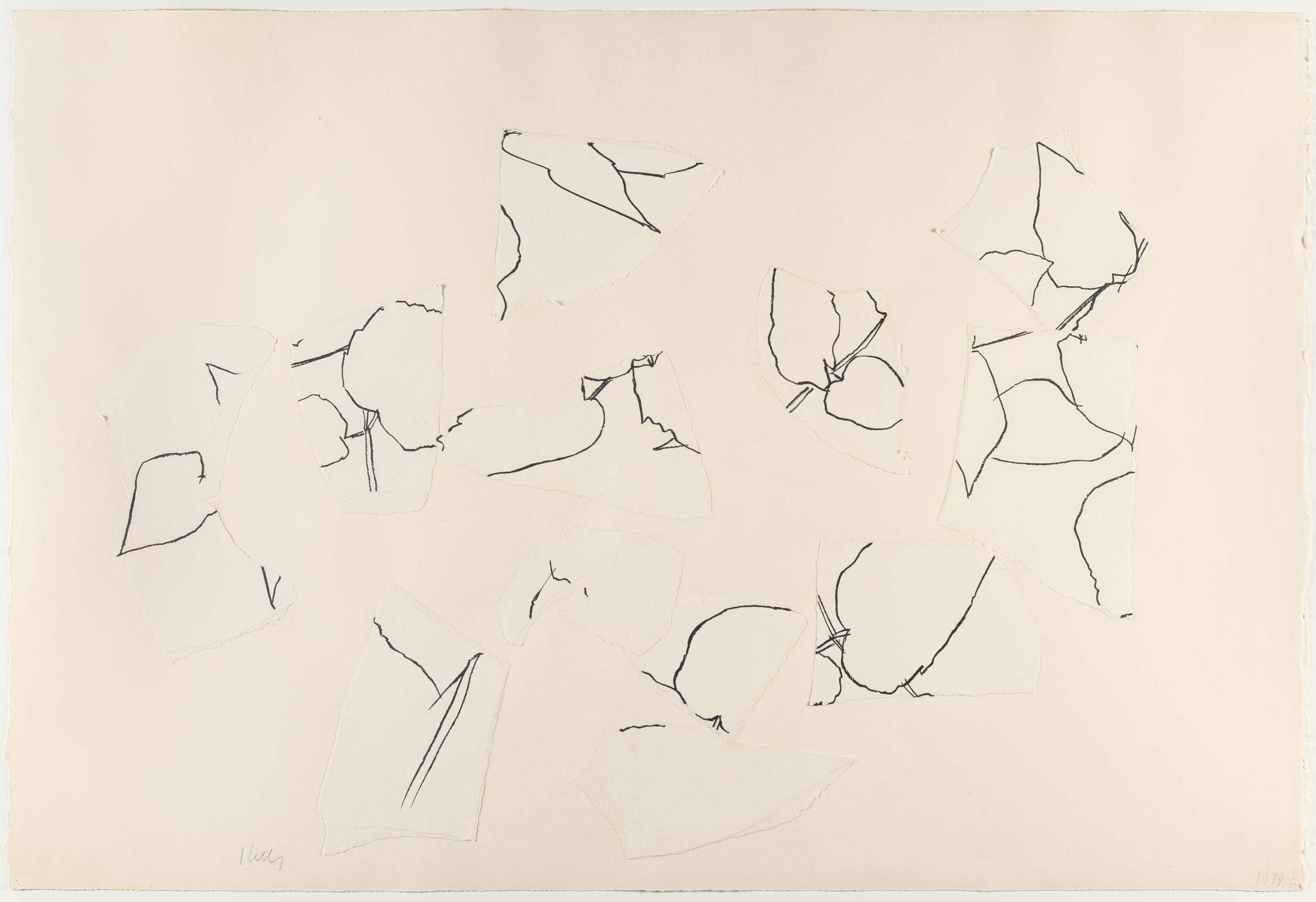 Ellsworth Kelly ist einer der bedeutendsten amerikanischen Künstler, der vor allem für seine großformatigen, monochromen Leinwände bekannt ist. Mit der Verwendung einfacher, klarer Formen und leuchtenden Farben war seine Malerei der Gegenpol zum Abstrakten Expressionismus. Kellys Farbfeldmalerei lieferte einen wichtigen Beitrag zur Malerei des 20. Jahrhunderts. Weniger bekannt sind seine Pflanzenbilder, denen er sich zeitlebens in seinem zeichnerischen und grafischen Werk widmete. Er zögerte lange, seine Zeichnungen zu zeigen, da er fürchtete, es könnte verwirren. Kelly verstand sich selbst ganz klar als abstrakten Maler. Die Collage „Ohne Titel“ ist 1979 entstanden und basiert auf einer Pflanzendarstellung, Kelly hat das Papier zerrissen und neugeordnet zu einer mehrteiligen Komposition. Auf diese Weise widmet er sich grundsätzlichen künstlerischen Fragen von Umriss, Form, Raum, Fläche und Konturen. So schließt sich der Kreis zu seinem Anliegen als Maler, er habe daran gearbeitet, die Form von ihrem Untergrund zu befreien und sie so zu gestalten, dass sie eine eindeutige Beziehung zu ihrem Umfeld habe, wie er selbst formulierte.
