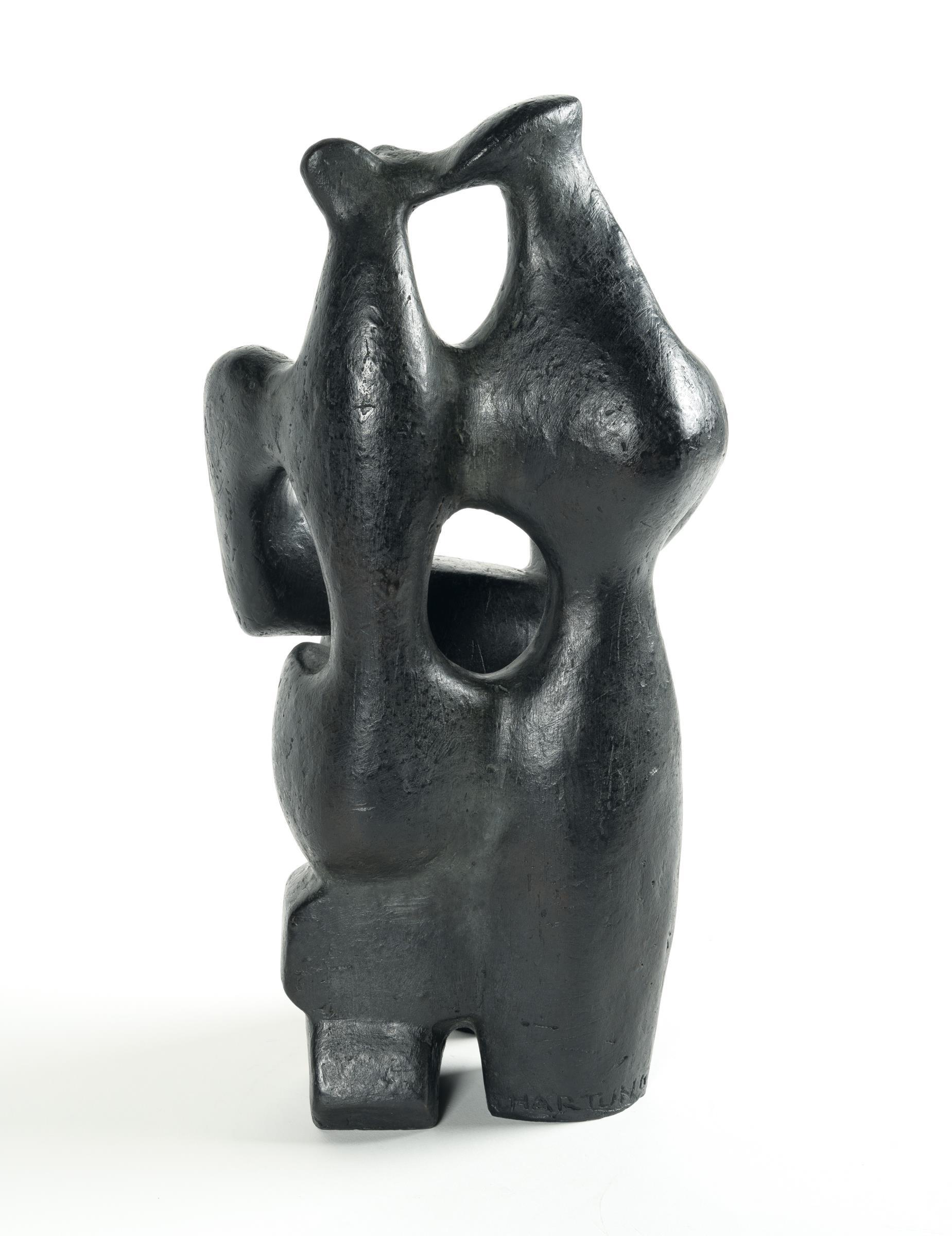 Dämonen! Und dann noch gleich eine ganze Gruppe! Der Titel von Karl Hartungs Bronzeplastik klingt, als könnte sie uns das Fürchten lehren. Demgegenüber steht die Figur selbst, die zum Immer-Wieder-Anschauen und Fantasieren einlädt. Durchaus unter dem Einfluss der Arbeiten von Henry Moore gestaltet Hartung Ende der 1940er Jahre eine anamorphe Plastik. Mal meint man fast, ein Figurenpaar zu erkennen, dann sind es wieder vogelhafte Züge, die doch gleich wieder zerfallen. Dabei verdeutlicht der Künstler meisterhaft, dass er das Spiel mit Spannung und Lösung beherrscht, besteht seine „Dämonengruppe“ doch ebenso aus Fülle und Masse wie aus Weglassen und Leere. Die „Löcher“ geben Ein- und Ausblicke, beim Umrunden oder Drehen der Plastik erscheinen so immer wieder neue Formen und Bezugsmöglichkeiten, wird aus der eben noch erkannten Familie ein Baumstumpf, der sich rasch in Rauchschwaden auflöst ...