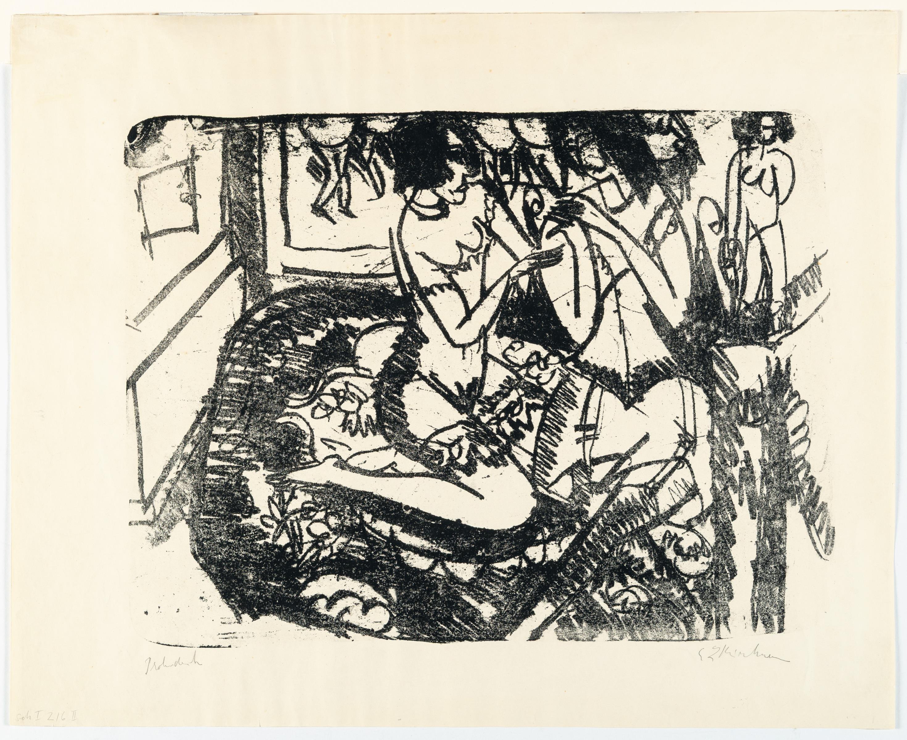 Bei den Dargestellten handelt es sich sehr wahrscheinlich um Gerda und Erna Schilling, die Kirchner 1912 in Berlin kennengelernt hat. Im Hintergrund sind das Gemälde „Sechs Tänzerinnen“ (WVZ Gorden 193) und die Holzskulptur „Sich abtrocknende Badende“ (WVZ Henze 1911/02) zu erkennen, beide aus dem Jahr 1911.