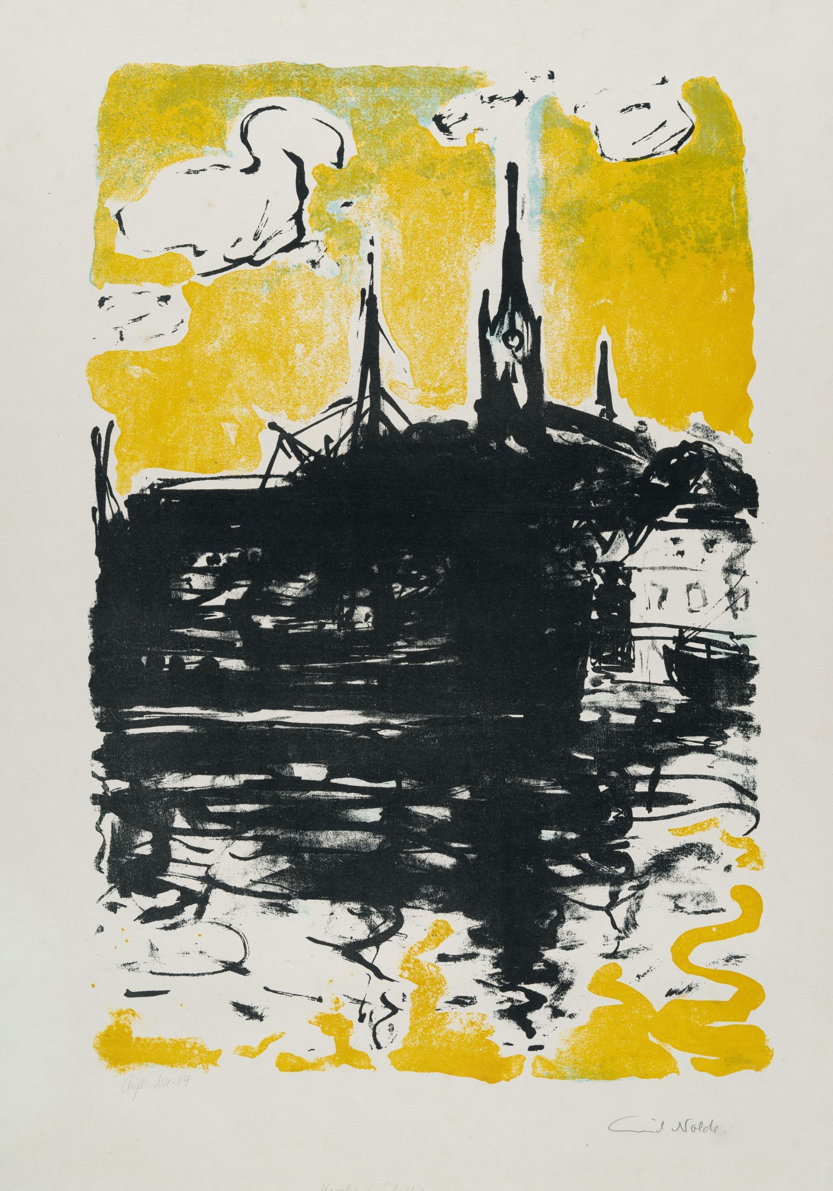 Nach der Entstehung des Motivs 1907 und einer einfarbigen schwarzen Auflage, druckt Nolde die farbigen Varianten dieses Blattes erst im Jahr 1915.