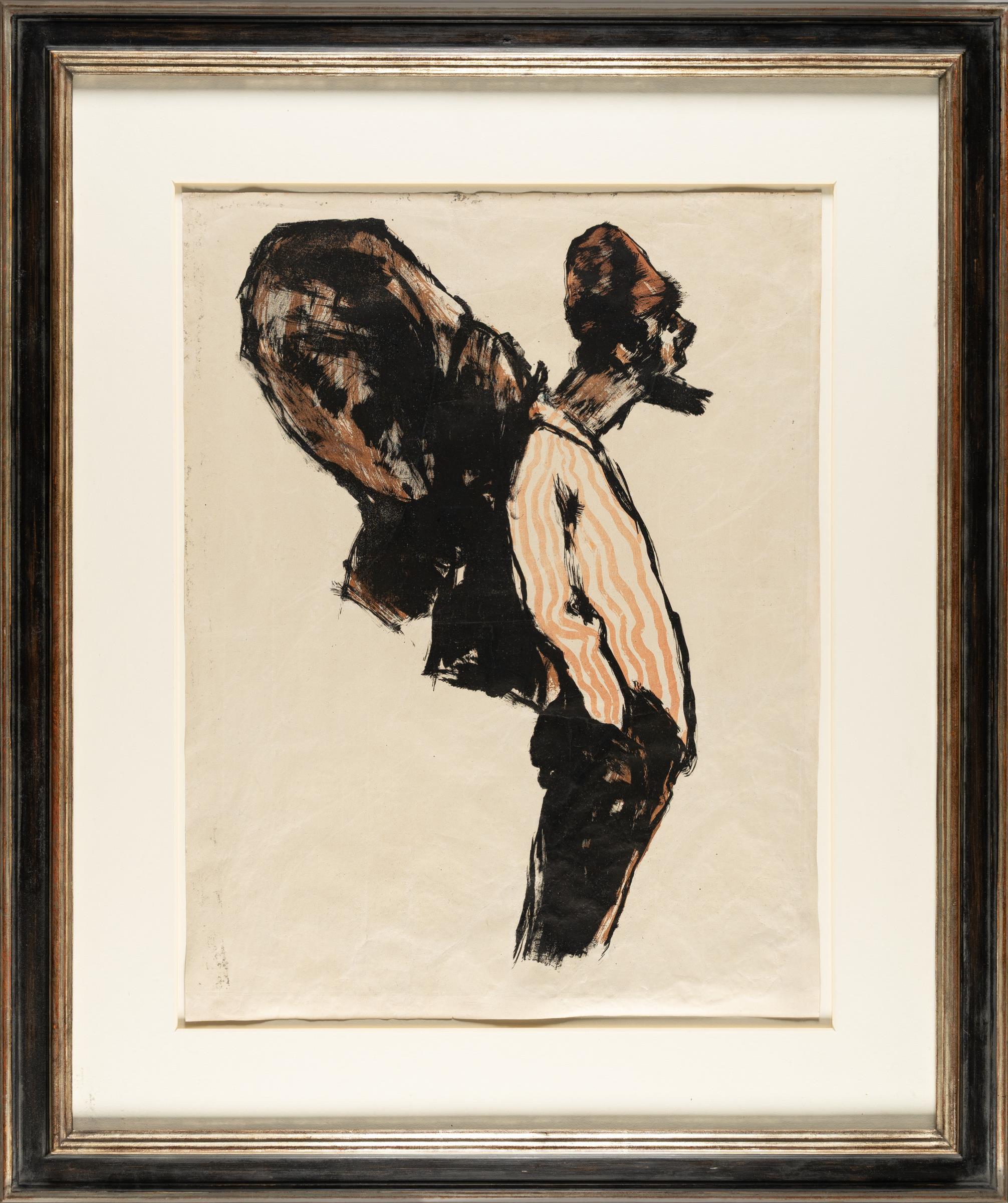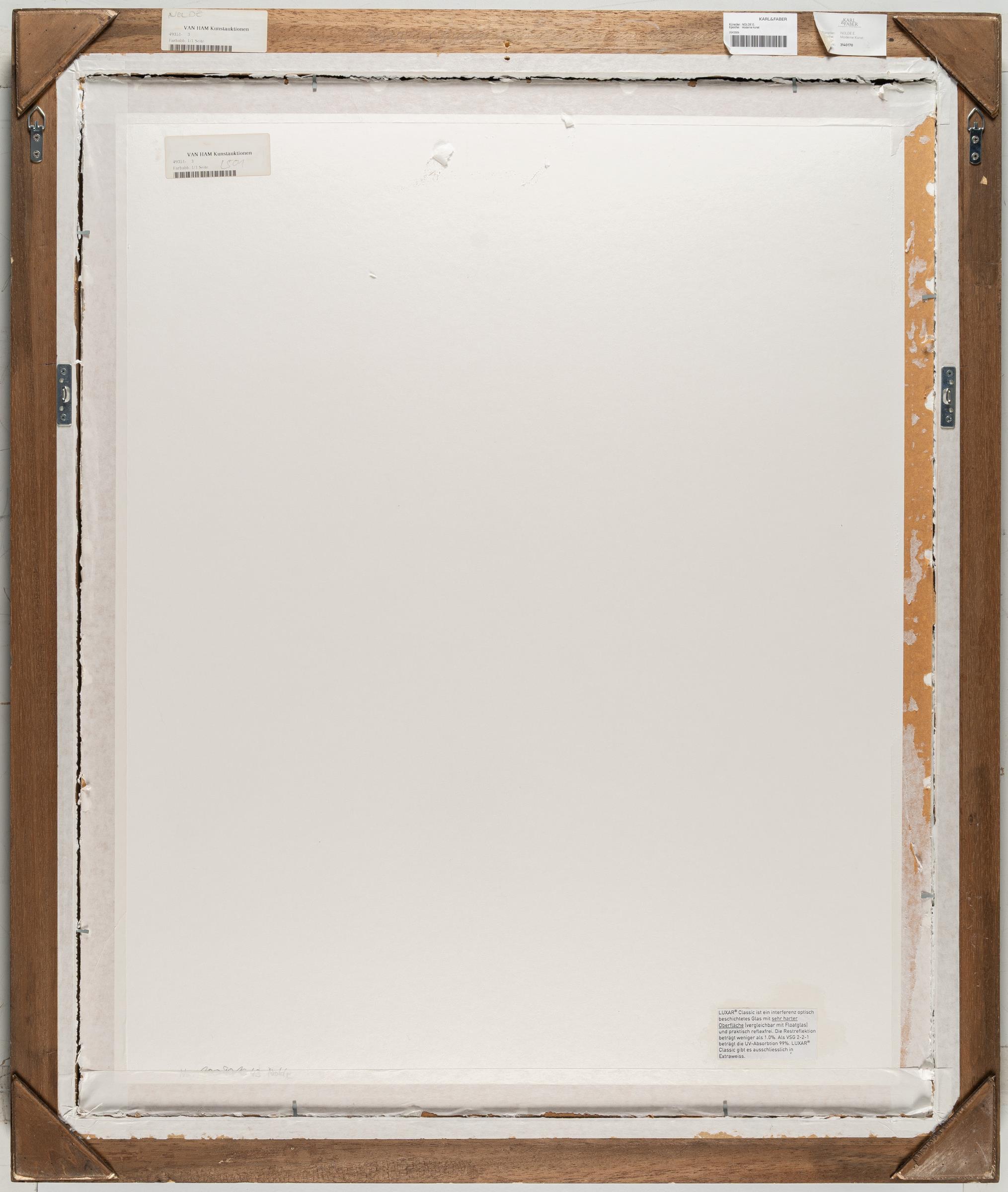 Noldes Farblithografien um 1913 stellen einen Höhepunkt der expressionistischen Druckgrafik dar. Die Lithografie-Technik erlaubt ihm einen spontanen Gestaltungsprozess, der der Aquarell- und Ölmalerei ähnelt und durch Verdünnung der Druckfarbe durchsichtige Zwischentöne und malerische Effekte ermöglicht. Auch die großformatige Lithografie „Händler“ zählt zu diesen besonderen Blättern. Bei dem hier angebotenen Exemplar handelt es sich zudem um einen der wenigen Probedrucke, die Nolde auf der Rückseite einer Schreibvorlagen druckt. In der folgenden Auflage erscheinen nur 45 nummerierte Exemplare. 1925/26 überdruckt der Künstler dann noch einmal einige Exemplare der Auflage sowie auch einige der Probeabzüge mit einem vierten Stein mit schrägen Farbflächen in verschiedenen Farbtönen. Daher hat unser nicht überdruckter Probedruck von 1913 großen Seltenheitswert.