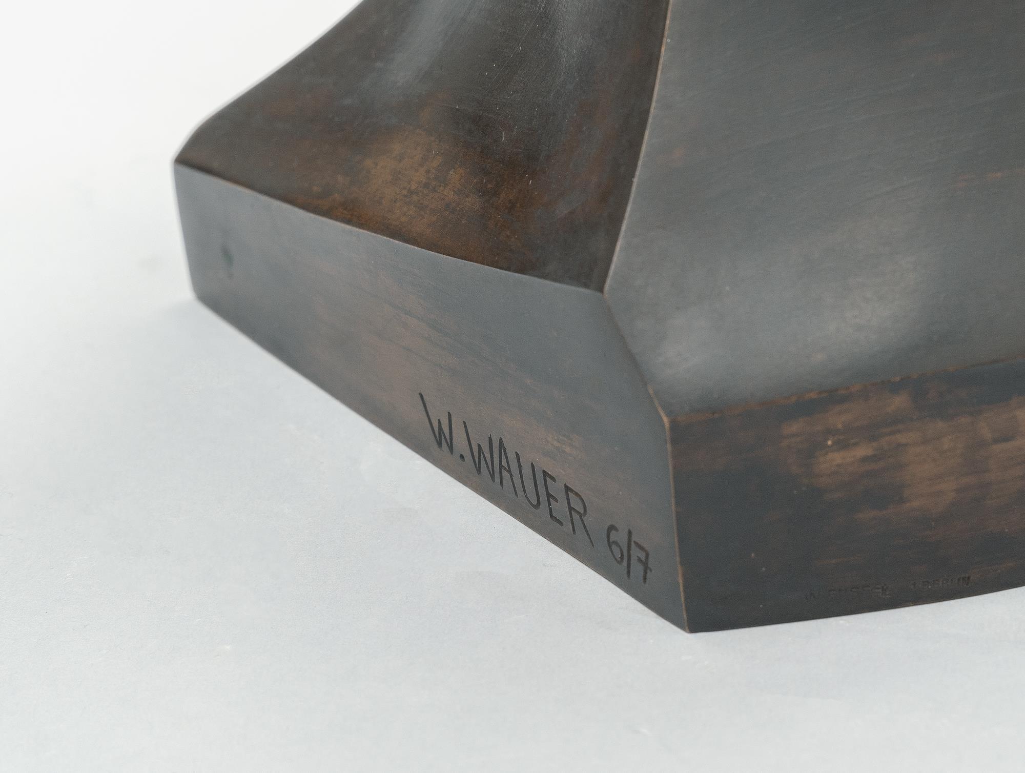 William Wauer ist ein wahrer kultureller Tausendsassa, der sich zeit seines Lebens immer wieder neuen Ideen in allen Bereichen der bildenden und darstellenden Kunst widmet und neue Herausforderungen sucht. Als Pastorensohn im Erzgebirge geboren, studiert er zunächst an den Kunstakademien in Dresden, Berlin und München, geht anschließend nach New York und San Francisco, studiert nach seiner Rückkehr noch einmal, diesmal Kunstgeschichte und Philosophie in Leipzig, und arbeitet als Feuilletonredakteur. Zwei Jahre lebt Wauer in Rom, zurück in Berlin ist er Herausgeber und Illustrator bei verschiedenen Zeitungen und Zeitschriften, arbeitet als künstlerischer Sachverständiger in den Reklameabteilungen bekannter Unternehmen wie Kupferberg, Kathreiner, Stollwerck und Odol. Zwischenzeitlich lebt er in Dresden, gründet eine kulturelle Wochenzeitschrift und schreibt Theaterkritiken. 1905, wieder in Berlin, wird er Regisseur am Deutschen Theater bei Max Reinhardt sowie an weiteren Theatern. 1911 folgt dann der Schritt vom Theater zum Film und Wauer ist als Regisseur – gemeinsam mit dem berühmten Schauspieler Albert Bassermann – maßgeblich an der Entwicklung des noch jungen Mediums beteiligt. In diesen stark vom Theater gerpägten Jahren porträtiert William Wauer den Schauspieler Albert Bassermann in einer stark bewegten Bronze dar. Die einzelnen Gesichtspartien sind in Flächen zerlegt, die in fast schon gratigen Kanten aufeinandertreffen. Wauers kubistisch-expressionistische Porträtbüsten von Herwarth Walden, seiner Frau Nell Walden und Albert Bassermann zählen heute zu den Ikonen der expressionistischen Skulptur.