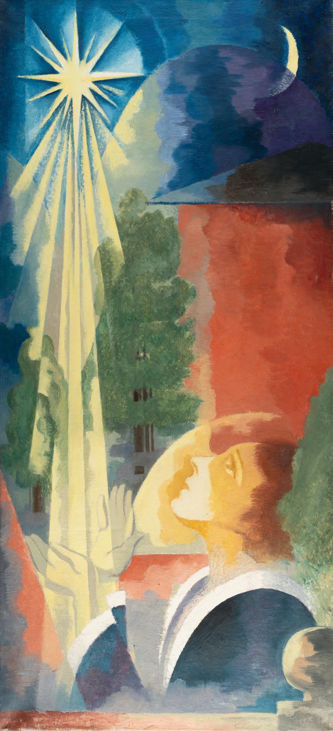 Die von flächigen, geometrischen Farbflächen geprägte Bildkomposition besticht durch starke Farbkontraste und eine transzendentale Stimmung.