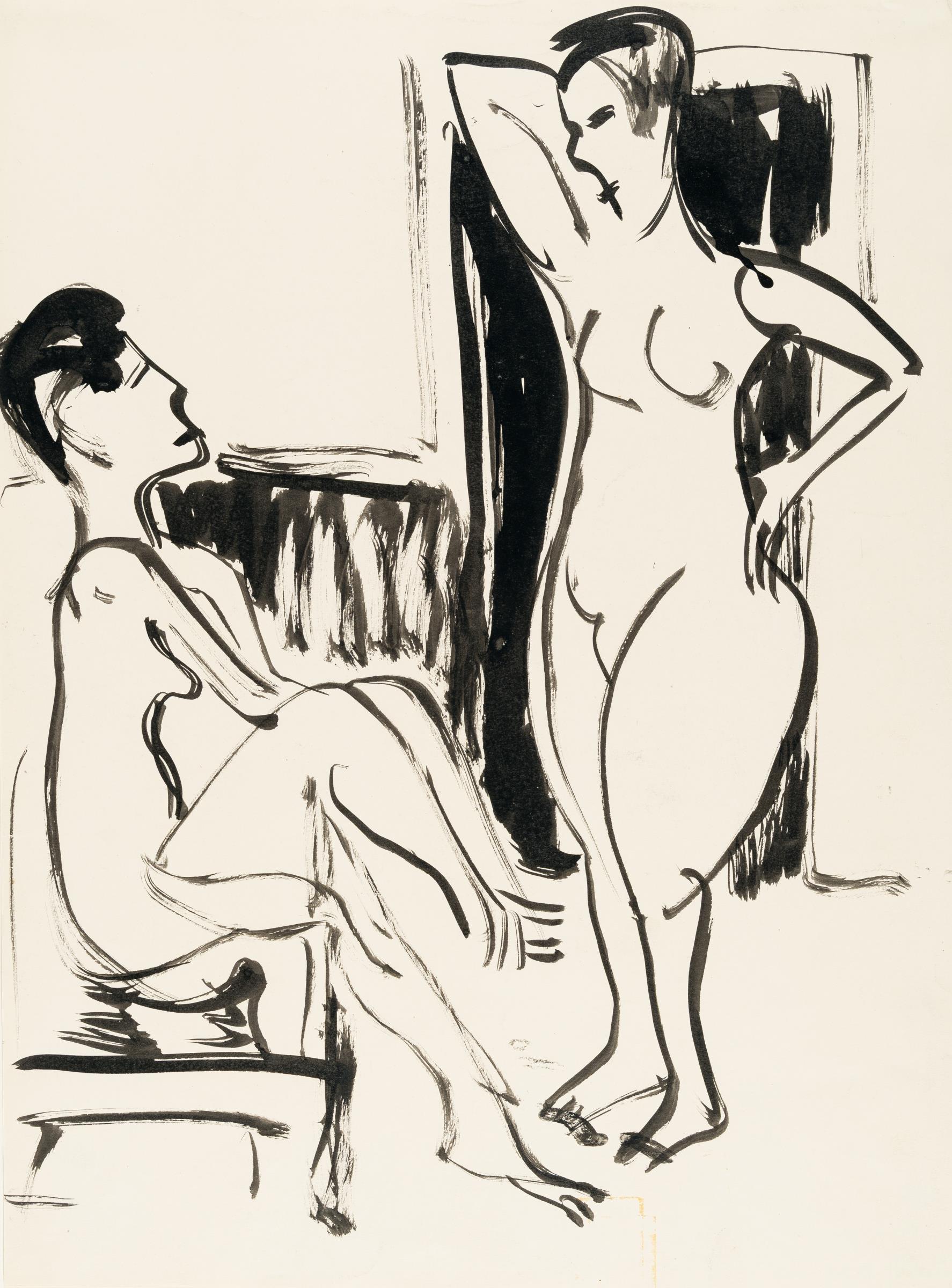 Die zwei nackten Frauenkörper sind hier zudem weniger detailliert ausgearbeitet, sondern werden stärker durch ihre Konturen definiert. Kirchner konzentriert sich darauf, das Wesentliche der menschlichen Figur mit wenigen, aber ausdrucksstarken Strichen einzufangen. Der umgebende Raum wird nicht illusionistisch, sondern als flächiger, abstrakter Hintergrund dargestellt. Die Figuren sind in ein flächiges Raumkonstrukt eingebunden, das die räumliche Tiefe reduziert.
