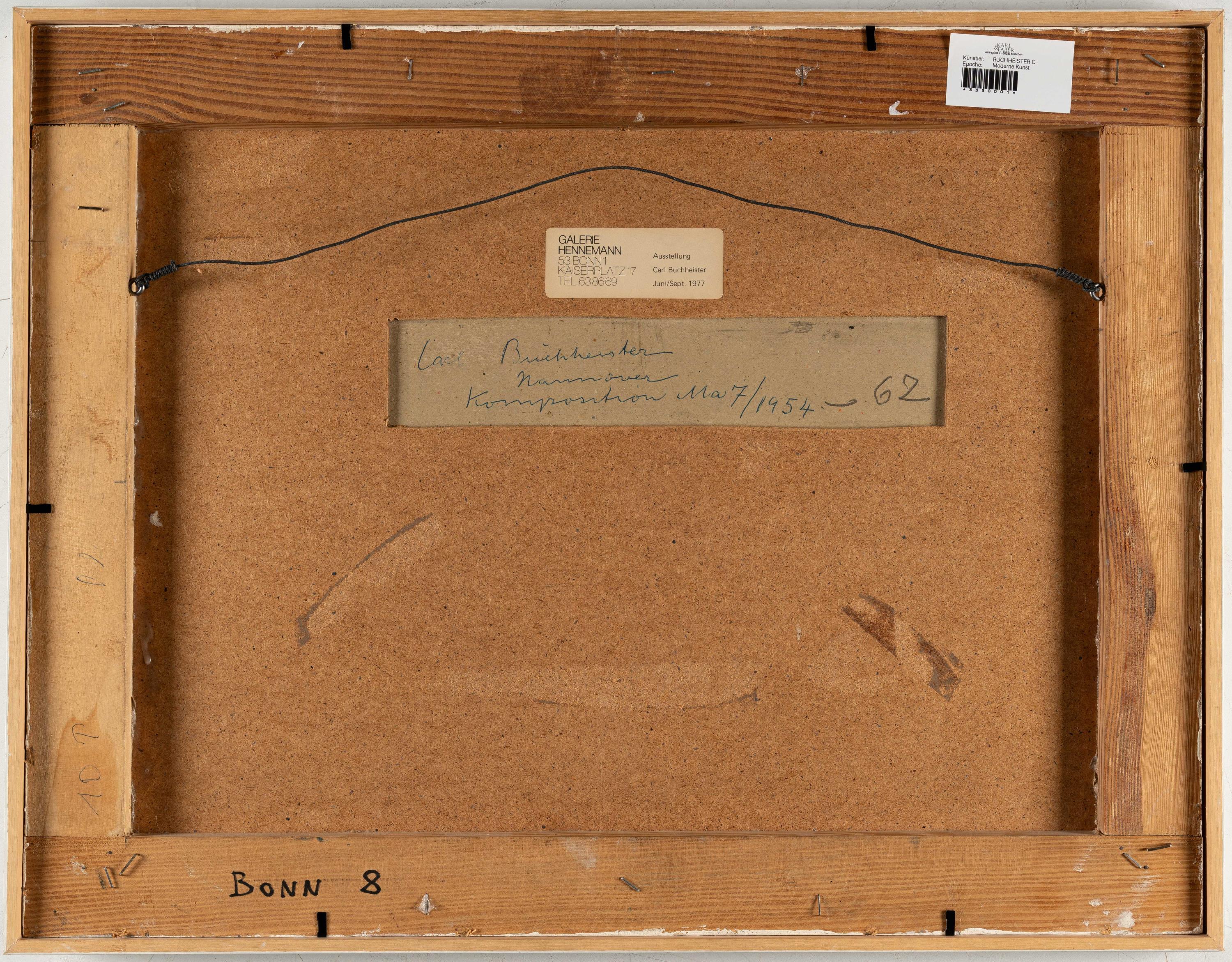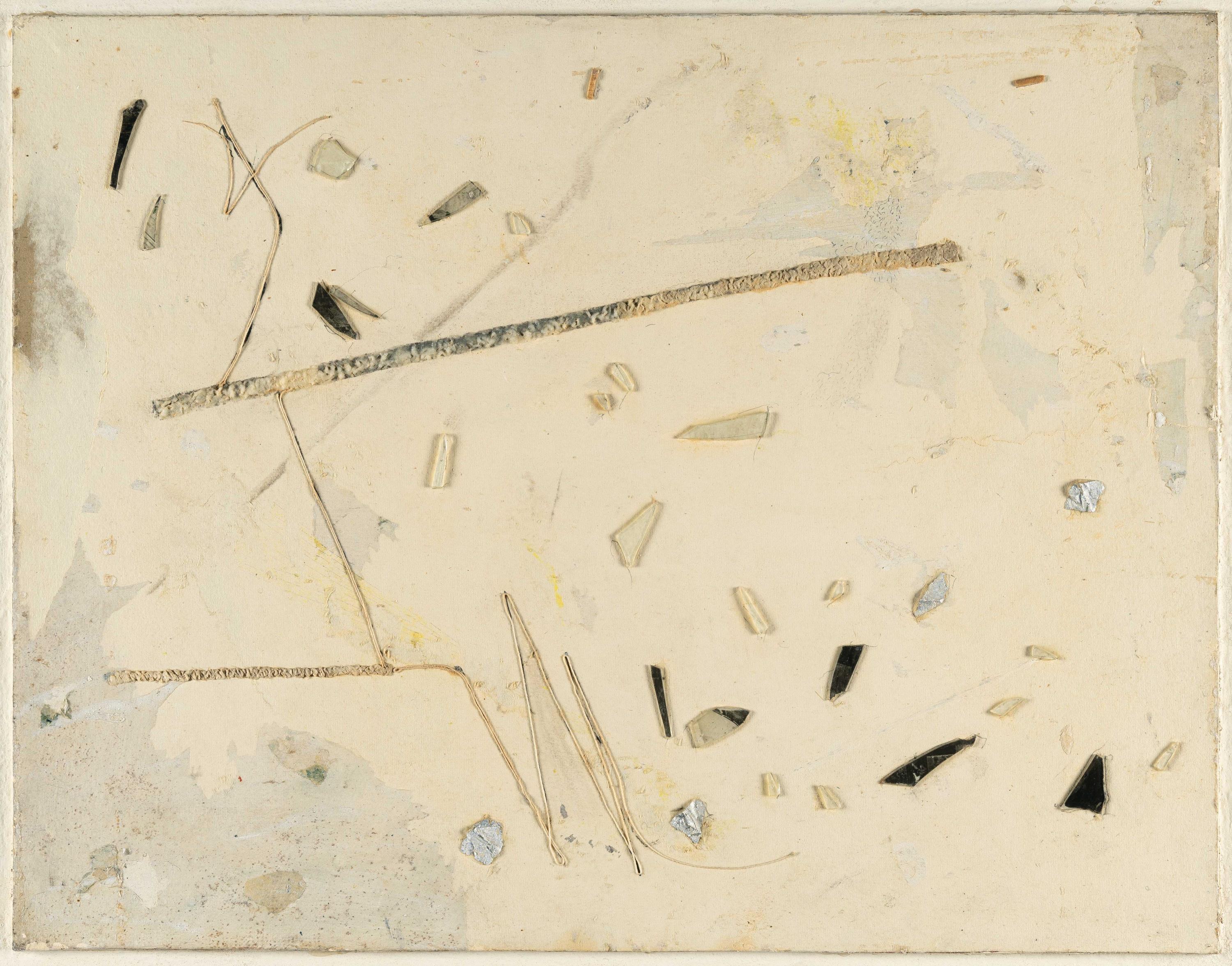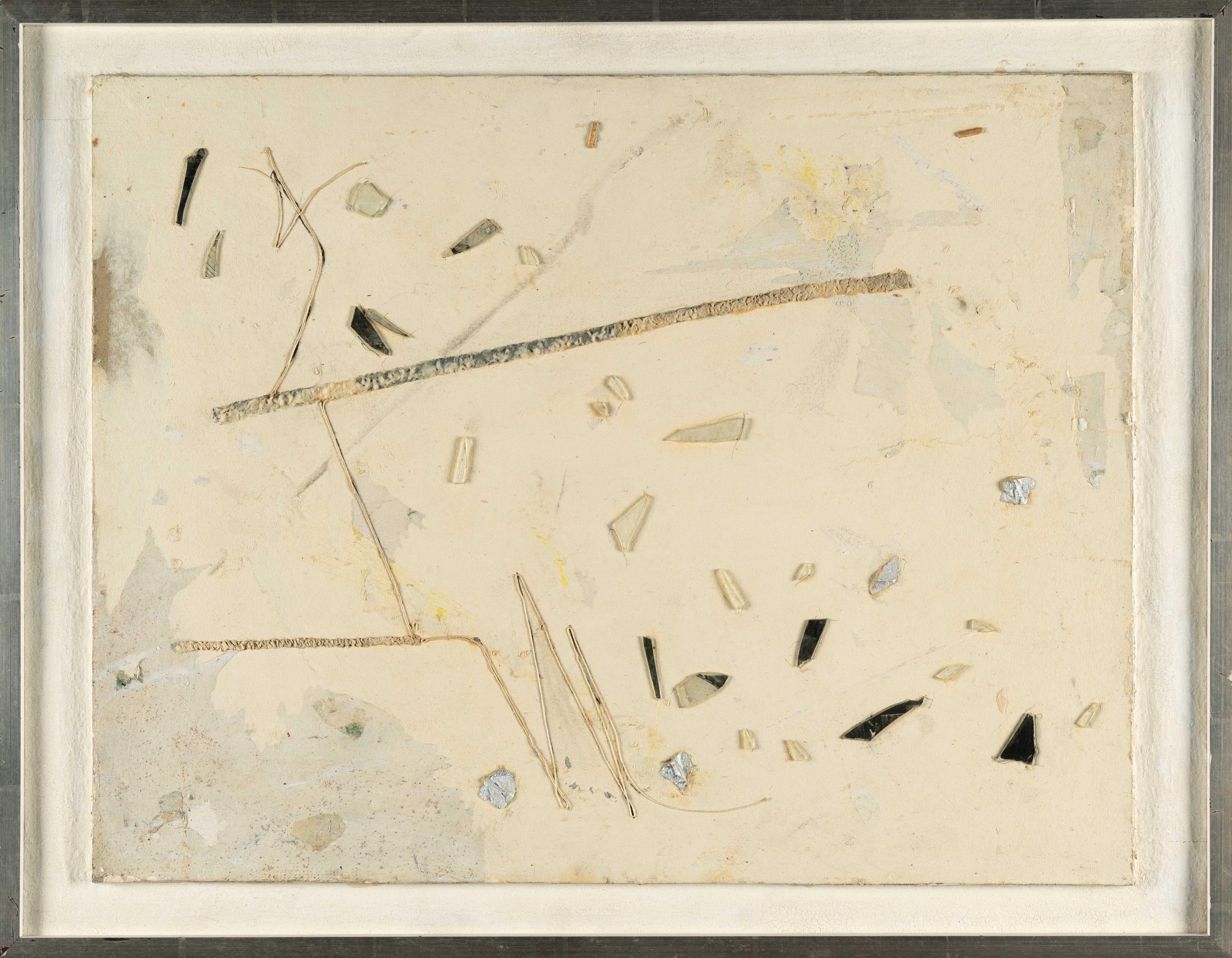 Mischtechnik und Collage mit Holz, Glassplittern, Silberpapier und Fäden auf Papier, auf Pappe aufgezogen. Über Hartfaserplatte auf werkimmanenten Holzleisten montiert. 1954/1962. Ca. 39 x 50 cm (Gesamtmaße ca. 45 x 58 cm). Verso signiert, datiert „1954_62“, betitelt und bezeichnet.
