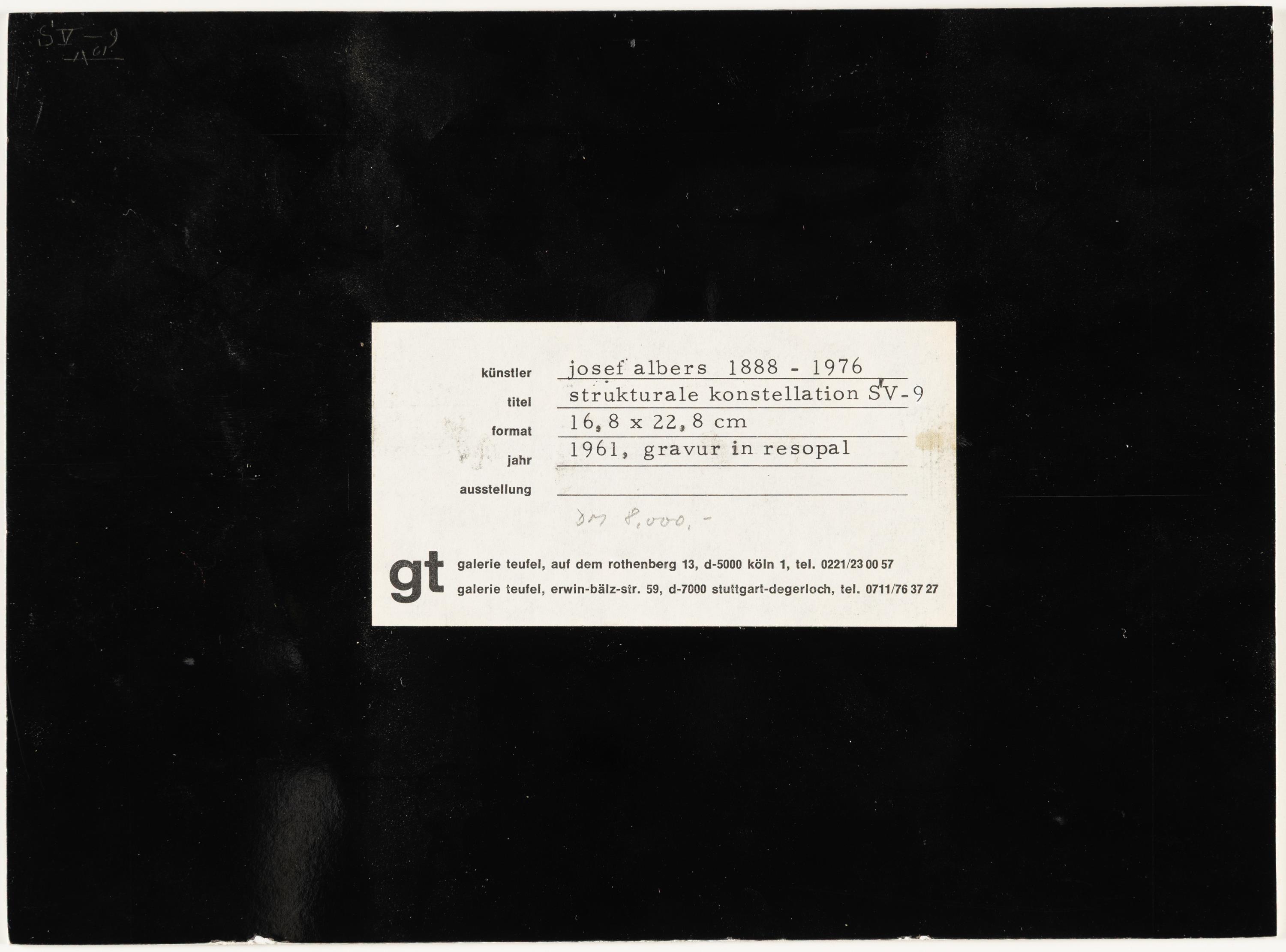 Josef Albers Structural Constellation „SV-9“ Vorherige Losübersicht Weiter Lot ID Los 803 Künstlername Josef Albers Zusätzliche Beschreibung Multiple. Maschinengraviertes Kunststofflaminat (Resopal). (19)61. Ca. 17 x 23 cm. Ein Exemplar außerhalb der nummerierten Auflage von 100, von der wahrscheinlich weniger als 30 gefertigt wurden. Verso monogrammiert, datiert und betitelt. Lebensdaten (1888 Bottrop - New Haven 1976) Technik Skulptur/Objekt/Multiple Provenienz Privatsammlung, Baden-Württemberg. Add favourite PDF herunterladen Teilen Beschreibung Wir danken Jeanette Redensek, The Josef and Albers Foundation, Connecticut für die freundlichen Hinweise bei der Katalogisierung.