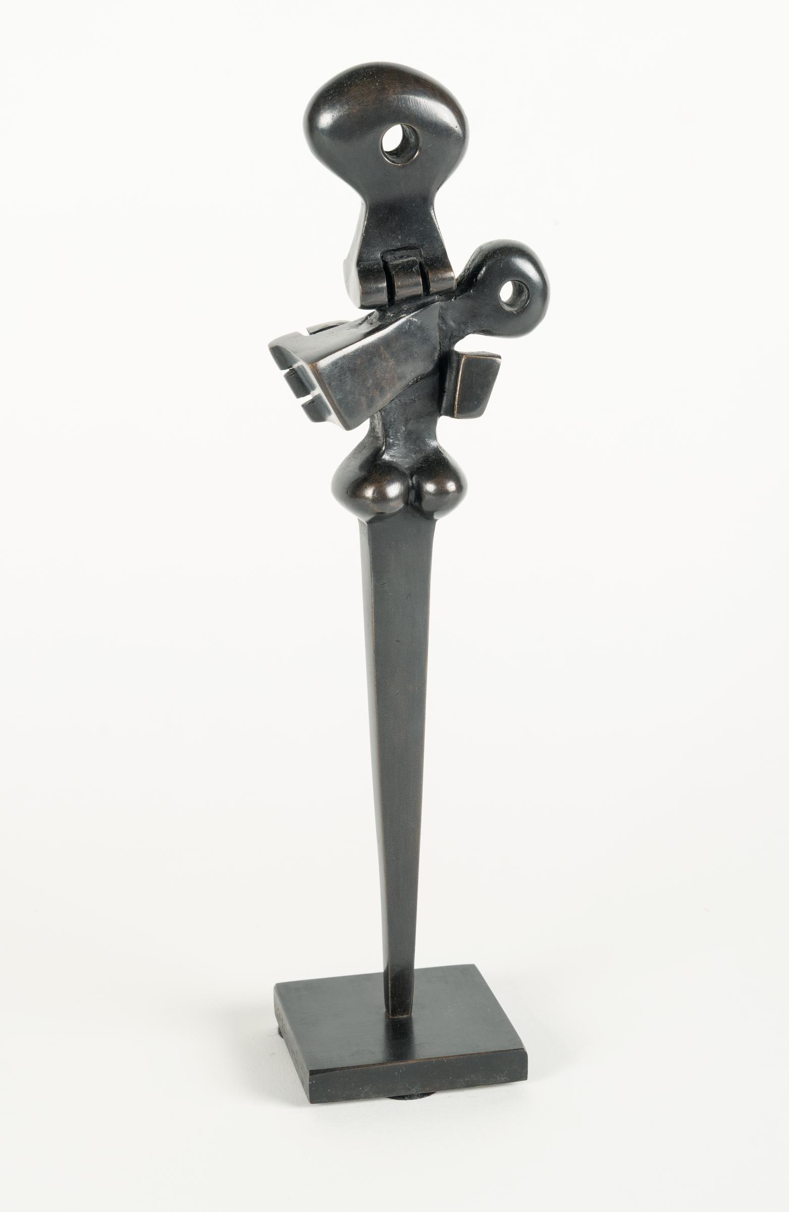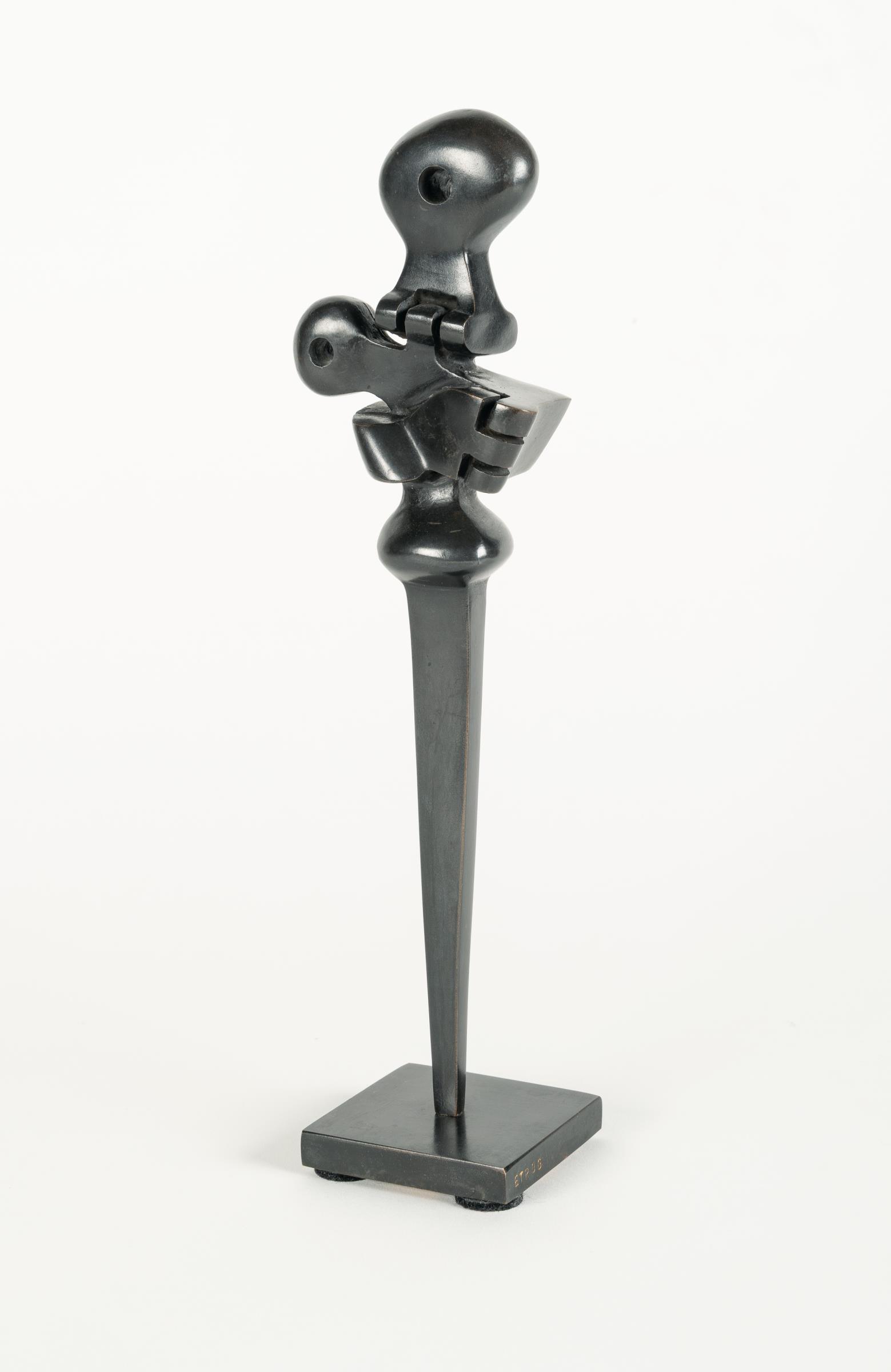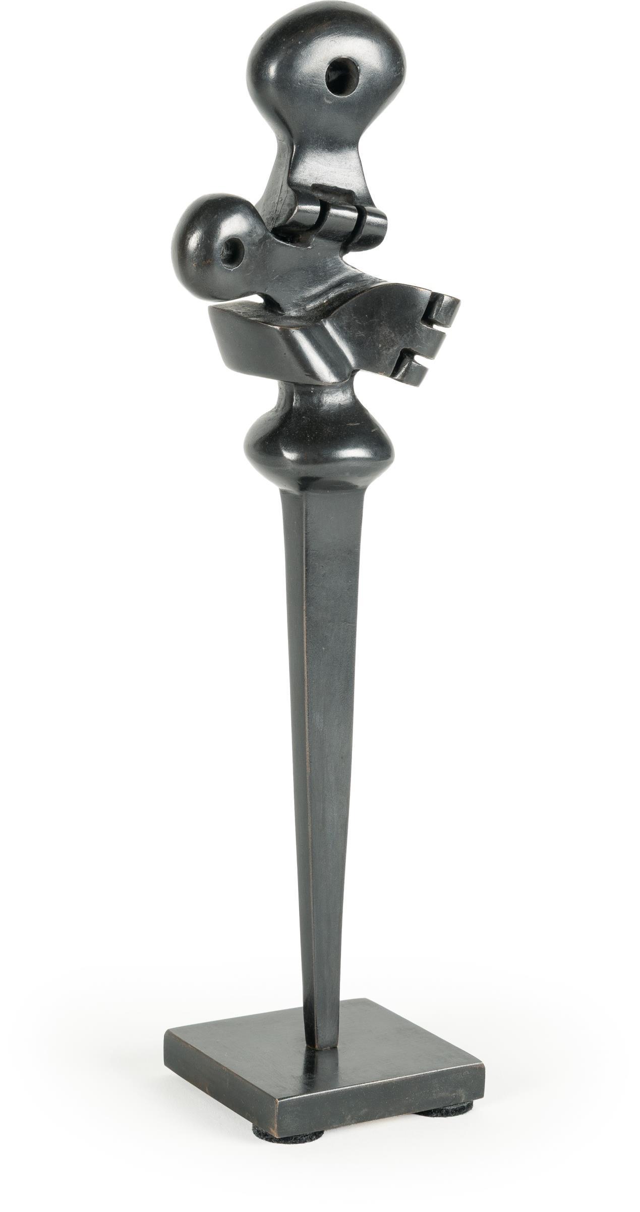 In der vorliegenden Bronze Mother and Child von 1975 entfaltet Sorel Etrog eine seiner zentralen Bildideen: die Verbindung zweier Figuren – Mutter und Kind – in einer fast verschmelzenden, organisch mechanischen Form. Die schlanke, vertikal orientierte Bronze mit schwarzer Patina reduziert das Motiv auf ein komprimiertes, bewegungsorientiertes Volumen. Der horizontale Abstand zwischen den Figuren scheint aufgehoben, stattdessen wirken sie wie eine gemeinsam sich entfaltende Gestalt, deren Konturen im Material verankert sind.