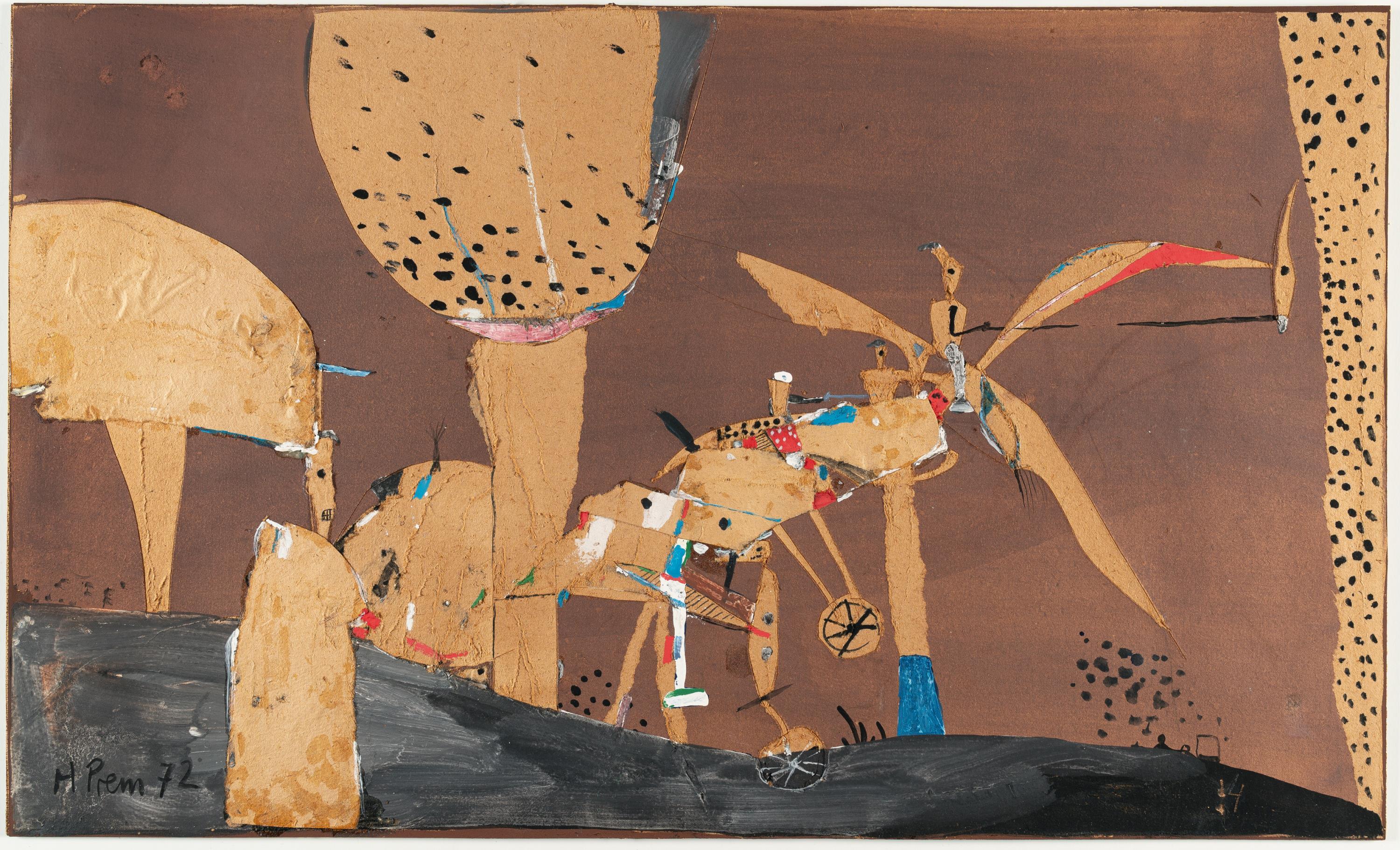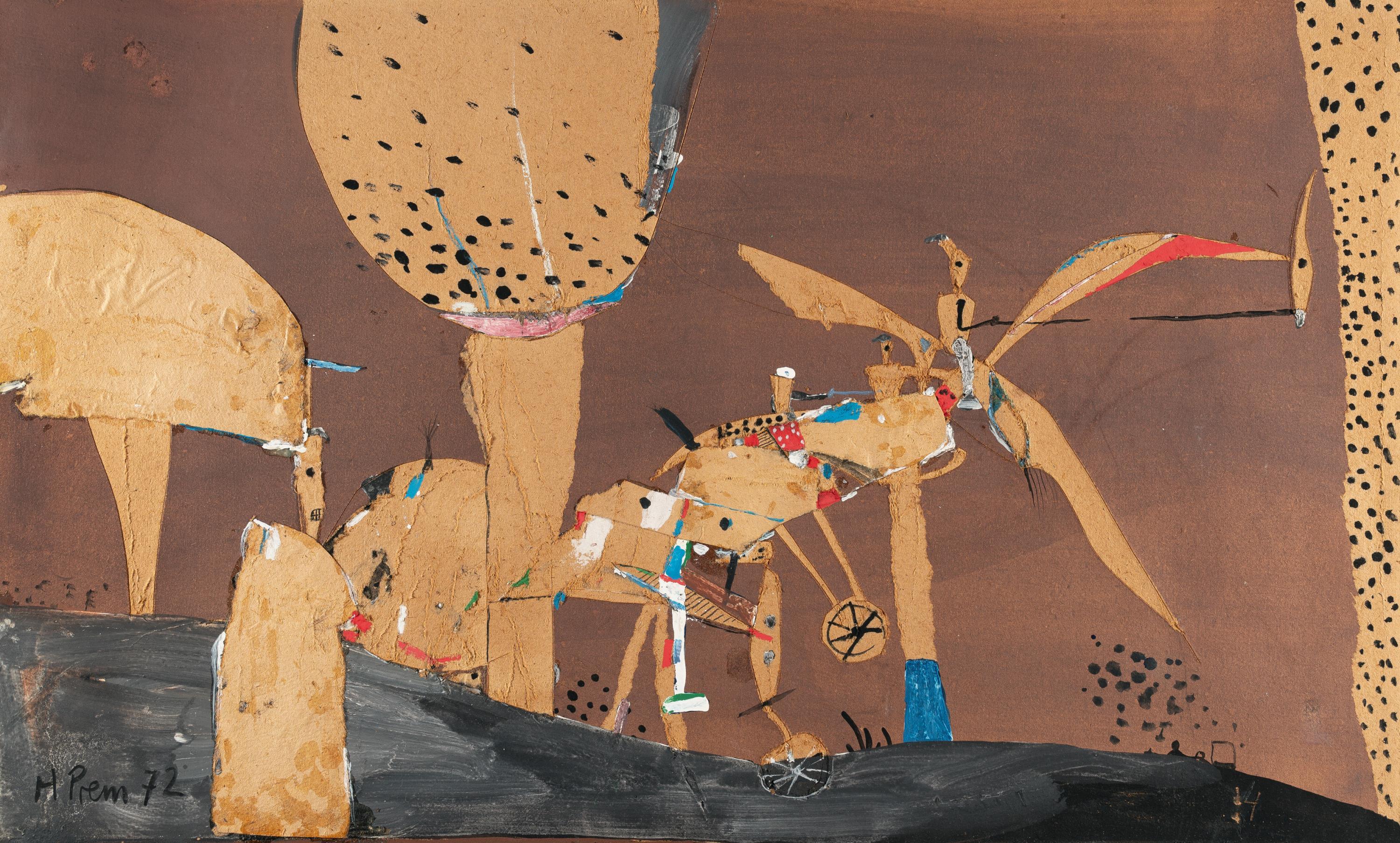 Zusätzliche Beschreibung Mischtechnik mit Gouache auf Lederpappe, collagiert. (19)72. Ca. 47 x 78 cm. Signiert und datiert unten rechts. Verso betitelt.