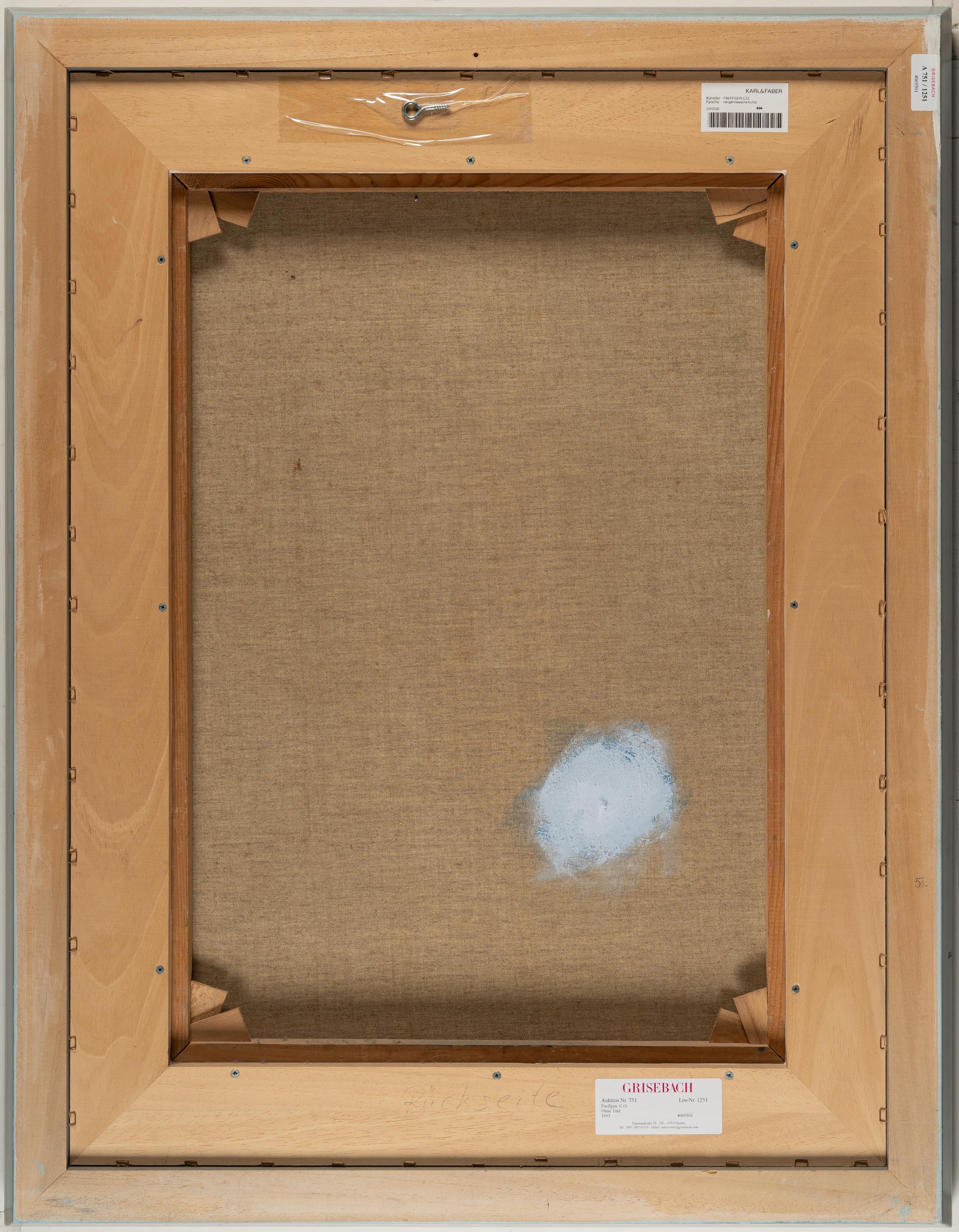 Fest im Schattenfugenrahmen montiert, zur Katalogisierung nicht ausgerahmt. Unten mittig leicht angeschmutzt sowie insgesamt mit vereinzelten oberflächlichen Fleckchen und winzigen Anhaftungen. Haarfeiner horizontaler Riss in der Farbschicht oben mittig, nicht störend. Einige schwache Feuchtigkeitsfleckchen unter UV sichtbar. Ansonsten in gutem, farbfrischem Zustand.