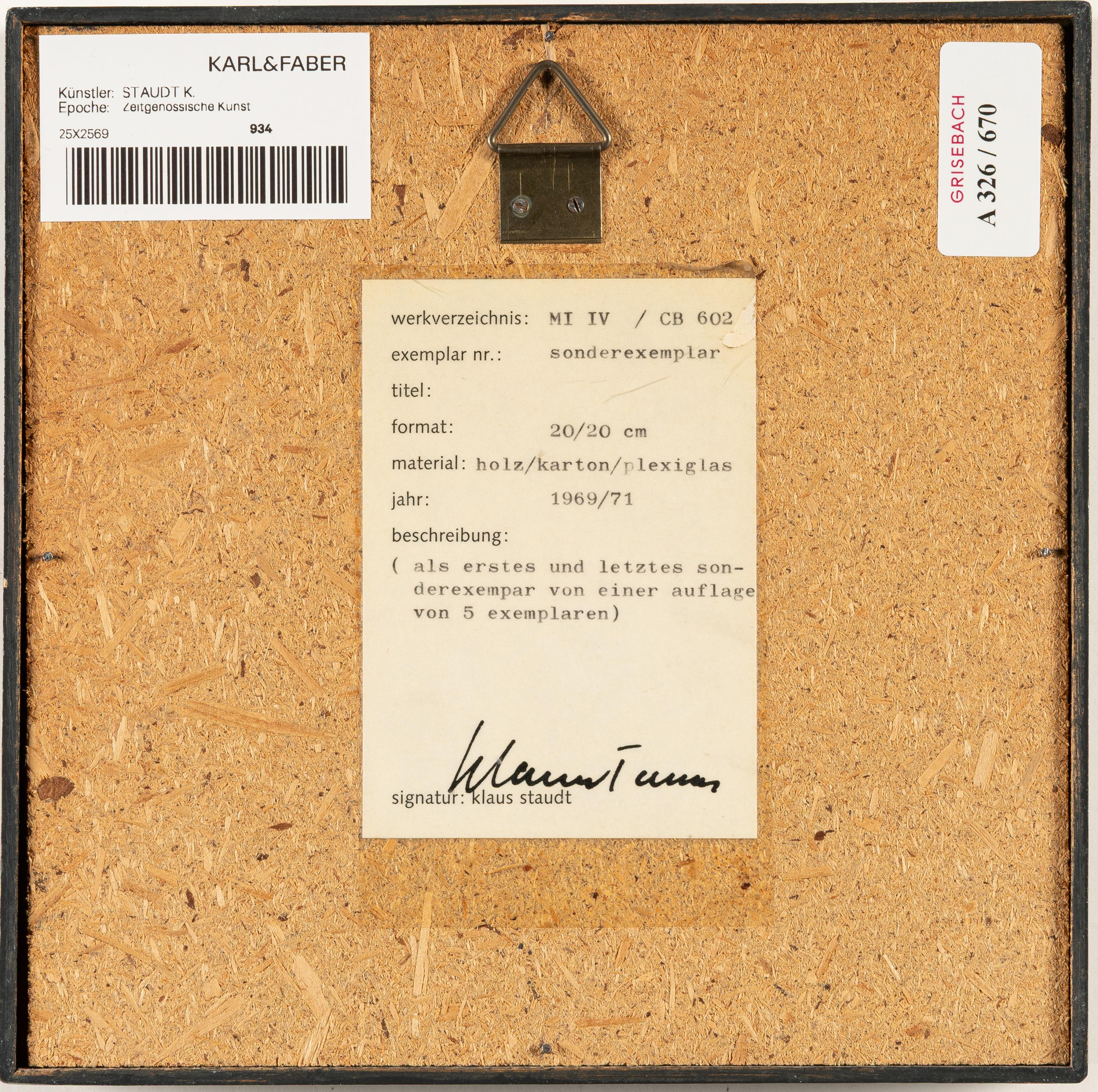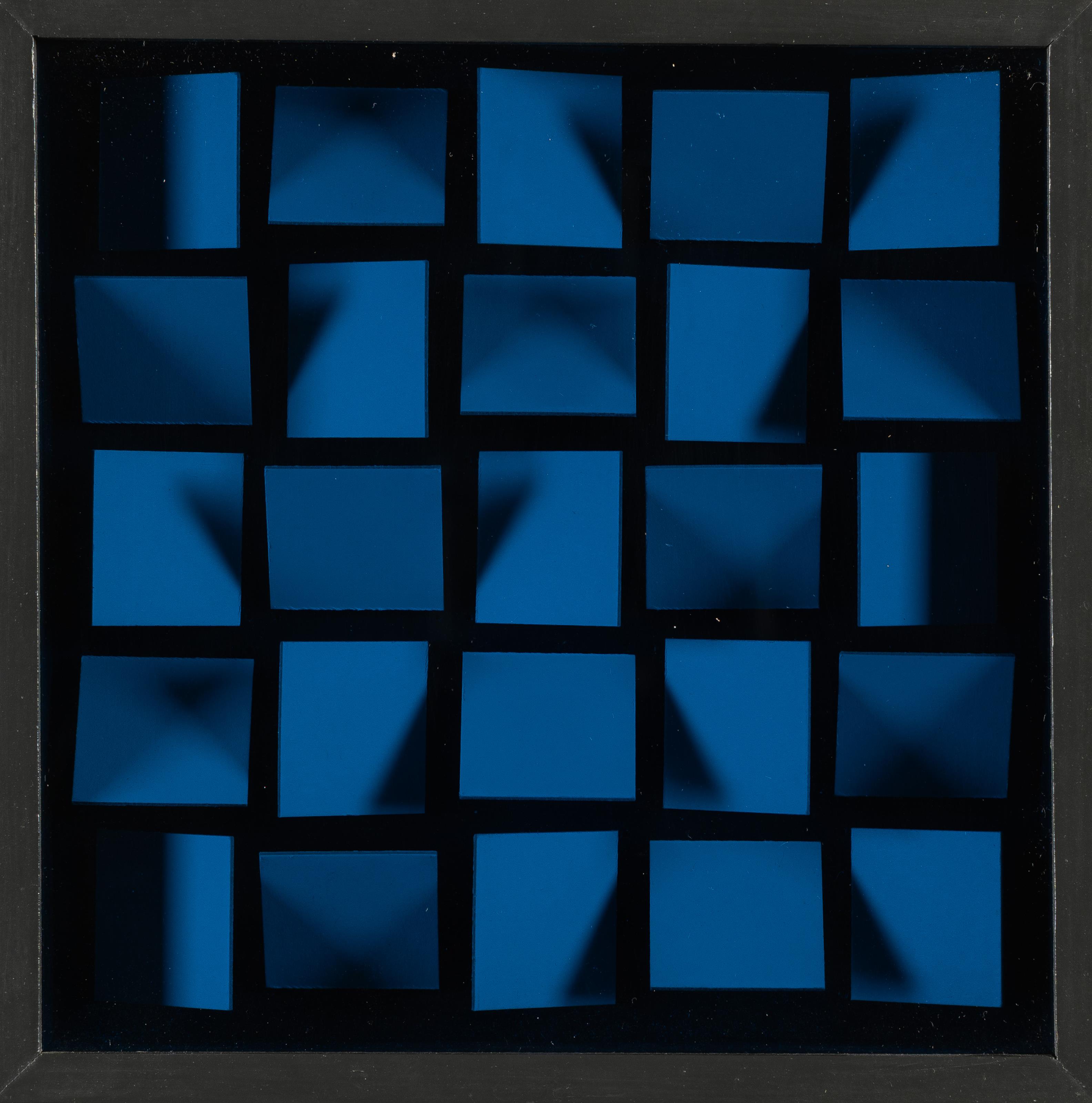 Karton weiß, Plexiglas transparent blau, in O.-Holz-Objektrahmen. 1969/71. Gesamt ca. 20,5 x 20,5 x 4 cm. Einziges Sonderexemplar außerhalb der Auflage von 5 Exemplaren. Verso auf O.-Etikett signiert sowie typografisch datiert, betitelt und bezeichnet.