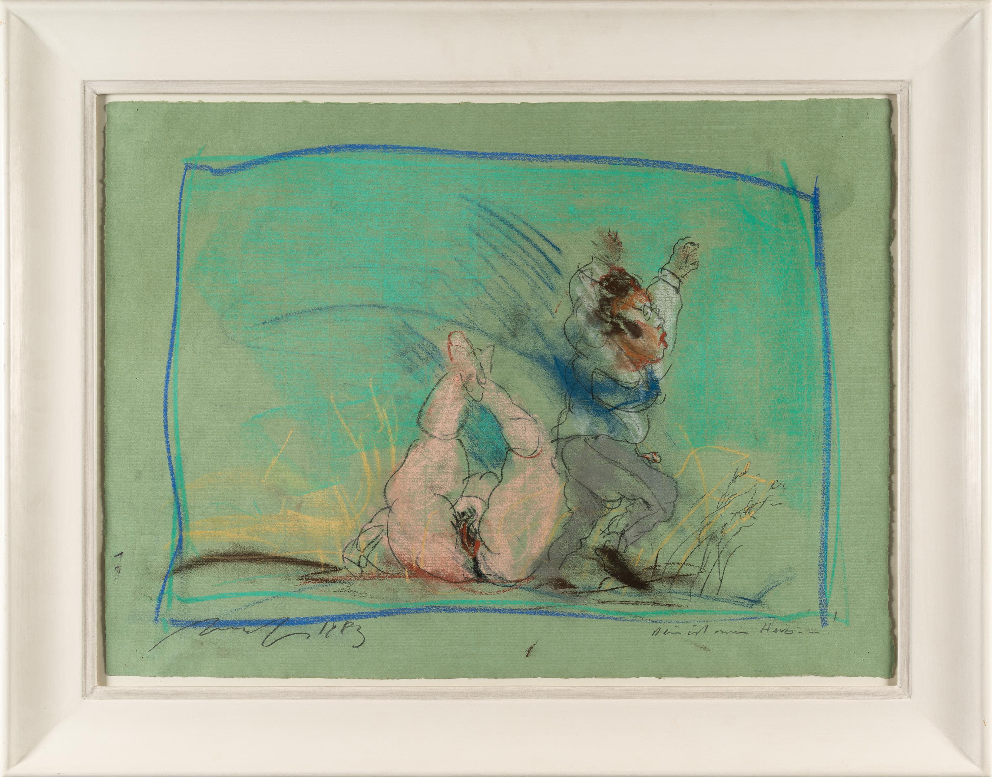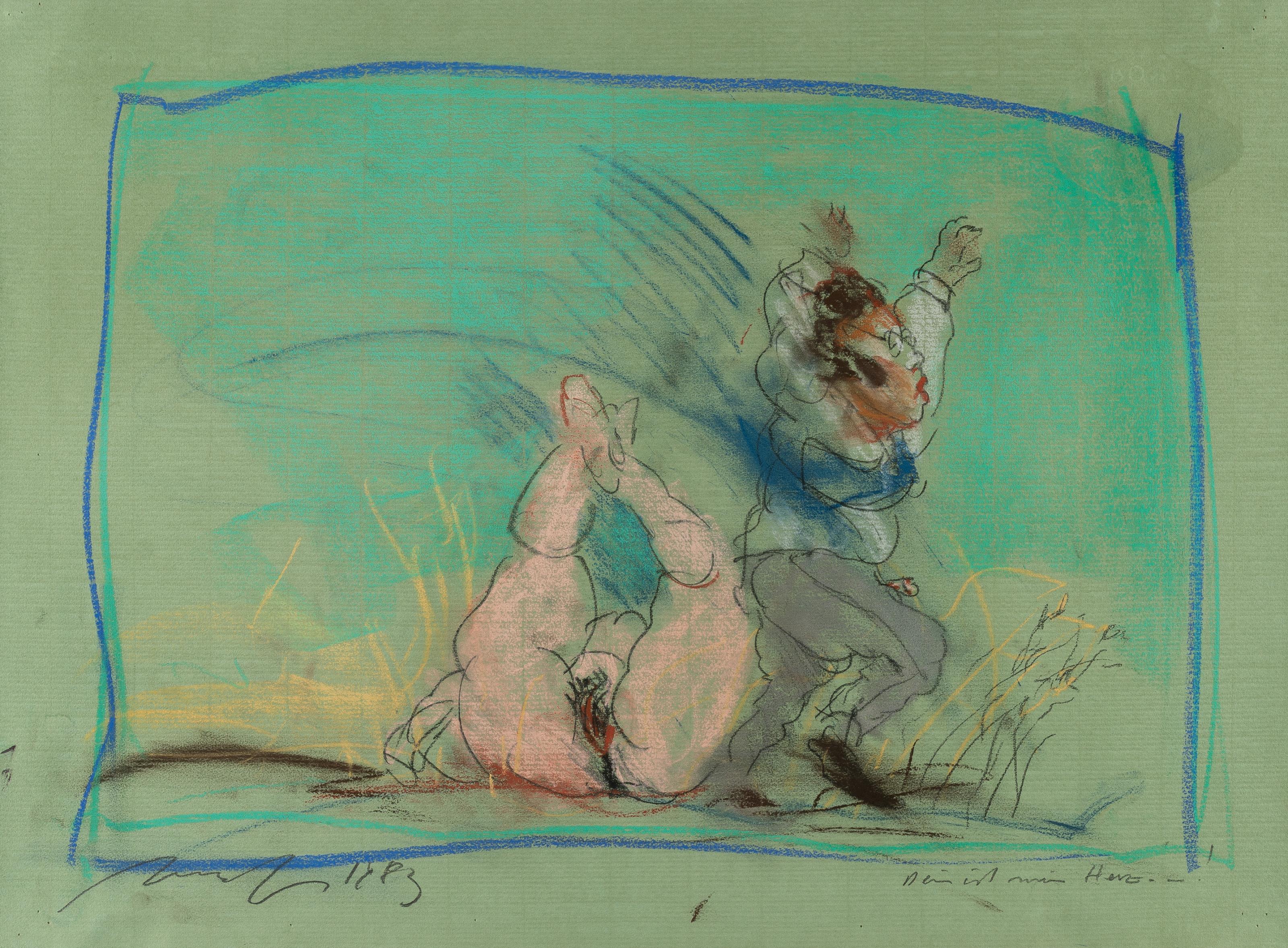 Farbige Kreide auf grünem Bütten. 1983. Ca. 48,5 x 66,5 cm. Signiert und datiert unten links sowie betitelt unten rechts.