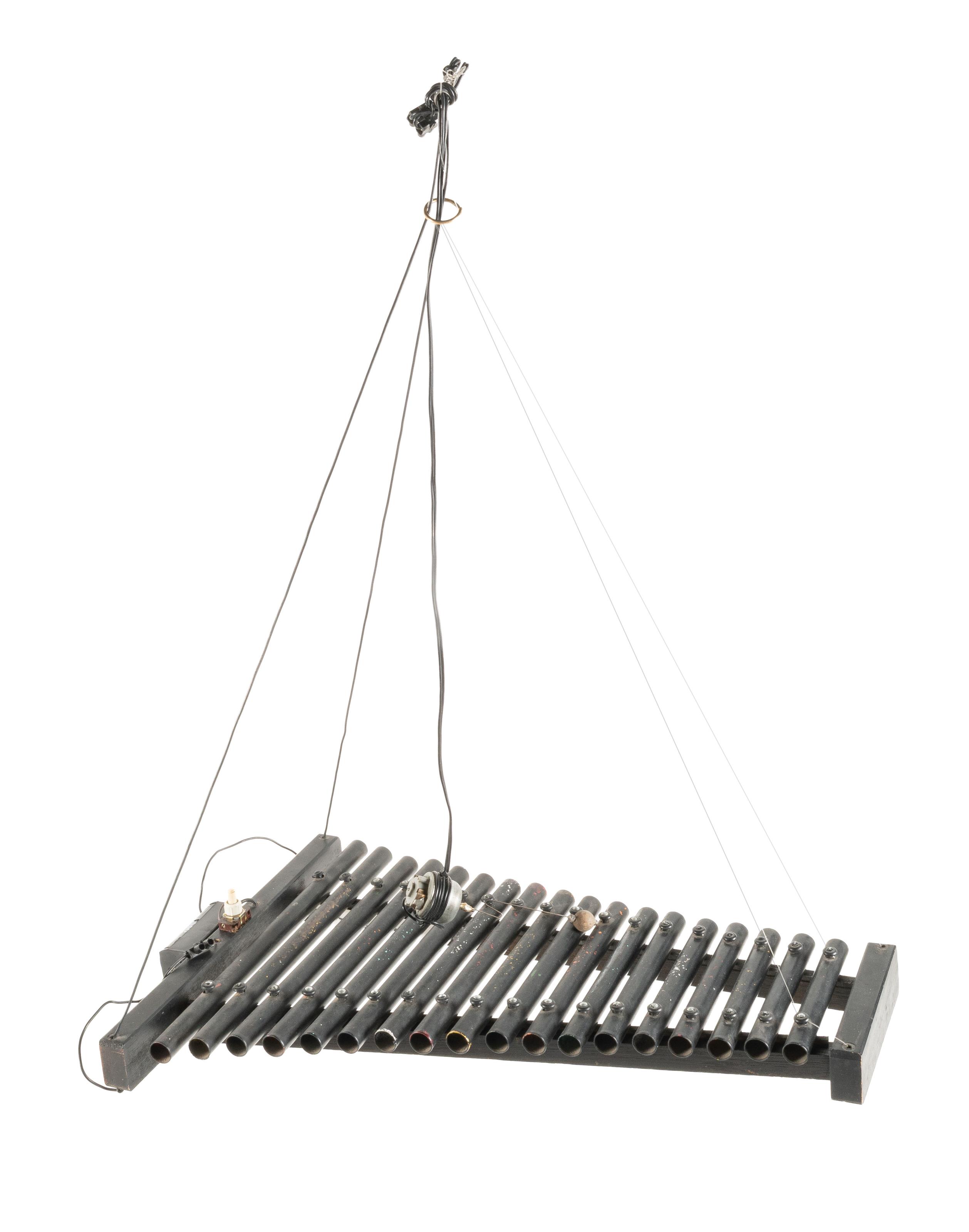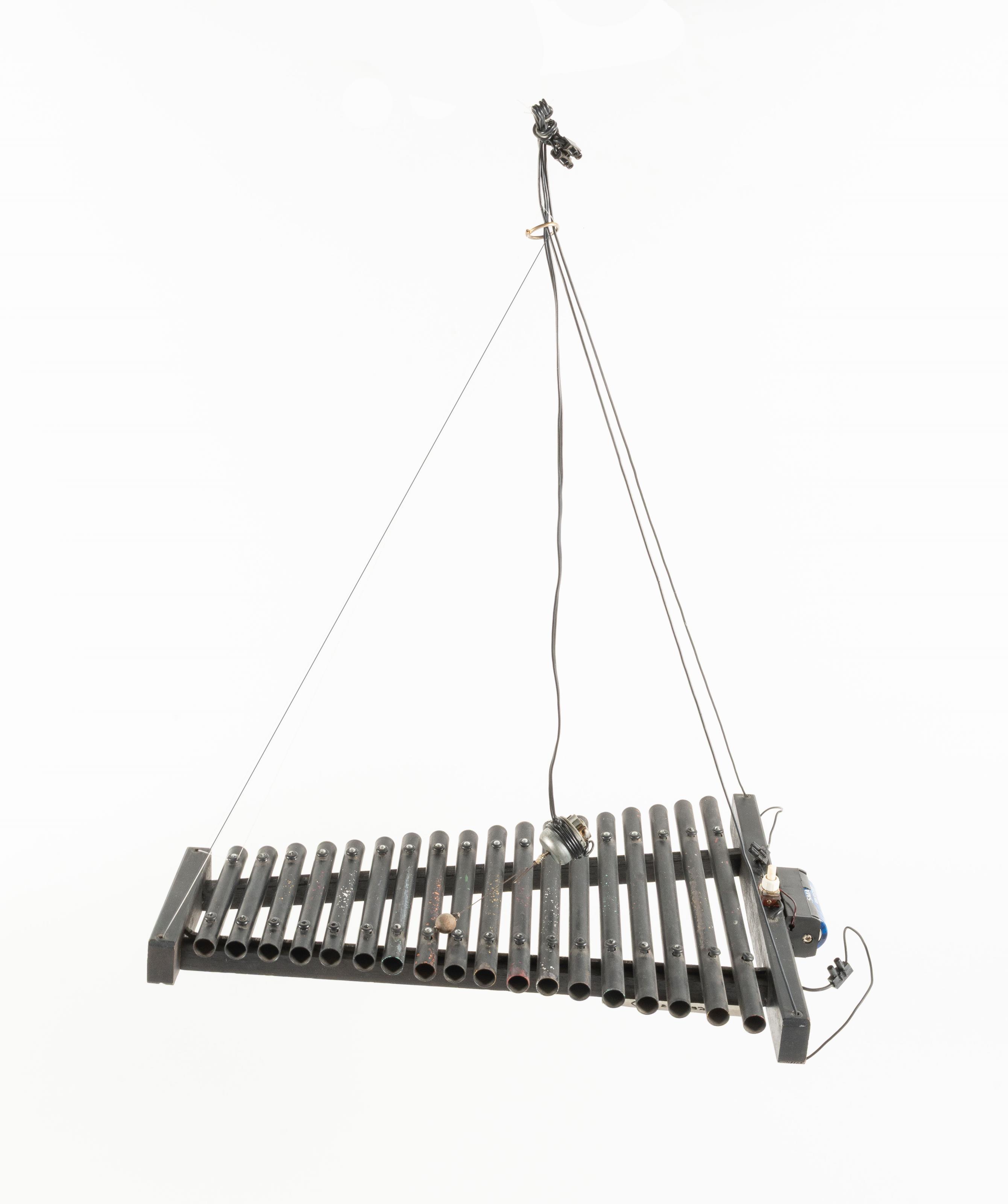 Klangskulptur. Xylophon, teils lackiert, Draht, Kabel, batteriebetriebener Elektromotor, Metallring, Holzperle. (Vor 1974). Ca. 63 x 49 x 30,5 cm. Funktionsfähig.