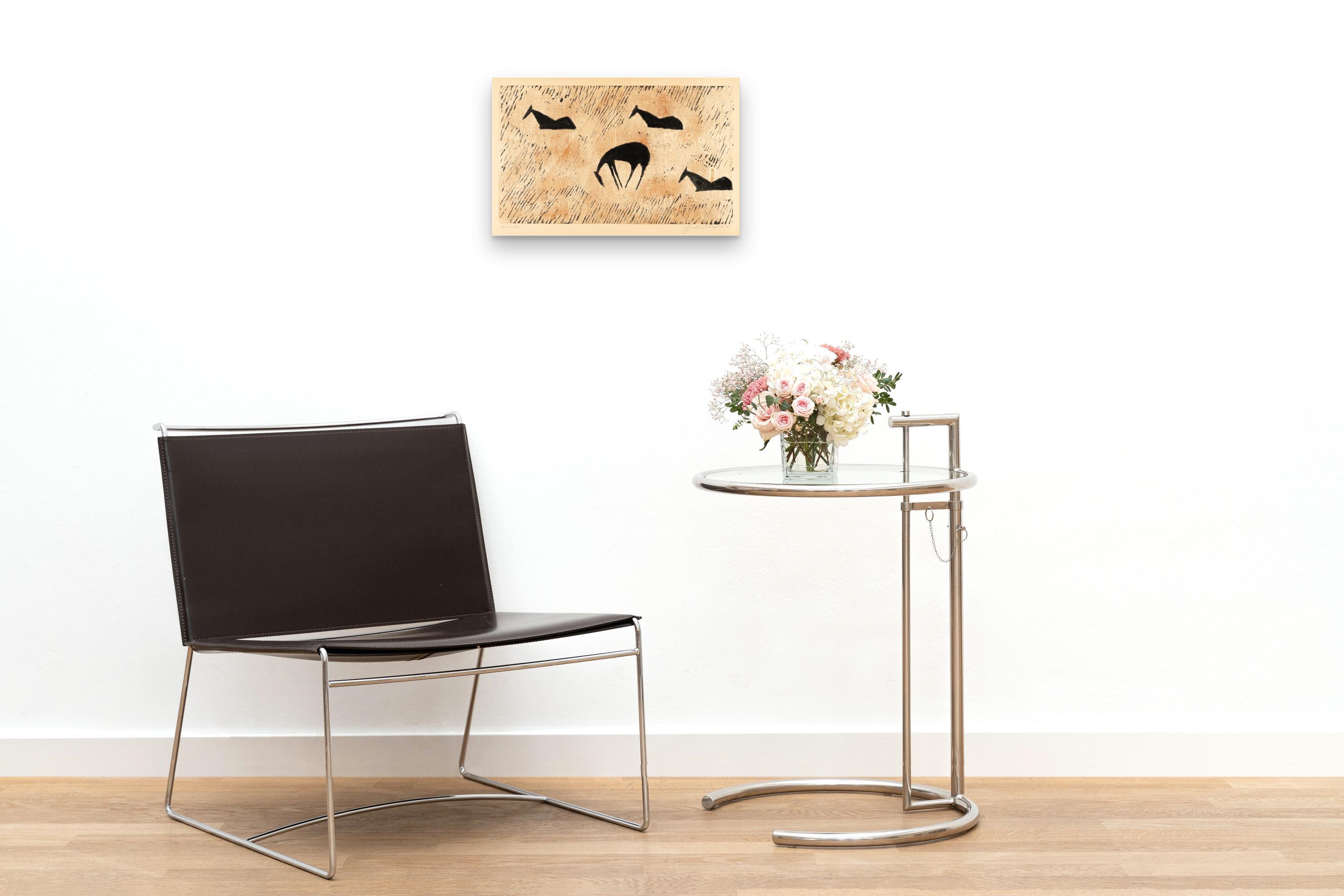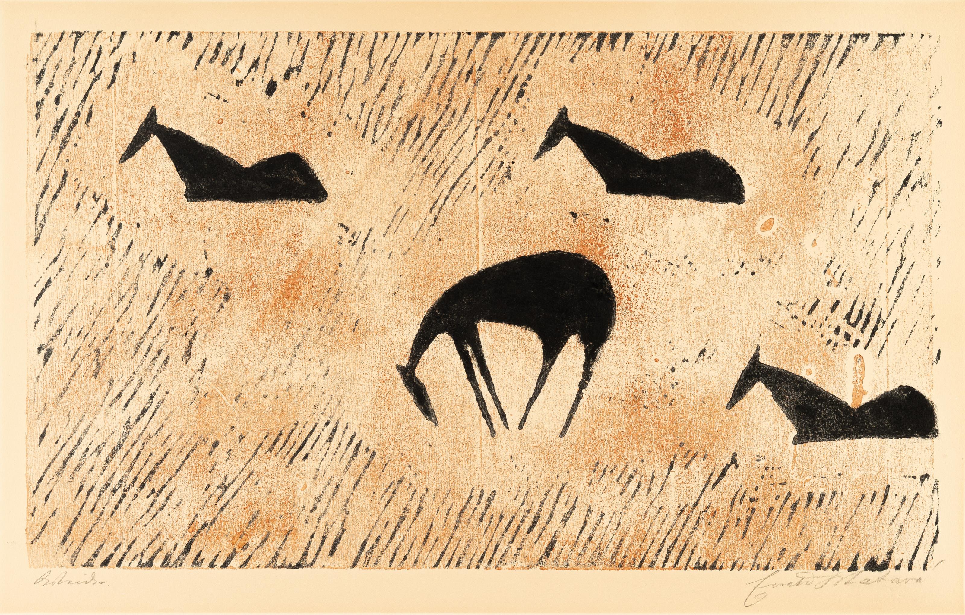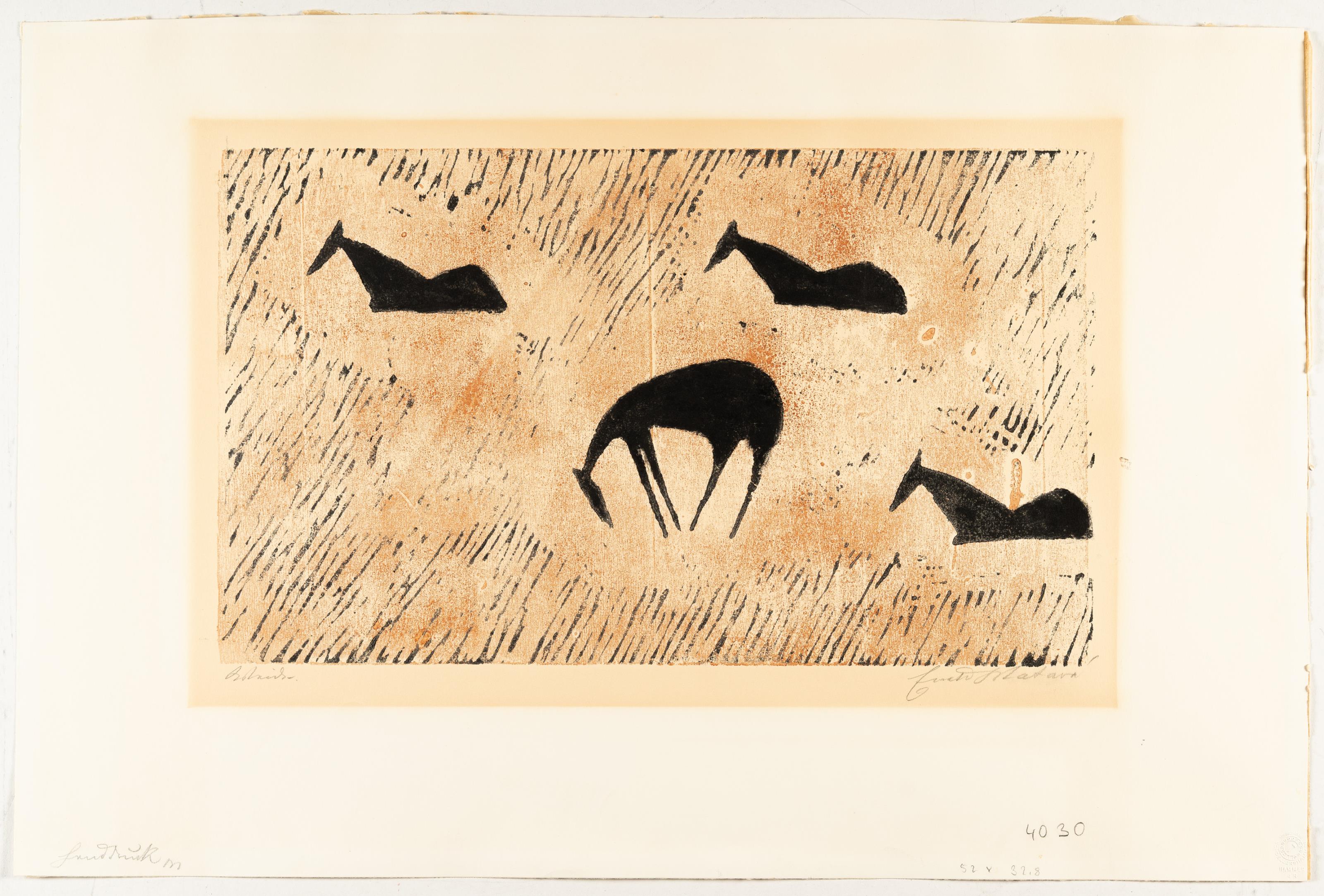 Farbiger Holzschnitt auf Velin von Schoellershammer. (1935). Ca. 29 x 48,5 cm (Blattgröße ca. 47,5 x 71,5 cm). Auflagenhöhe unbekannt. Signiert unter der Darstellung rechts, betitlet "Weide" (?) unter der Darstellung links sowie bezeichnet "Handdruck m" unten links (alles in Sütterlinschrift).