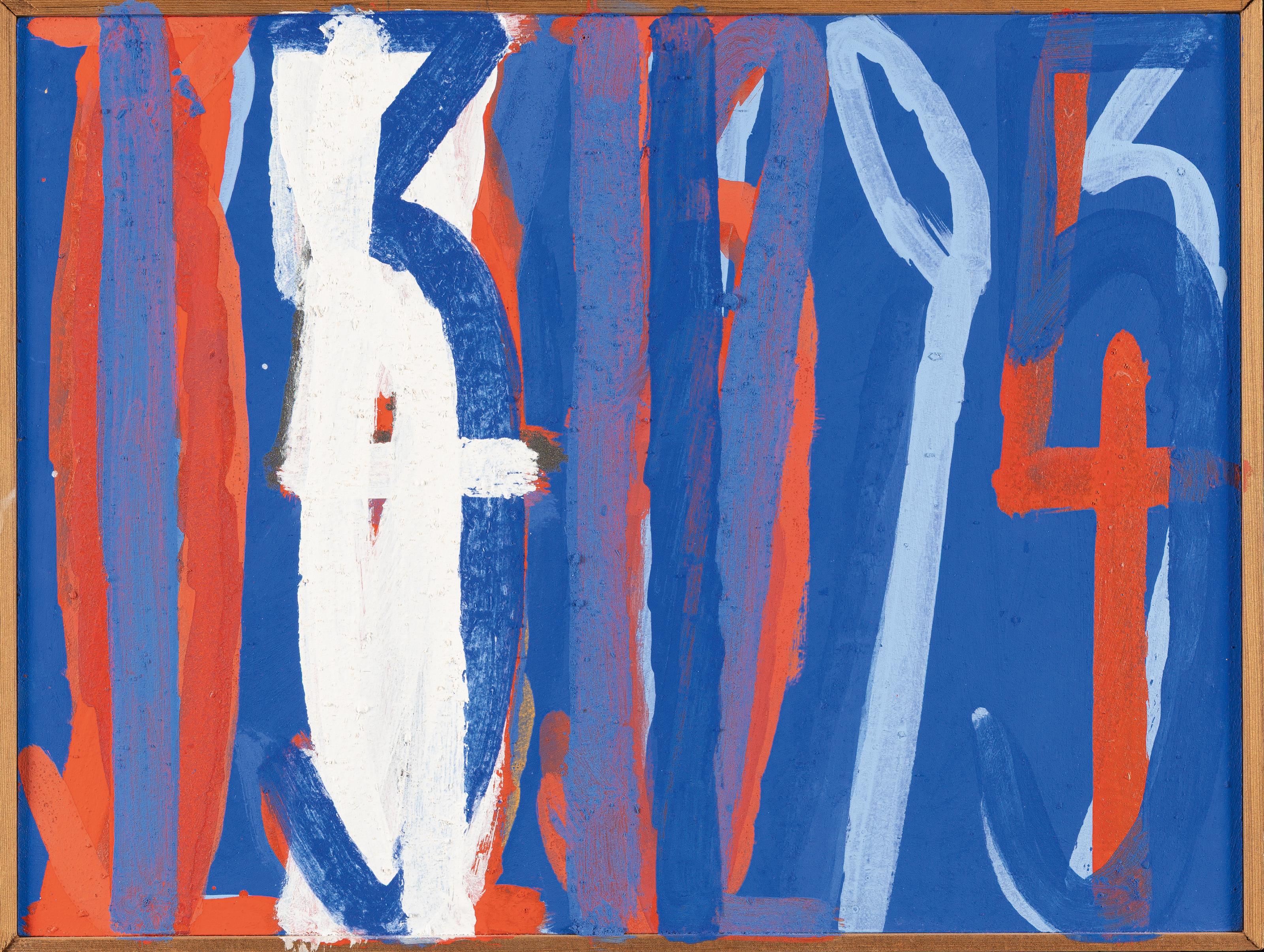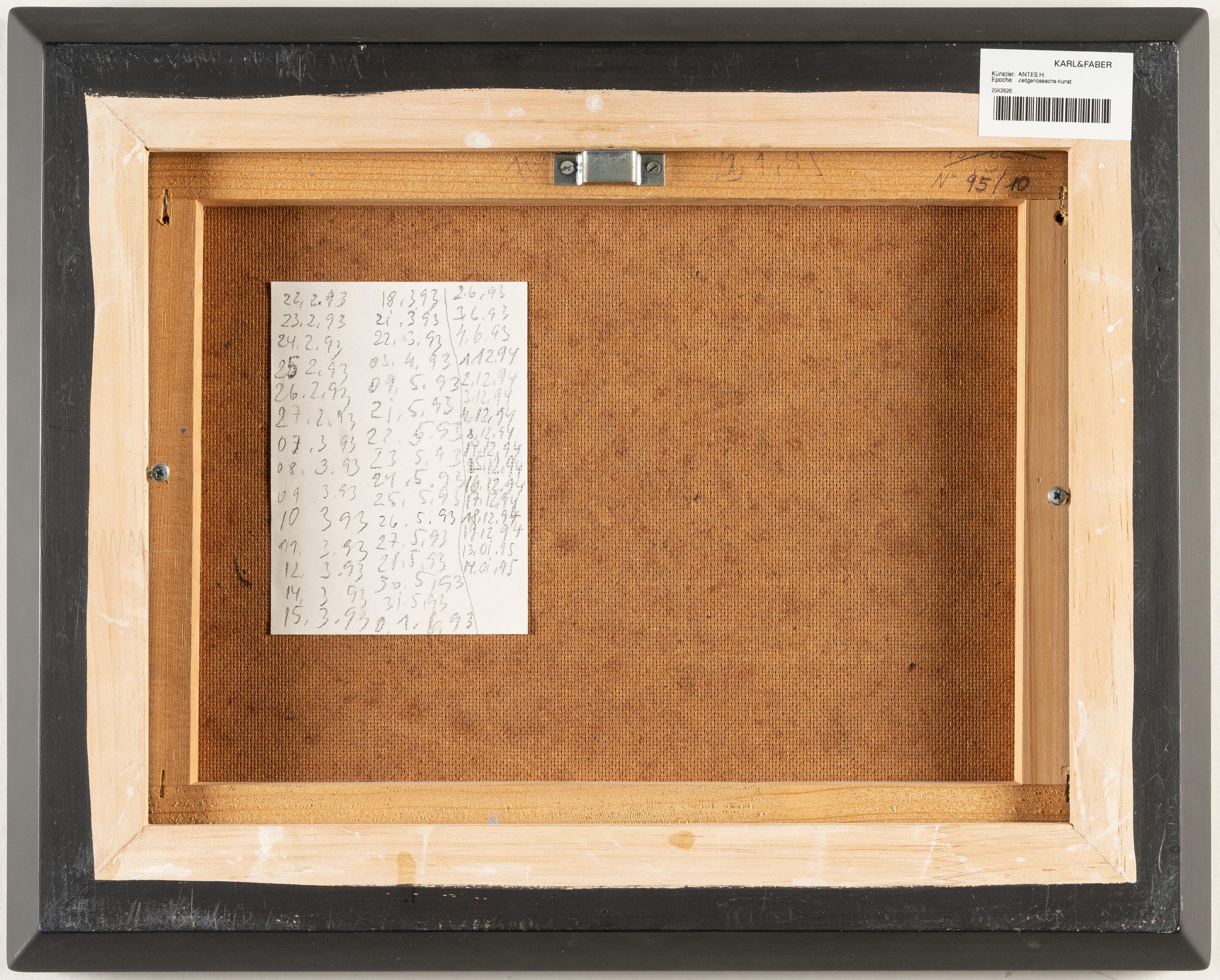 Acryl mit Sägemehl auf Hartfaserplatte, auf Holzleisten montiert. (19)93-95. Ca. 31 x 41 cm. Verso Etikett mit Datierungsliste des Malprozesses. Verso auf den Leisten datiert und mit der Werknummer "No. 95/10" versehen.