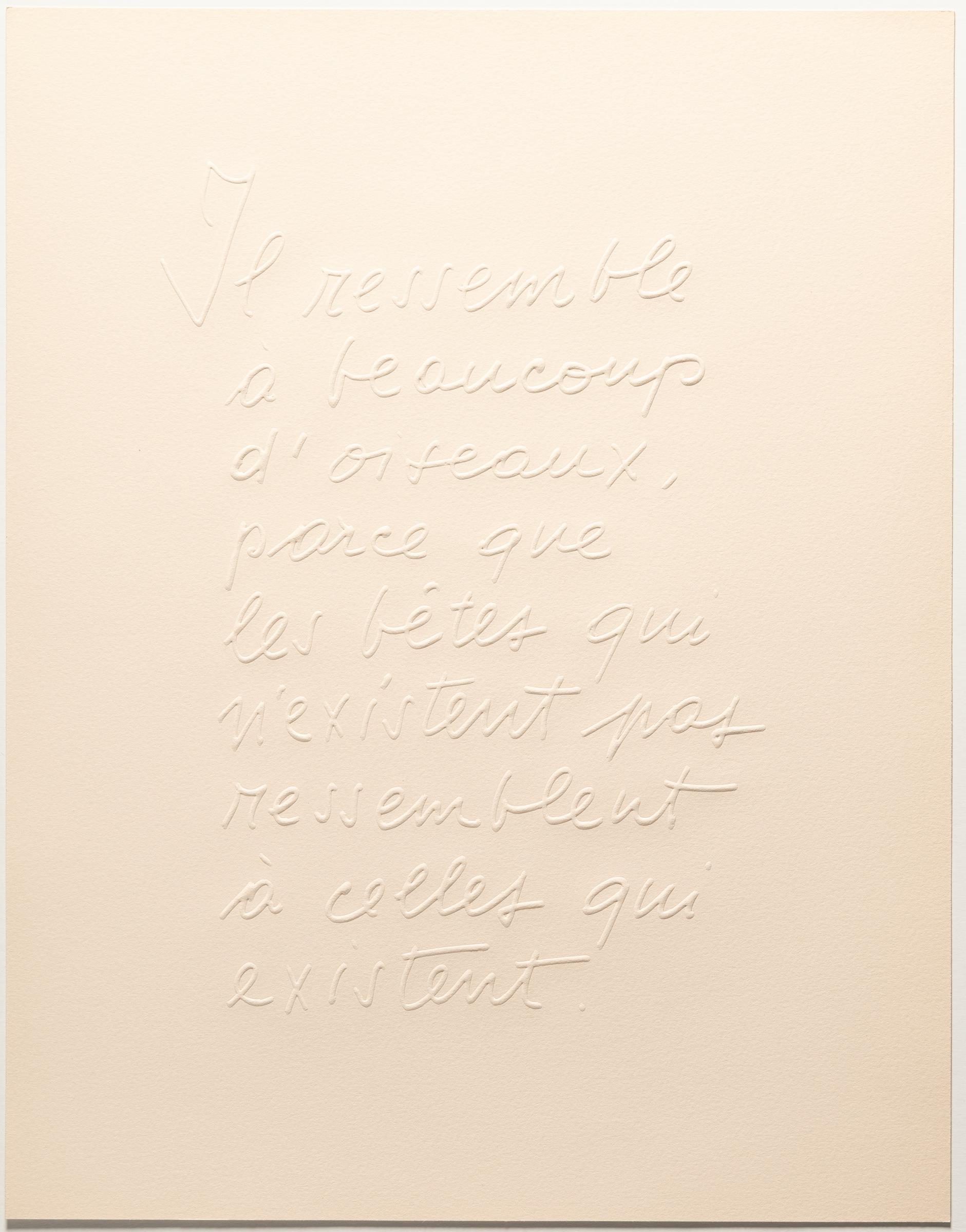In dem 1966 entstandenen Künstlerbuch lässt Sorel Etrog Claude Avelines Gedicht „Portrait de l'Oiseau-Qui-N'Existe-Pas“ aus dem Jahr 1950 in eindrucksvollen Prägedrucken lebendig werden.