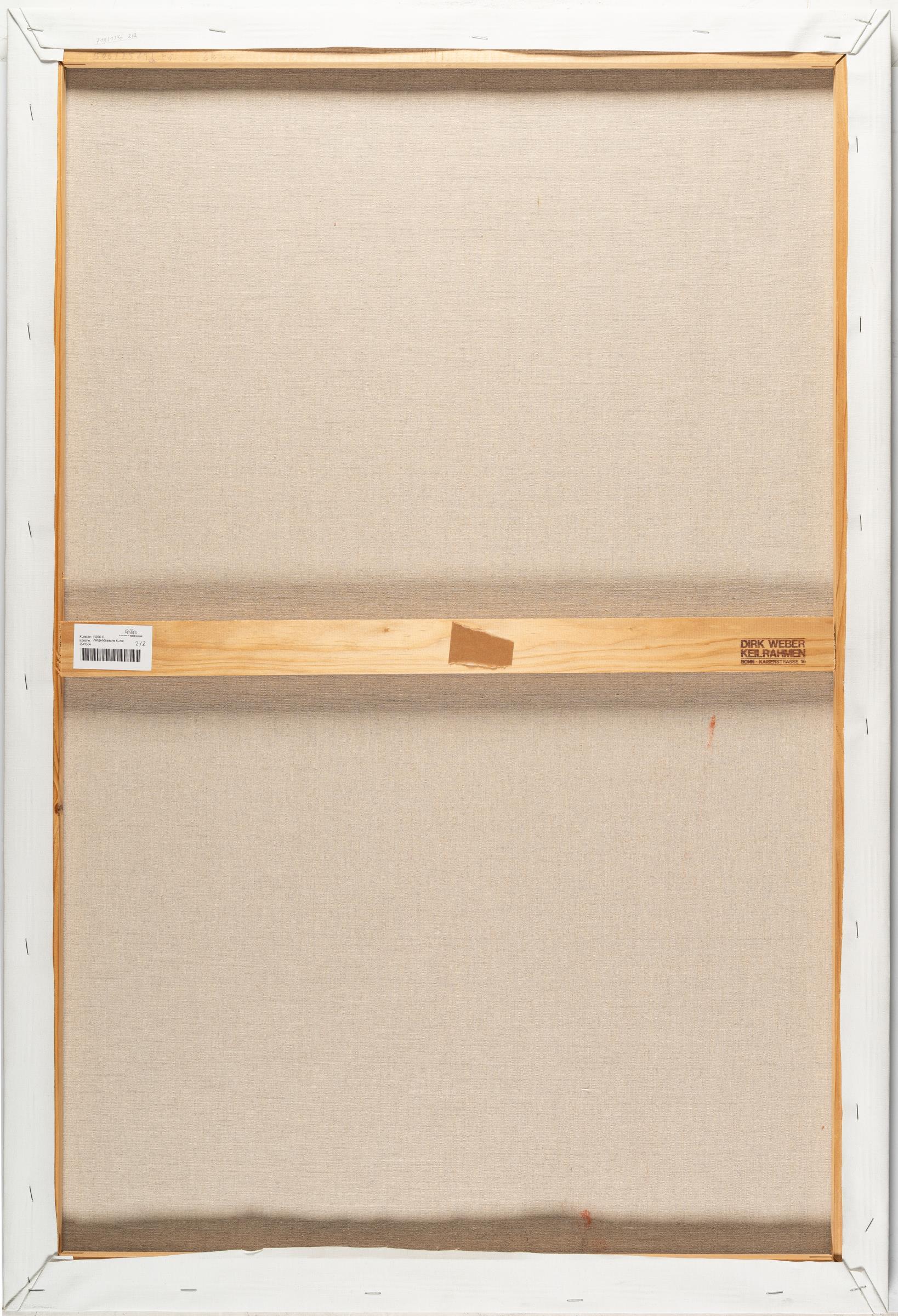 Stellenweise minimale oberflächliche Bereibungsspuren sowie an den Kanten bzw. Rändern leicht berieben und verschmutzt, etwas deutlicher oben links, mit vereinzelten winzigen weißen Farbfleckchen (wohl Atelier). Insgesamt in sehr gutem Zustand.