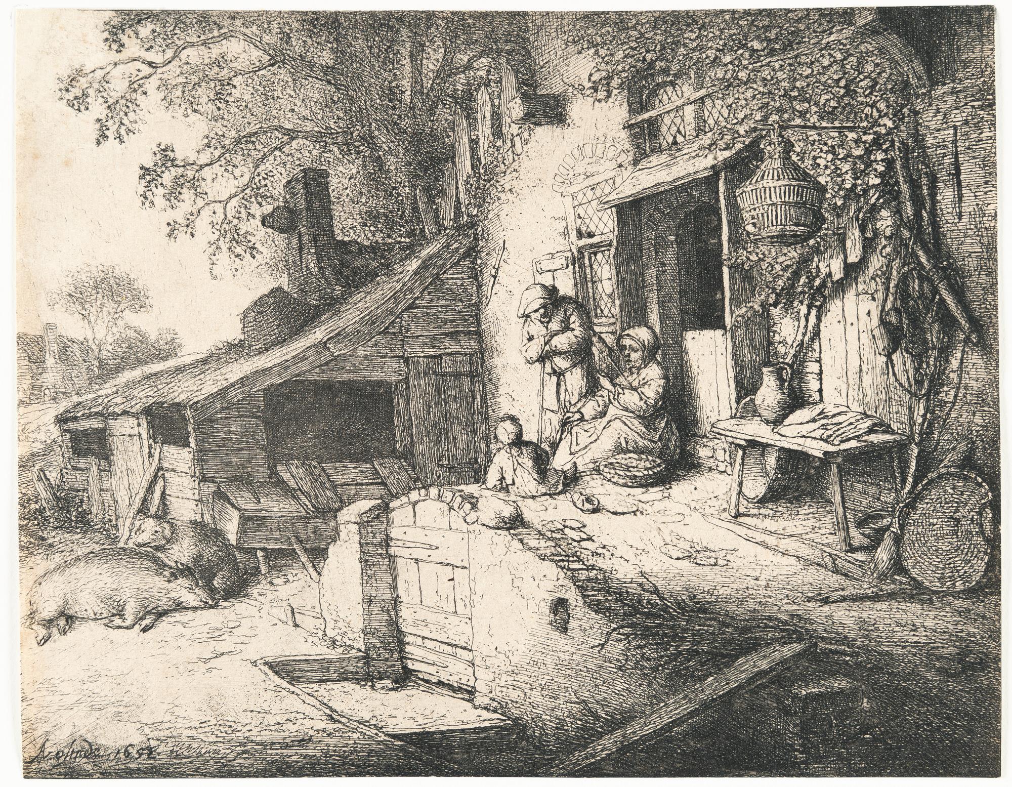 A good, strong early impression with fine smudges in the sky and ground areas. Before the completion of the board between the pigs and the cellar wall and before all additional fine workings. This charming scene in front of a 17th-century Dutch farmhouse is inscribed ‘très rare’ by Godefroy. Cut just within the plate mark. The upper left corner carefully repaired, paper with a few brown spots. On the reverse with traces and remnants of former mounting, otherwise in good condition. Very rare in this early impression!