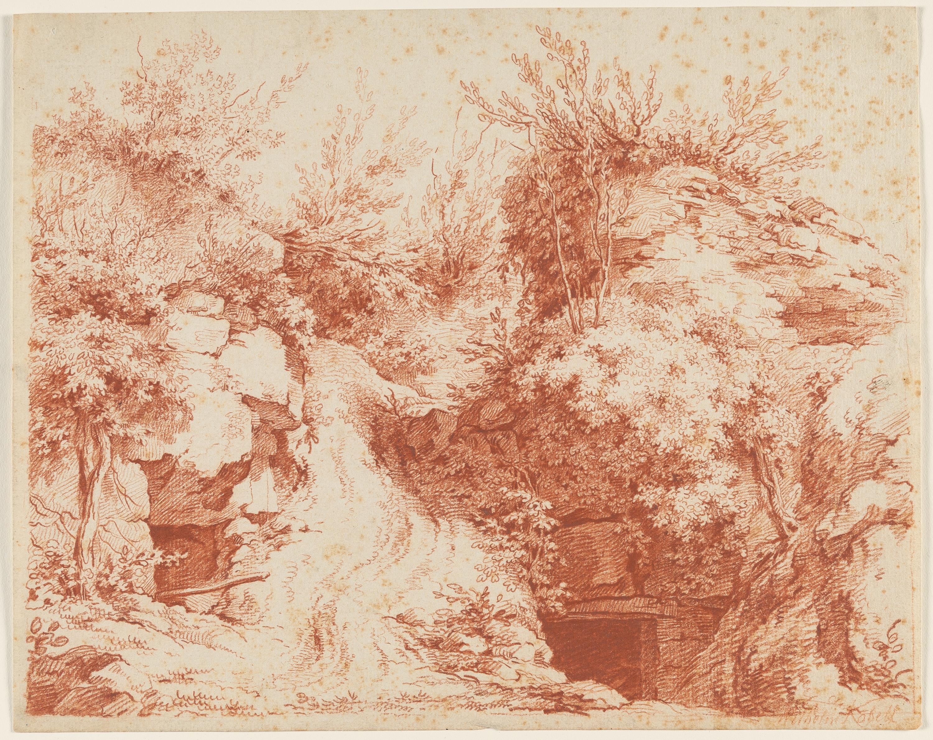 The present red chalk drawing is clearly in the tradition of French landscape drawings of the 18th century. The chosen detail with the geometric tunnel entrances is idiosyncratic. They illustrate how human industry, especially in the age of industrialisation, made more and more interventions in nature necessary. - Faint foxing throughout. Remnants of former mounting on the reverse along the sheet edges. In good condition in keeping with its age.