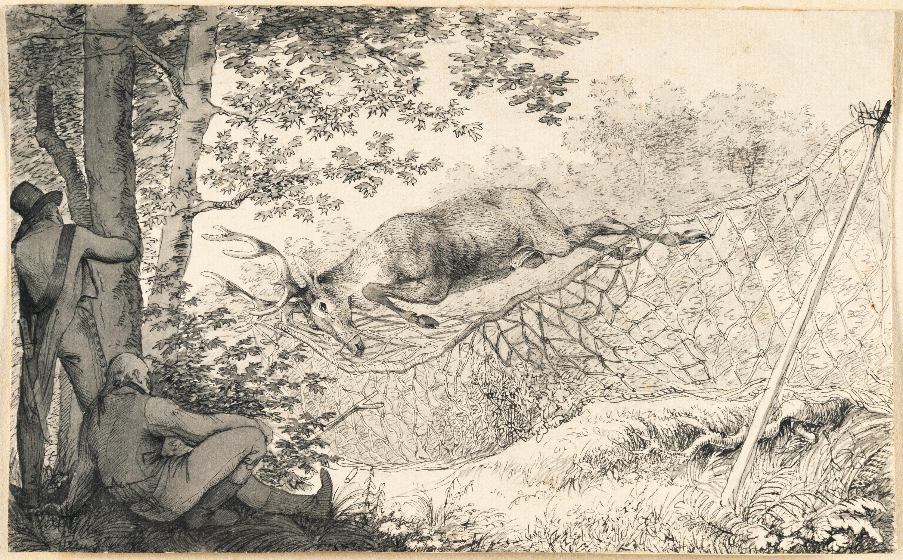 2 sheets: The stag falls in - The stag caught in the net is held by the hunters by its antlers and hind legs