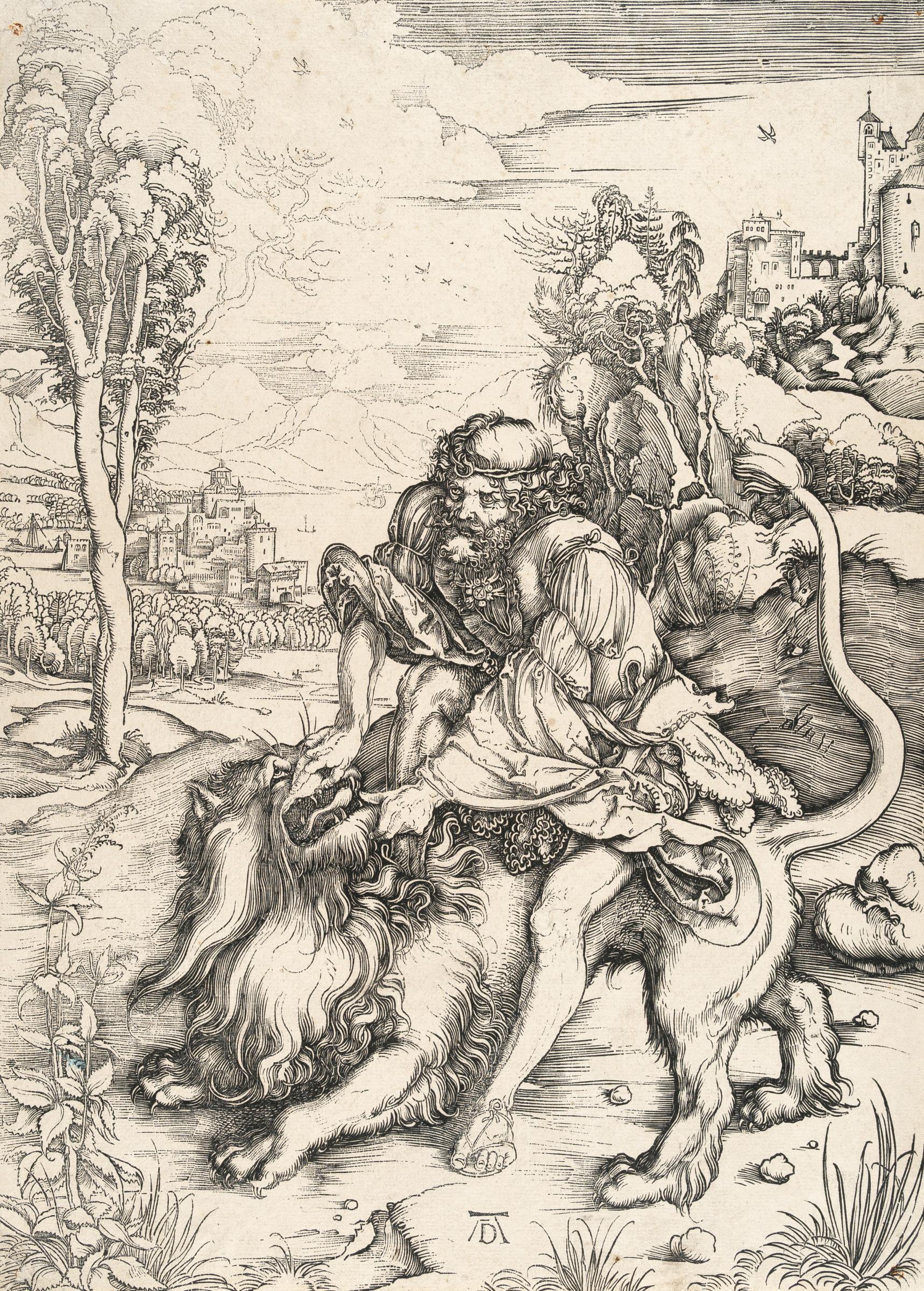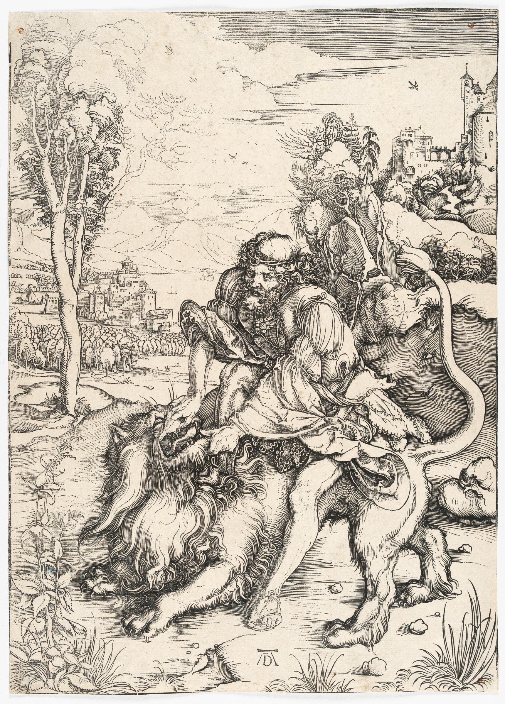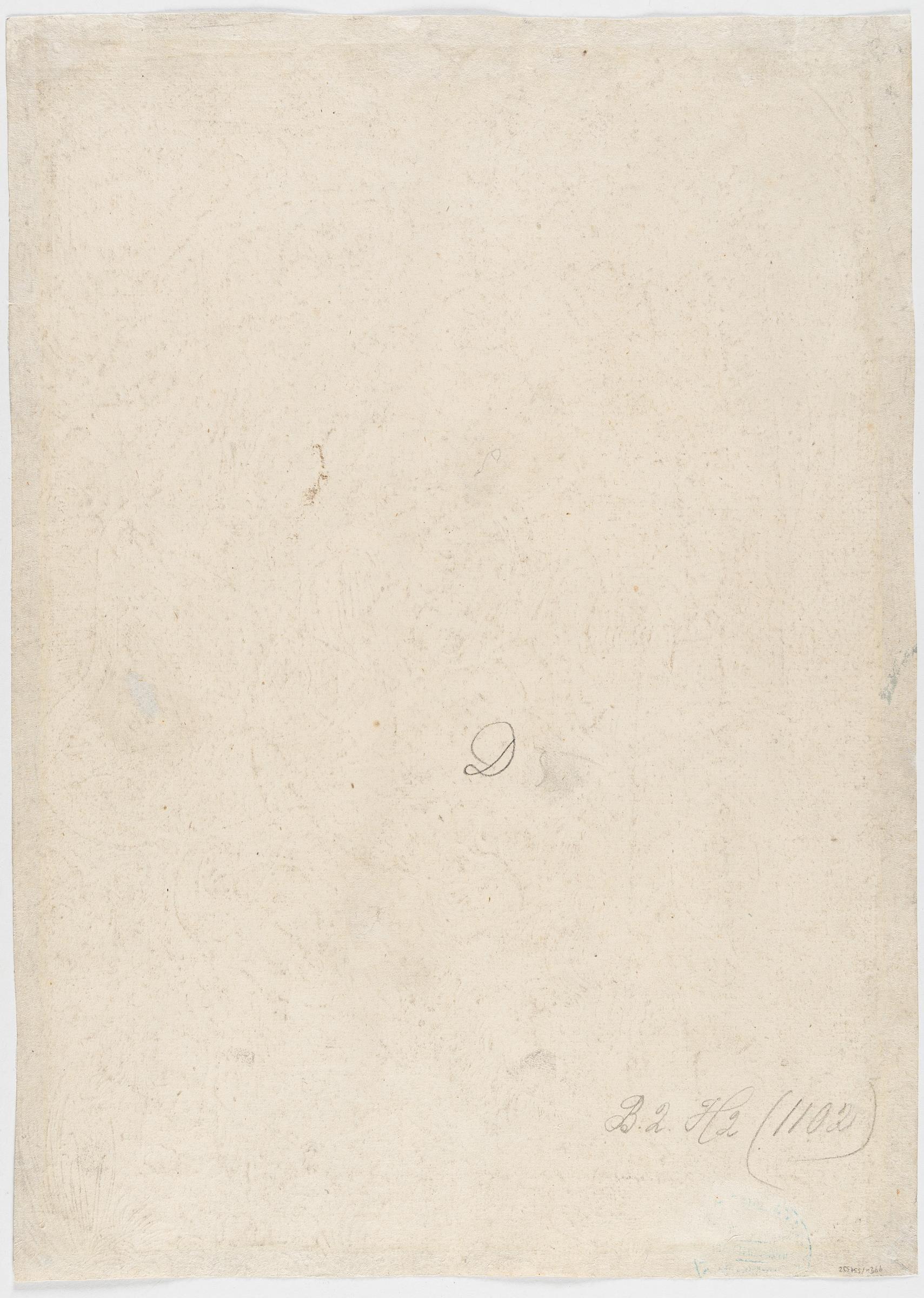A good, but slightly later printing partially dry (most noticeably in the background landscape); Meder f-g intermediate state, showing the tiny gaps in the lower borderline. Trimmed to the borderline, at the top left and bottom right minimally within. – A few small, carefully restored tears along the upper edge. Paper slightly time-stained and thinned out in places. Faint traces of blue ink in the lower left margin, small brown spots in three corners, otherwise in good condition.