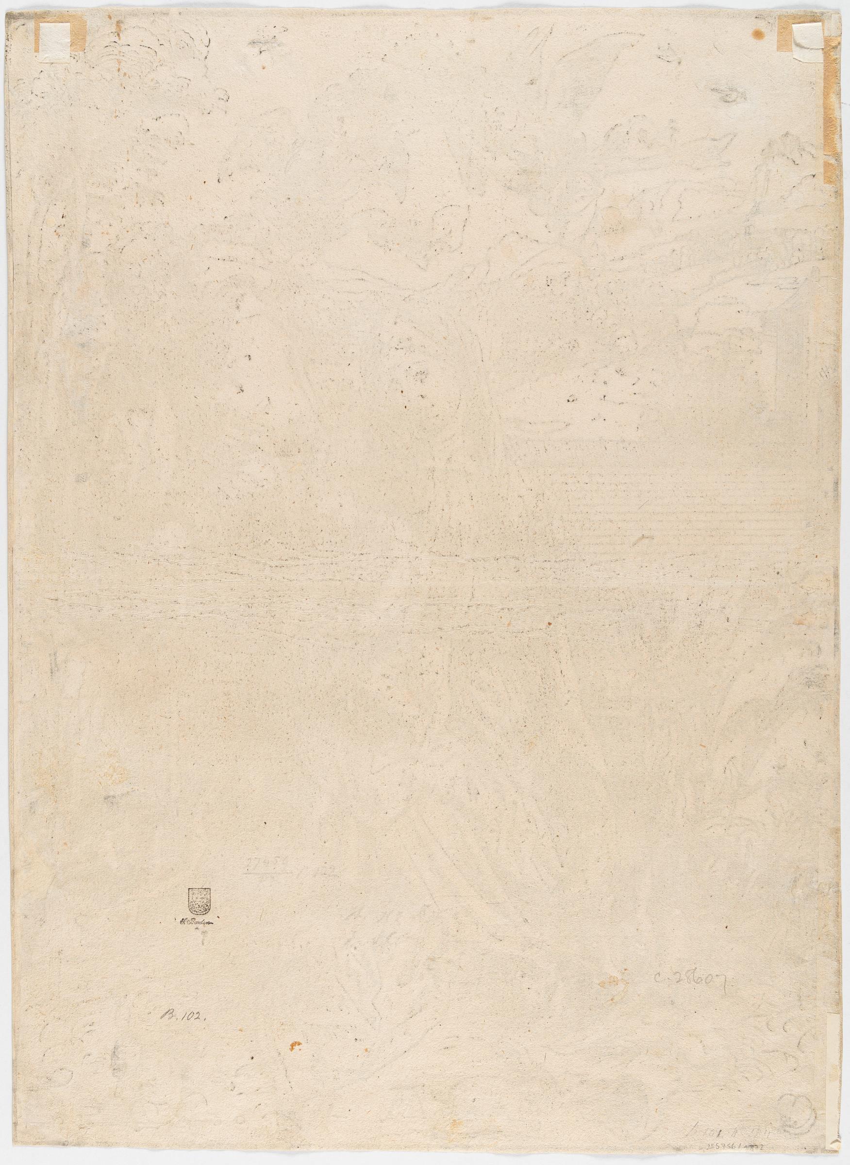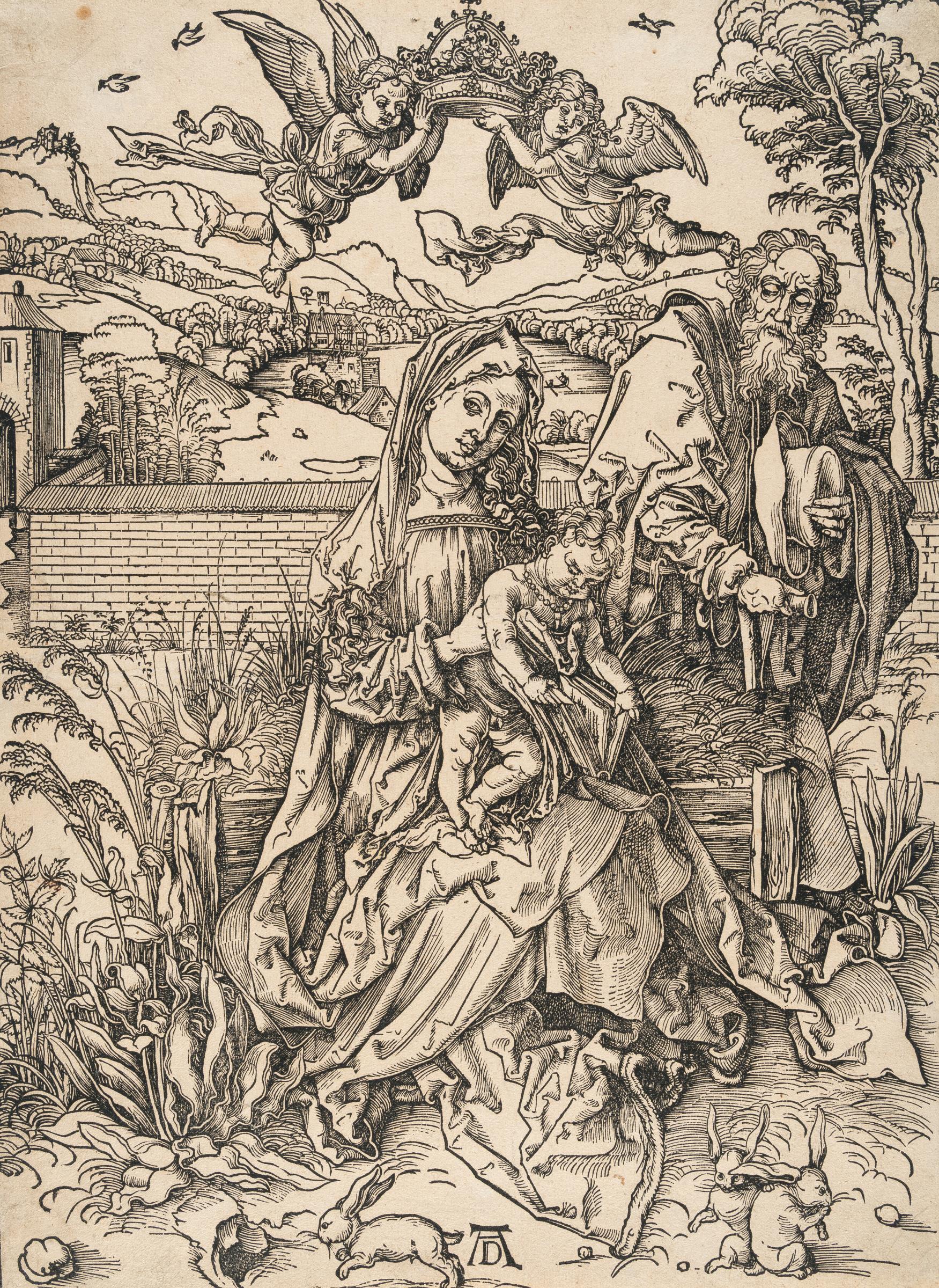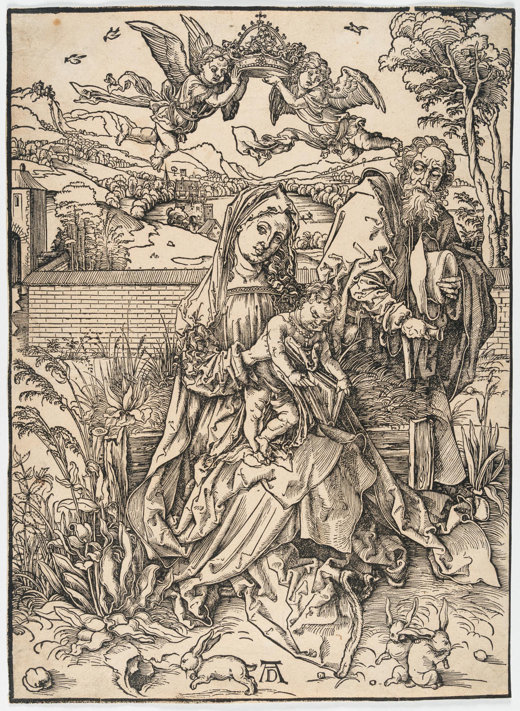 A good, strong impression, with the gap at the top right borderline. The Holy Family with the three Hares is arguably the most appealing of the artist's woodcuts and one of the few idyllic images Dürer created in the medium. Thread margins or trimmed to the borderline. – Faint scattered foxing. Paper slighty time-stained and somewhat wrinkled along the horizontal centrefold. Occasional paper thinning on the reverse. Delicate folding marks in the corners. Verso along the right margin and in the upper corners with remnants of former mounting. In good condition.