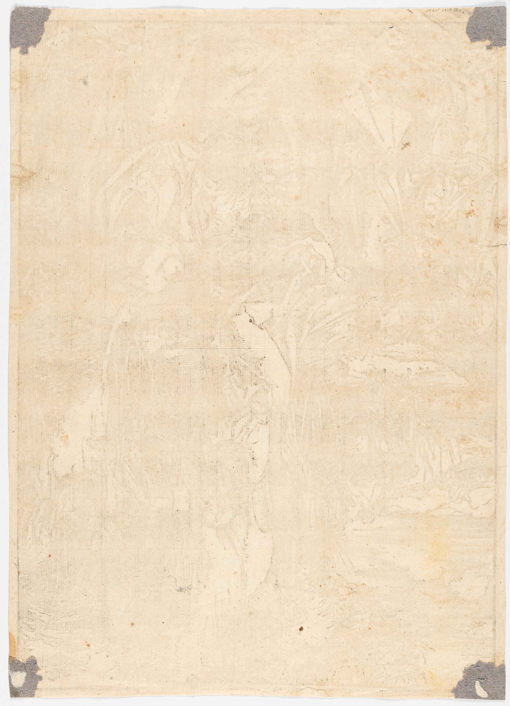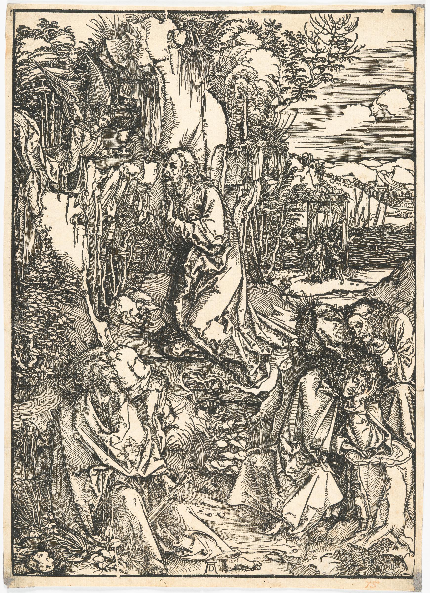 Plate 3, from: The Large Passion. Good, later impression with two cracs in the block, the third crack at the top right already visible in the foliage. With a margin up to 7 mm wide around the borderlines. – The paper has small brown spots and is slightly time-stained. Smoothed horizontal centrefolds. On the reverse with remnants of a previous mounting, visible through the recto; three corners with paper defects. Small hole in the lower right. Three small closed tears on the left edge. Two tears on the right edge. One tear on the upper edge, backed, otherwise still in good condition.