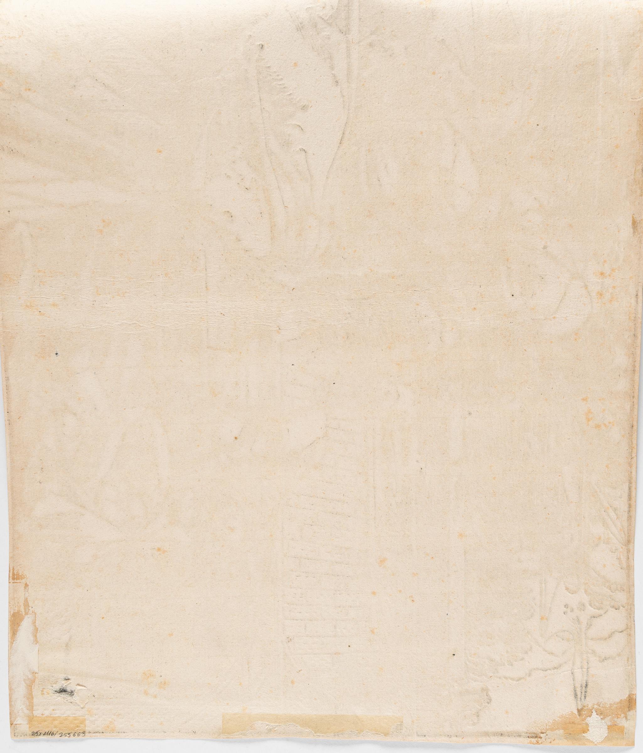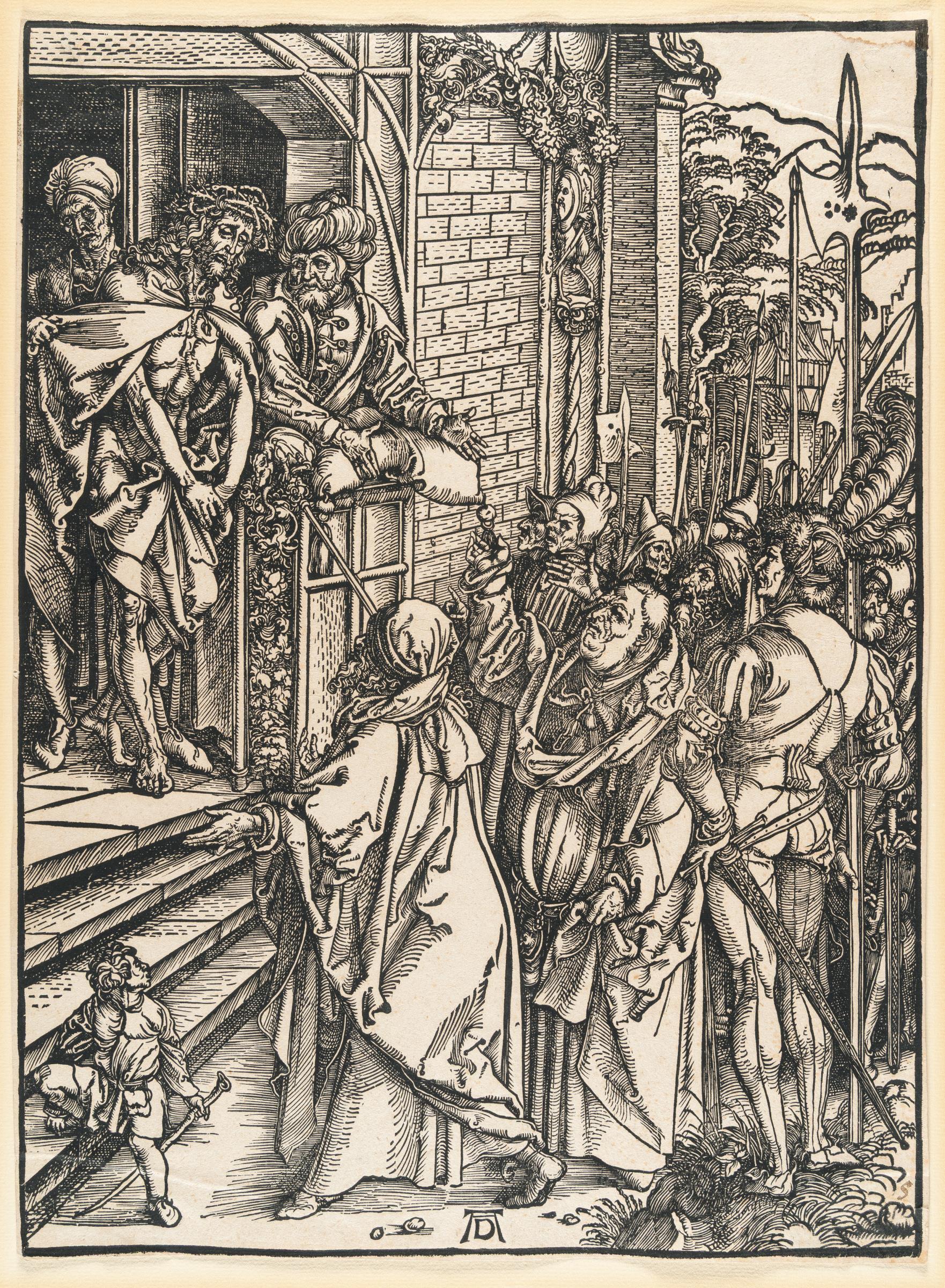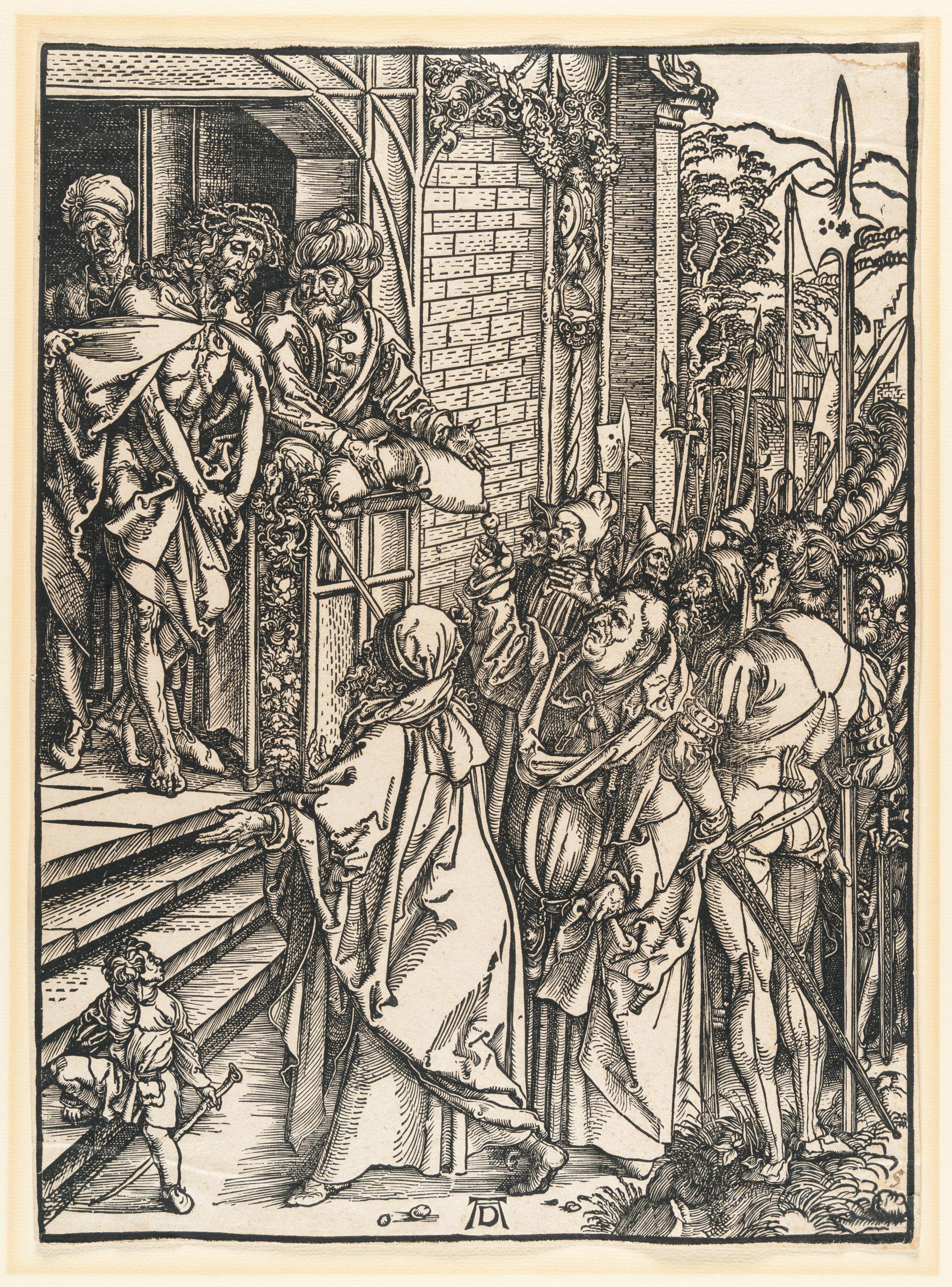 Plate 6, from: The Large Passion. A strong, early, slightly over-inked Meder I b impression, before the text edition of 1511. The crack starting at the bottom and extending into the undergarment of the large man is already indicated. With narrow margins. – The upper right corner repaired and redrawn. Two small tears on the right edge. The lower corners are mounted on the backing. The paper has minimal brown spots. The upper corners with paper damage and slight crease marks, due to a former mounting. Verso remains and traces of former mounting. Well preserved for the size of the sheet.
