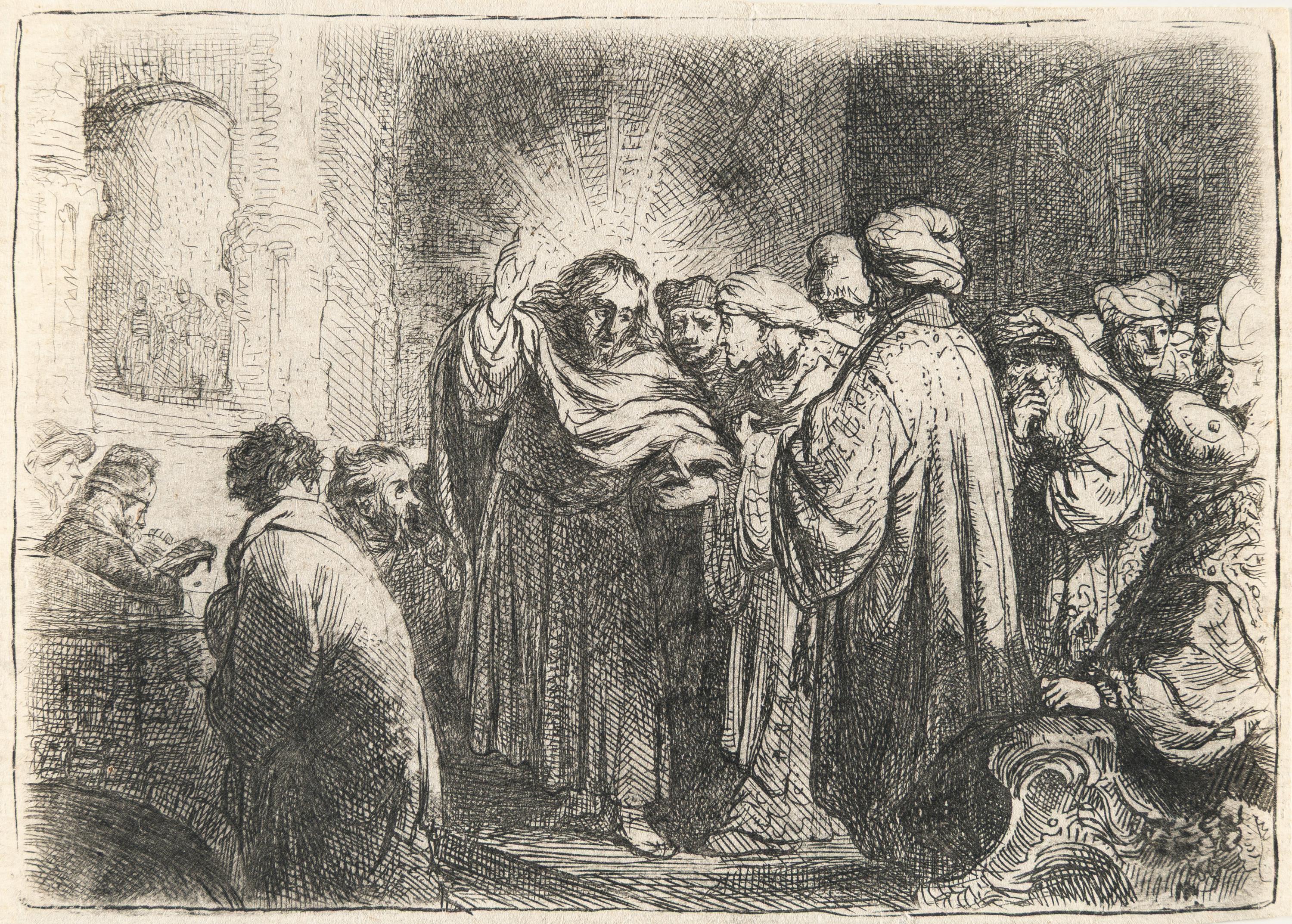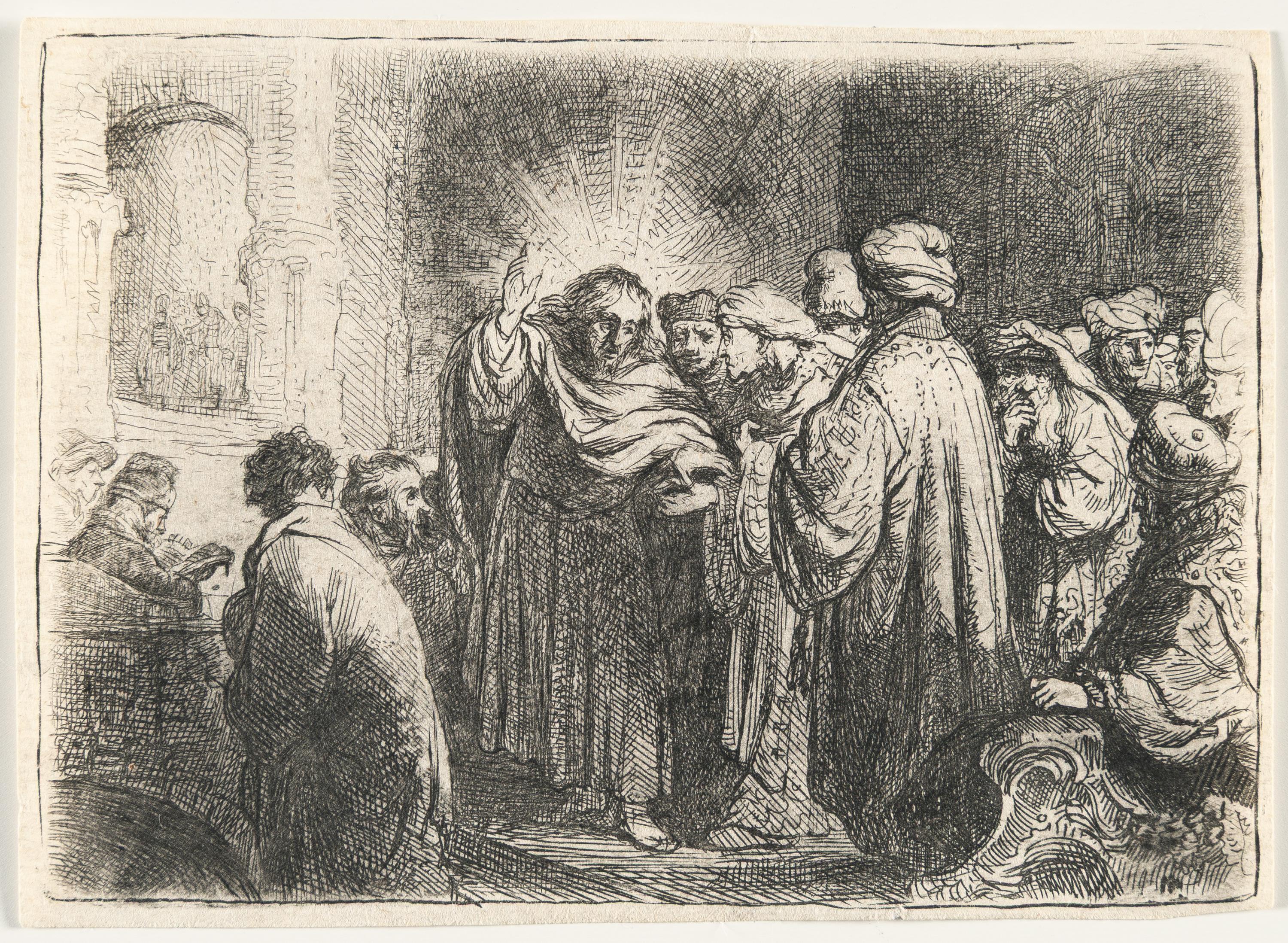 A very fine, luminous impression of the second state, printing with a delicate plate tone above Christ's head. The most shadowy parts reworked with a very fine pattern of lines and with several small parallels above the top of Christ's hair. With a small, regular margin around the clearly printing platemark. – Paper slightly thinned out in places; a few tiny paper flaws along the edges. Otherwise, in good condition.