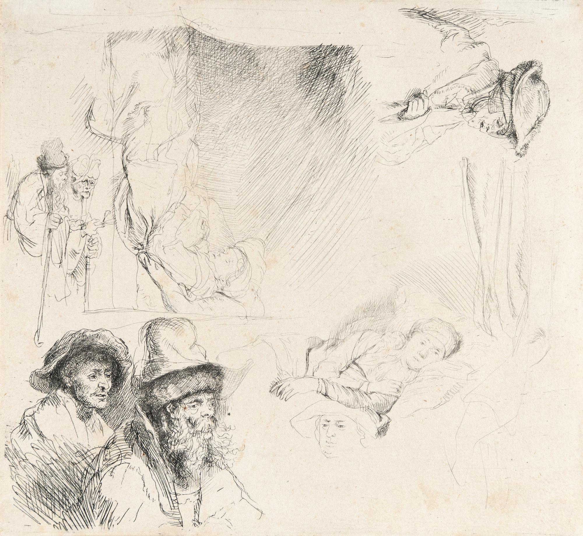 Excellent, clear early impression from the delicately etched plate. Rated RR+ by Nowell-Usticke as 'a rare, delicate plate'. There are no late impressions. With a fine margin around the plate mark. The woman lying in bed is Saskia van Uylenburgh. This assumption is based on pen and ink drawings that show Rembrandt's wife lying in bed as a sick woman (cf. asst. Cat. London/Amsterdam 2000 (Rembrandt), pp. 181 ff.) – With faint, isolated brown stains. Verso with traces of former mounting, otherwise in good condition. Very rare in this early impression!