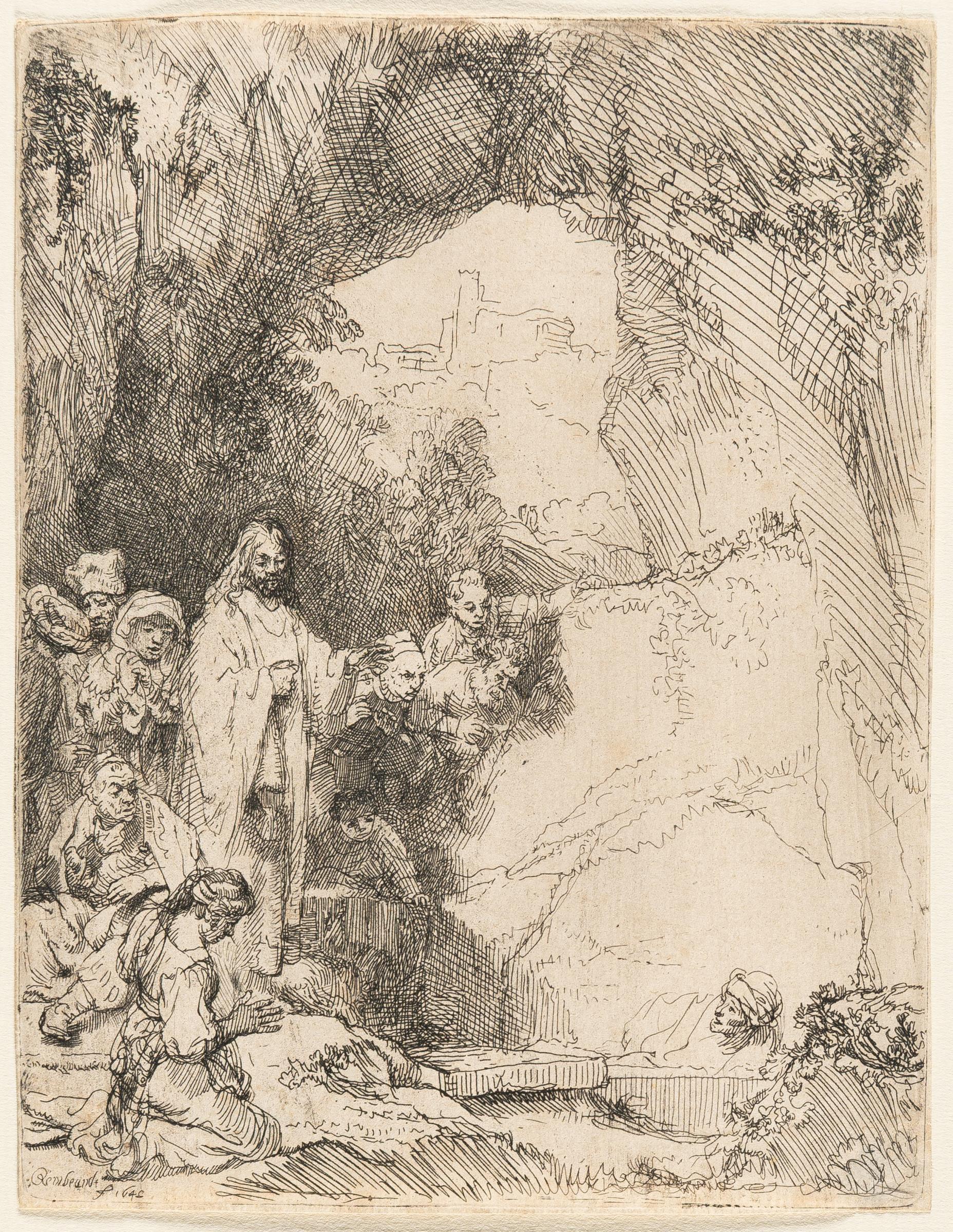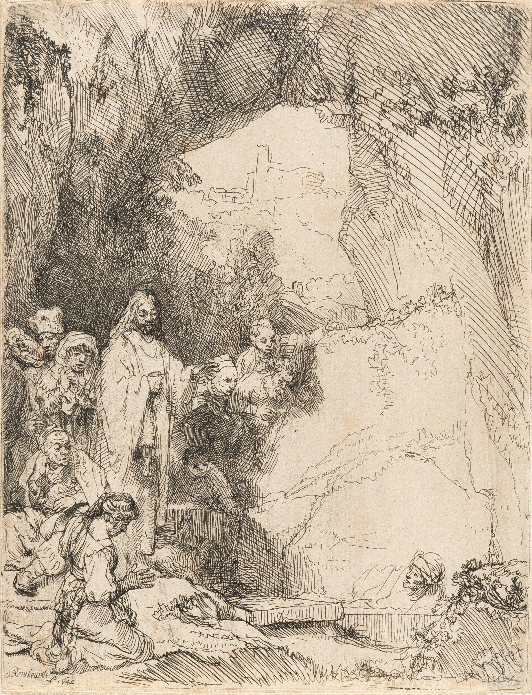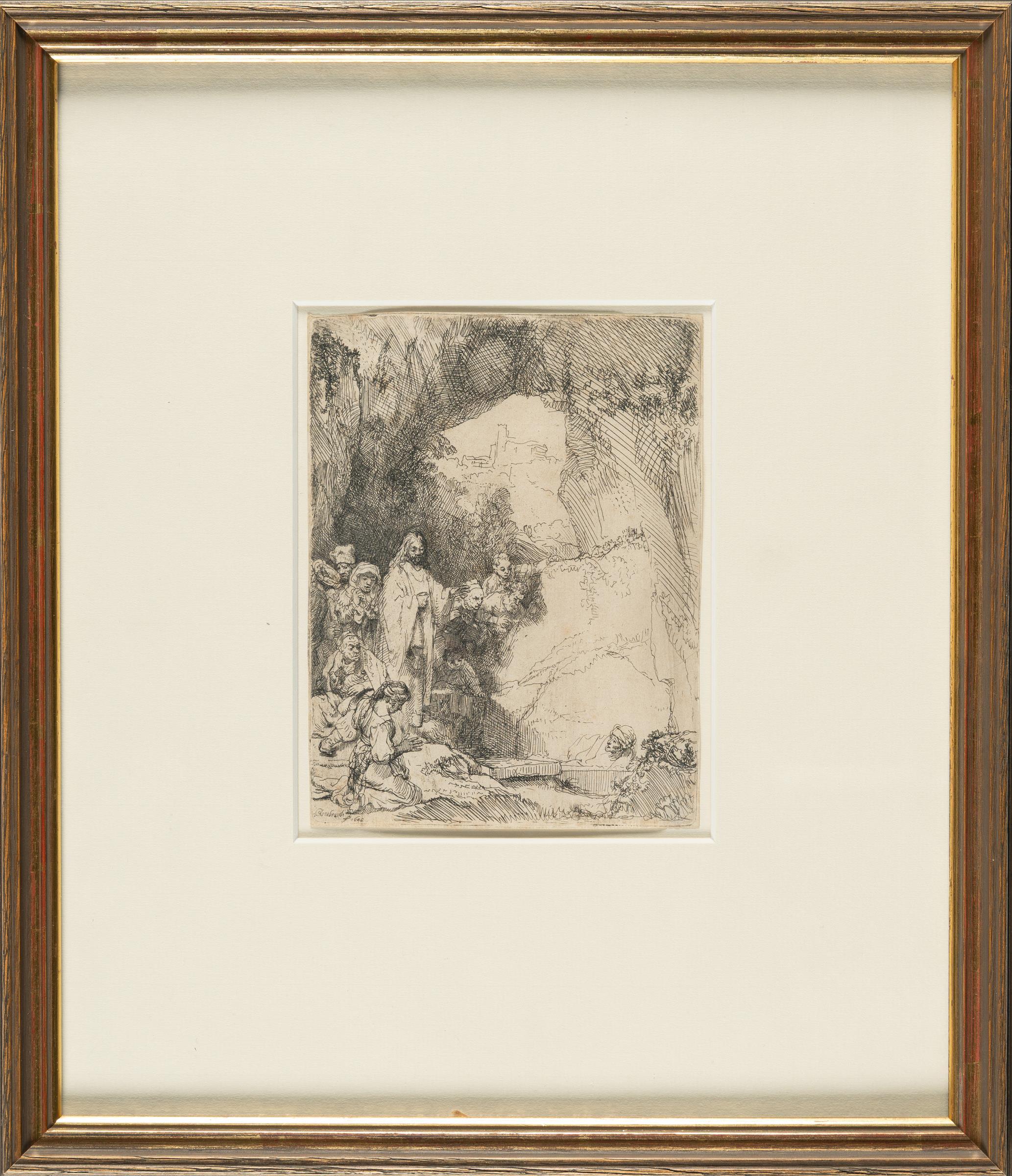 A very fine lifetime impression of the first state, printing clearly and with good contrasts; before the addition of fine diagonal shading to Lazarus’ forehead. With narrow margins around the platemark. Verso mounted in the corners onto the cardboard. – Paper slightly time-stained; slightly wavy in the corners. Otherwise in good condition.
