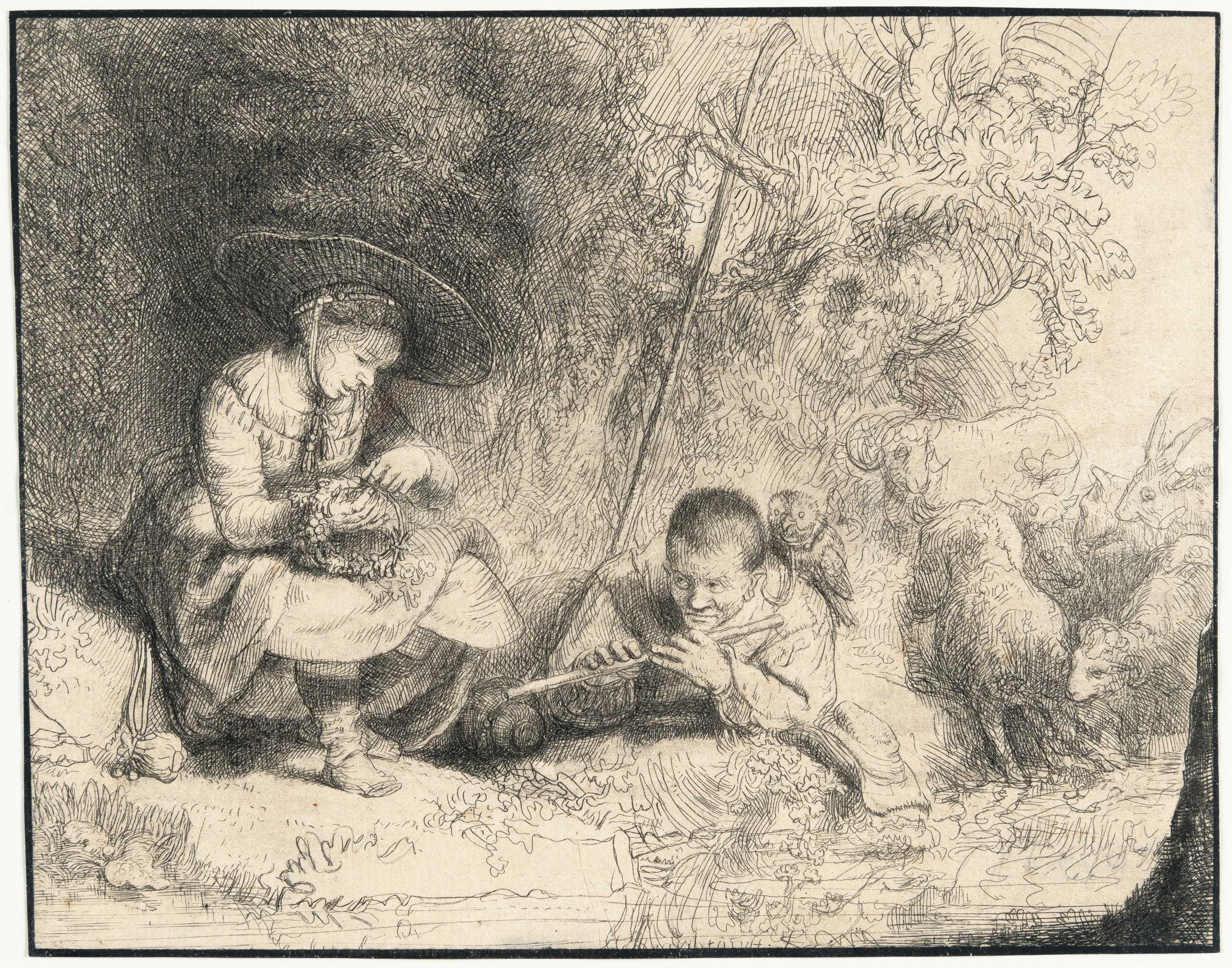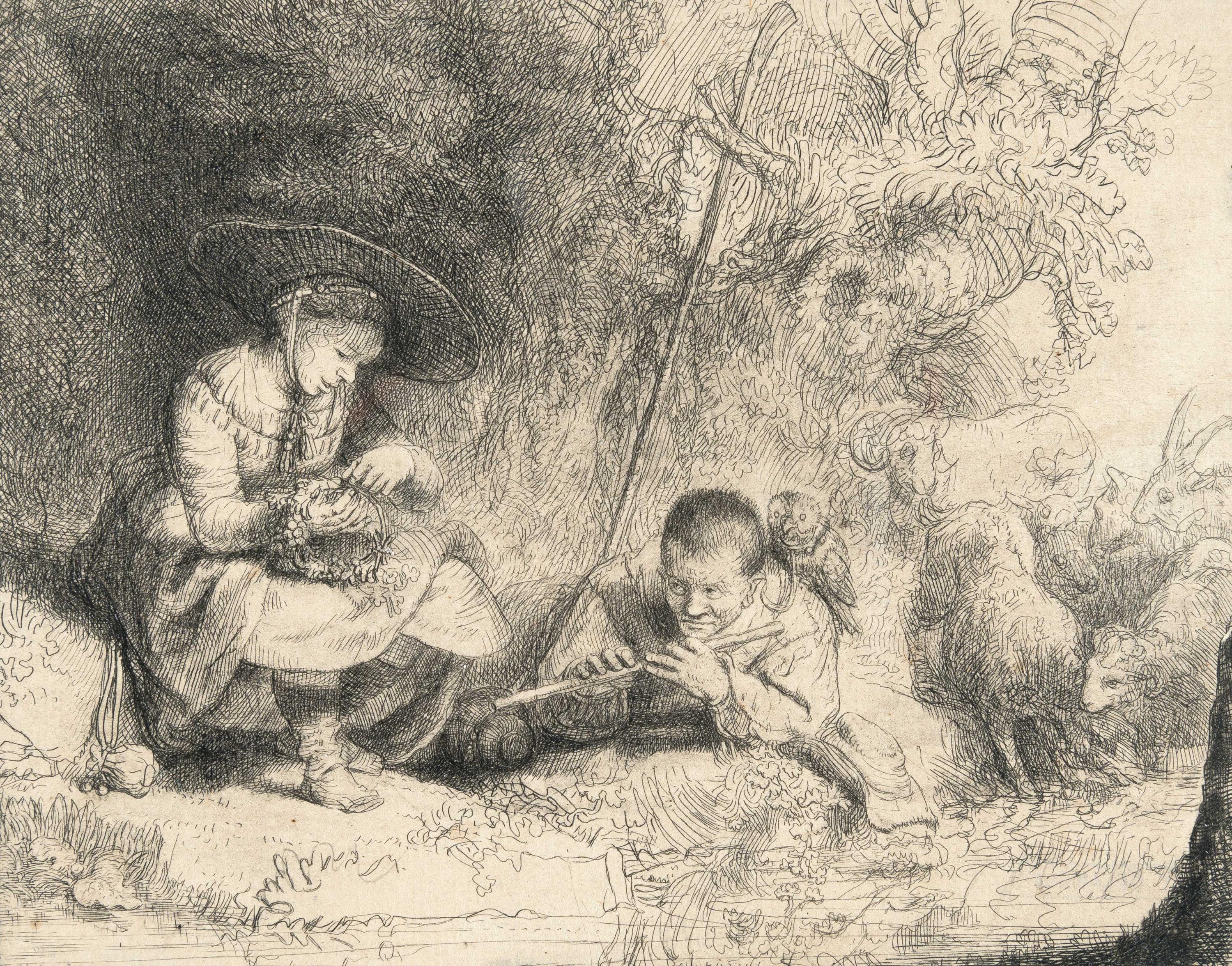 A very fine impression of the final state with burr in the dark passages around the woman's hat, with the face, which previously appeared in the tree, burnished out and replaced by shading. Trimmed to the platemark, slightly within at the bottom. – With a framing line in black ink, reaching over the shading in places. A barely noticeable vertical, slightly diagonal folding mark. In good condition.