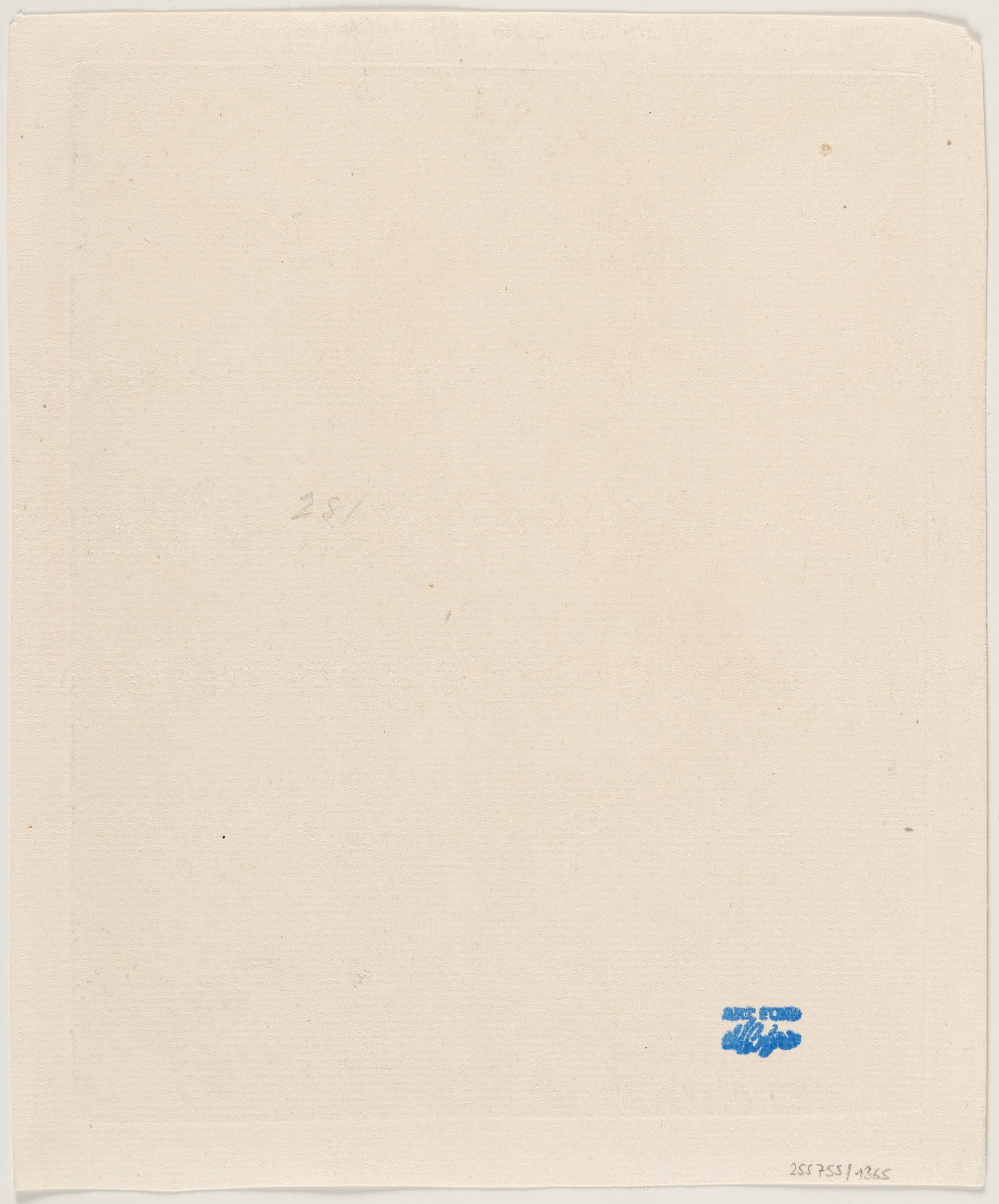 A fine, dark impression of the fifth state, after the addition of the two dots in the upper left corner. Trimmed to the platemark. Thread margins left and bottom. – A carefully restored tear in the lower right margin. A tiny rubbed area in the centreof the upper margin, otherwise in very good condition.