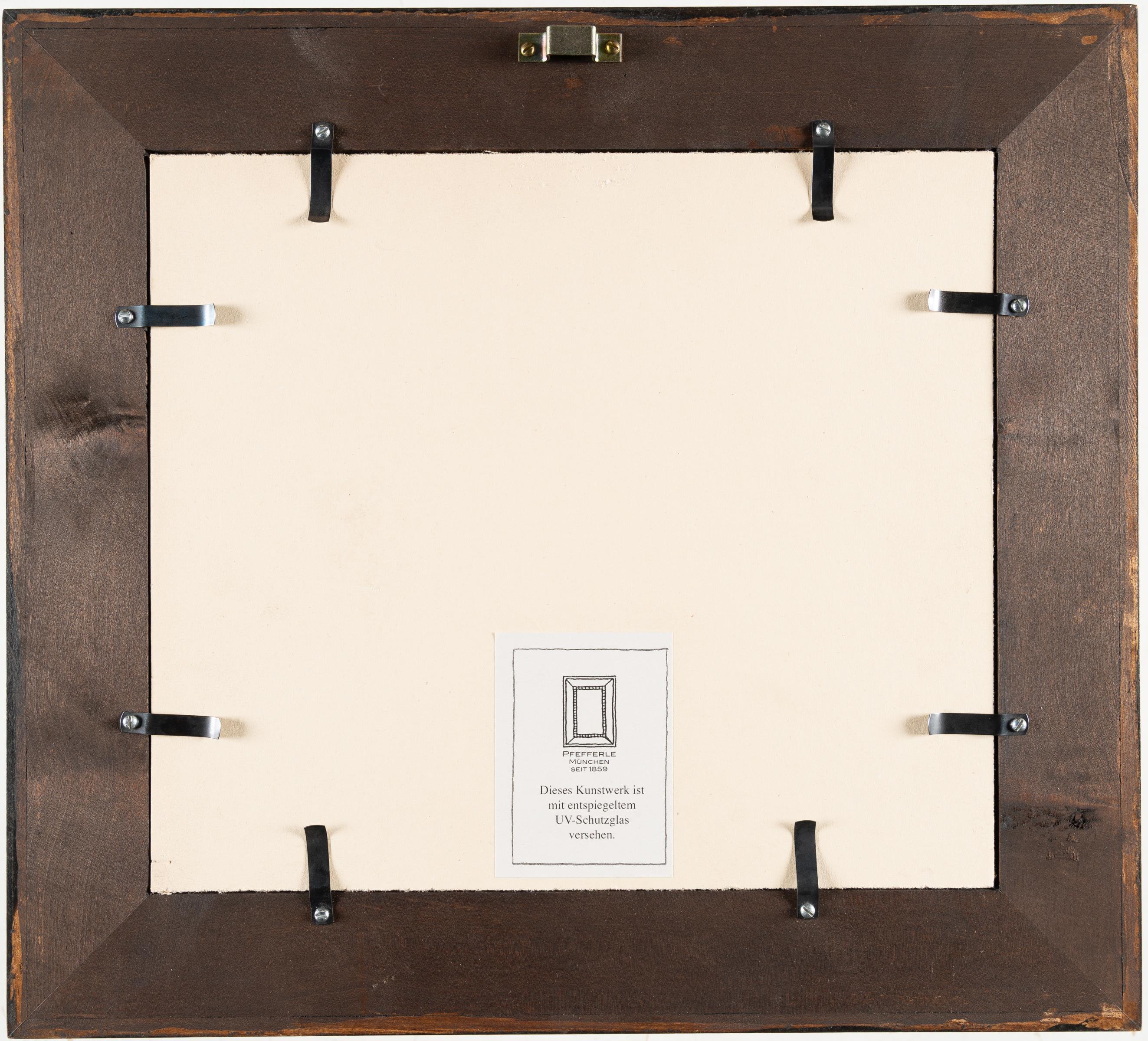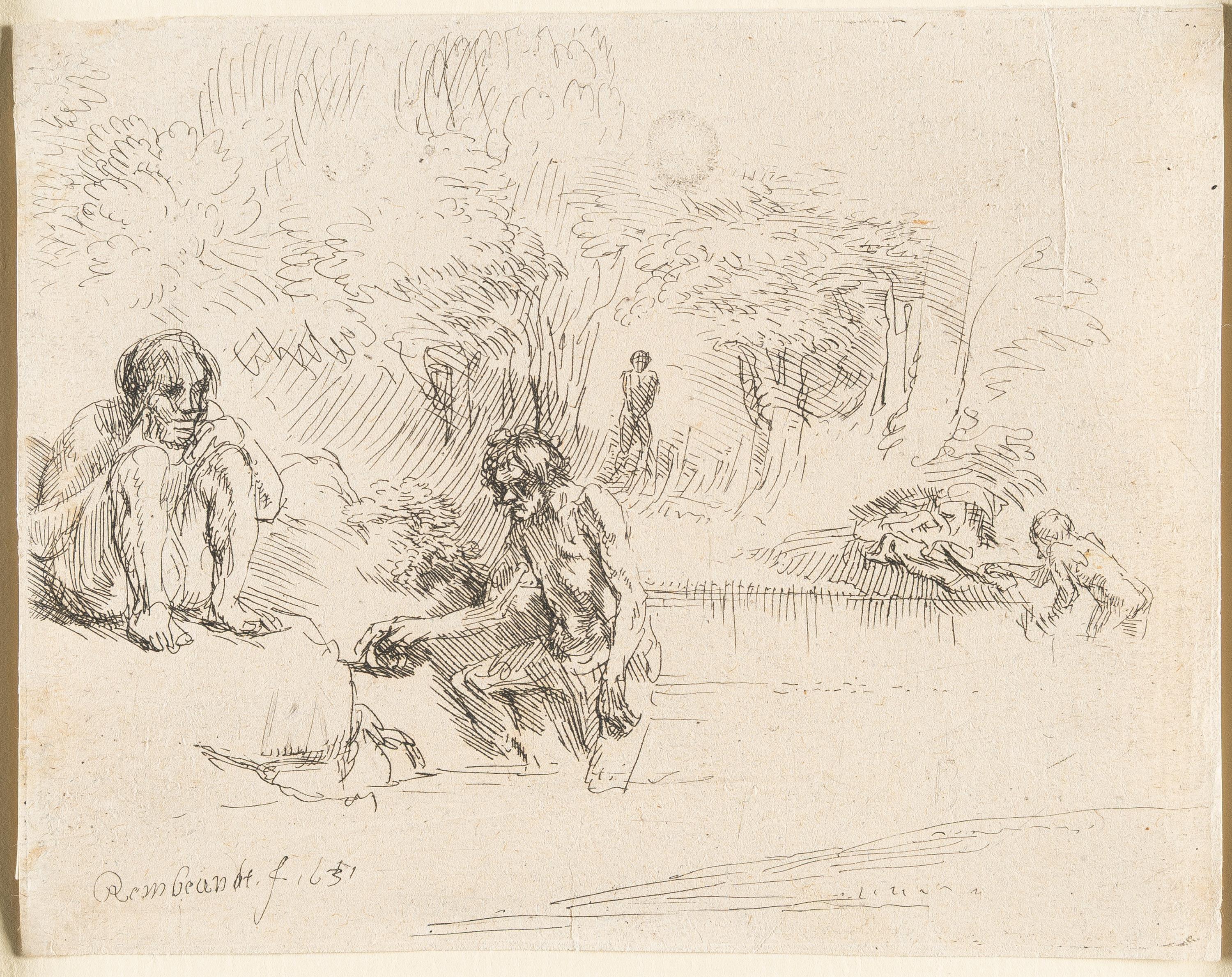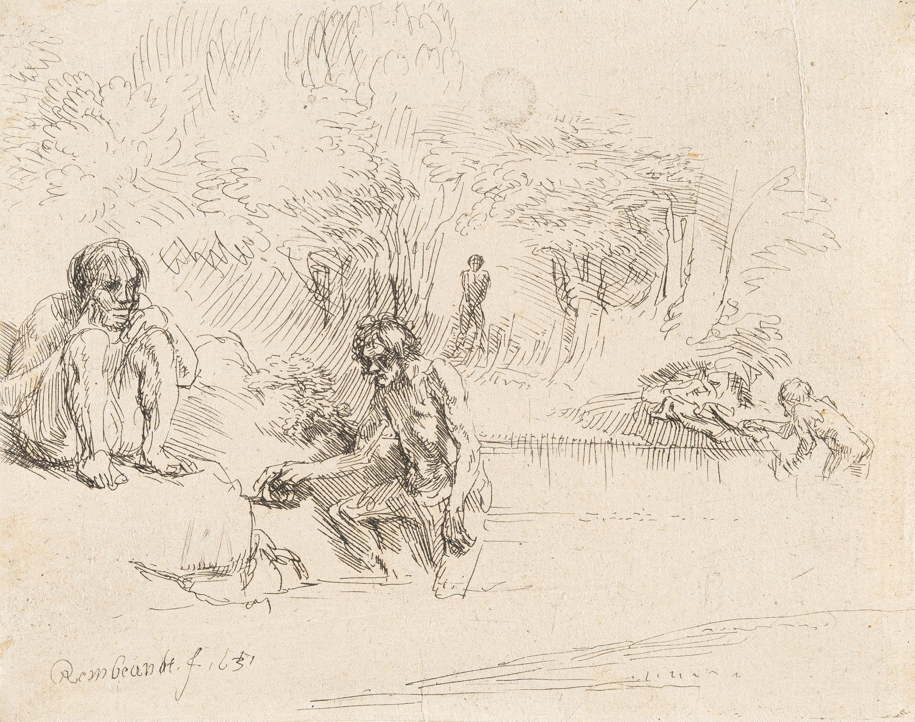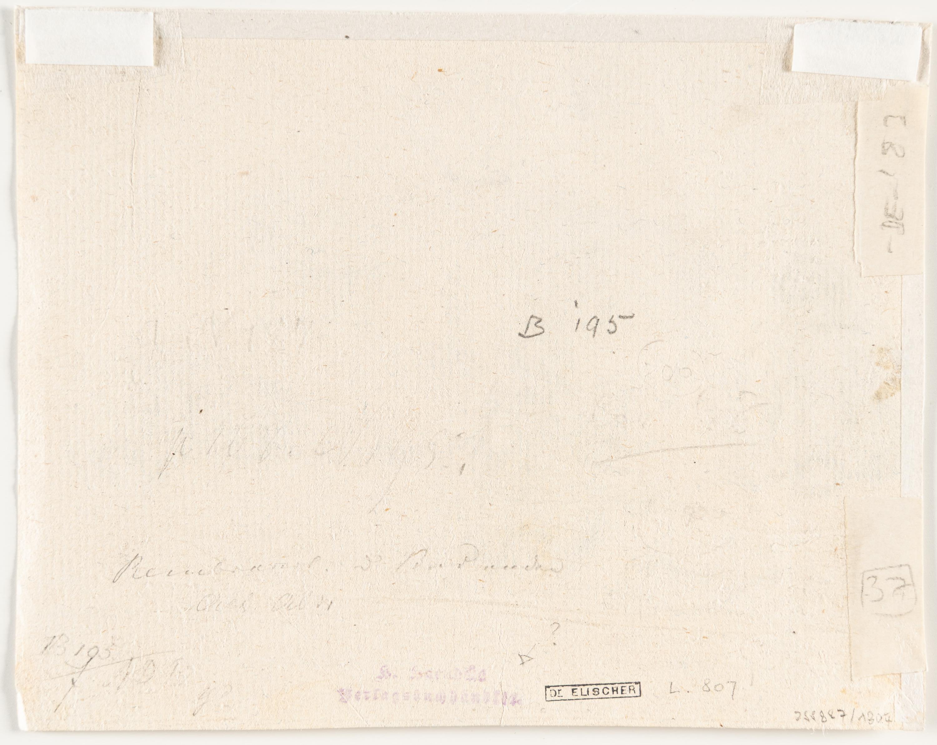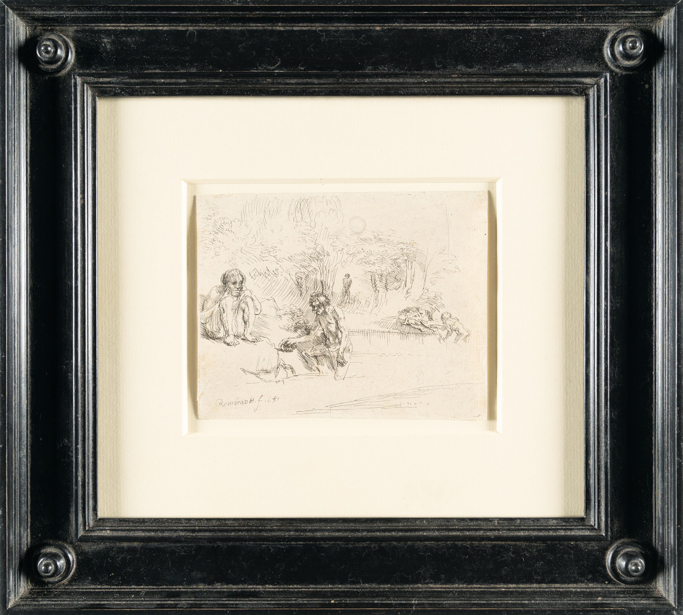 A fine, clear impression of the third state, after the addition of the two dots in the upper right corner and showing the corrosion marks visible near the upper center. With a narrow margin on three sides; trimmed to the platemark at the left. – Paper slightly thinned at the corners, with a few fine creases. A small, carefully restored tear at the lower center. The right edge of the verso reinforced with paper strips. Otherwise, in good condition.