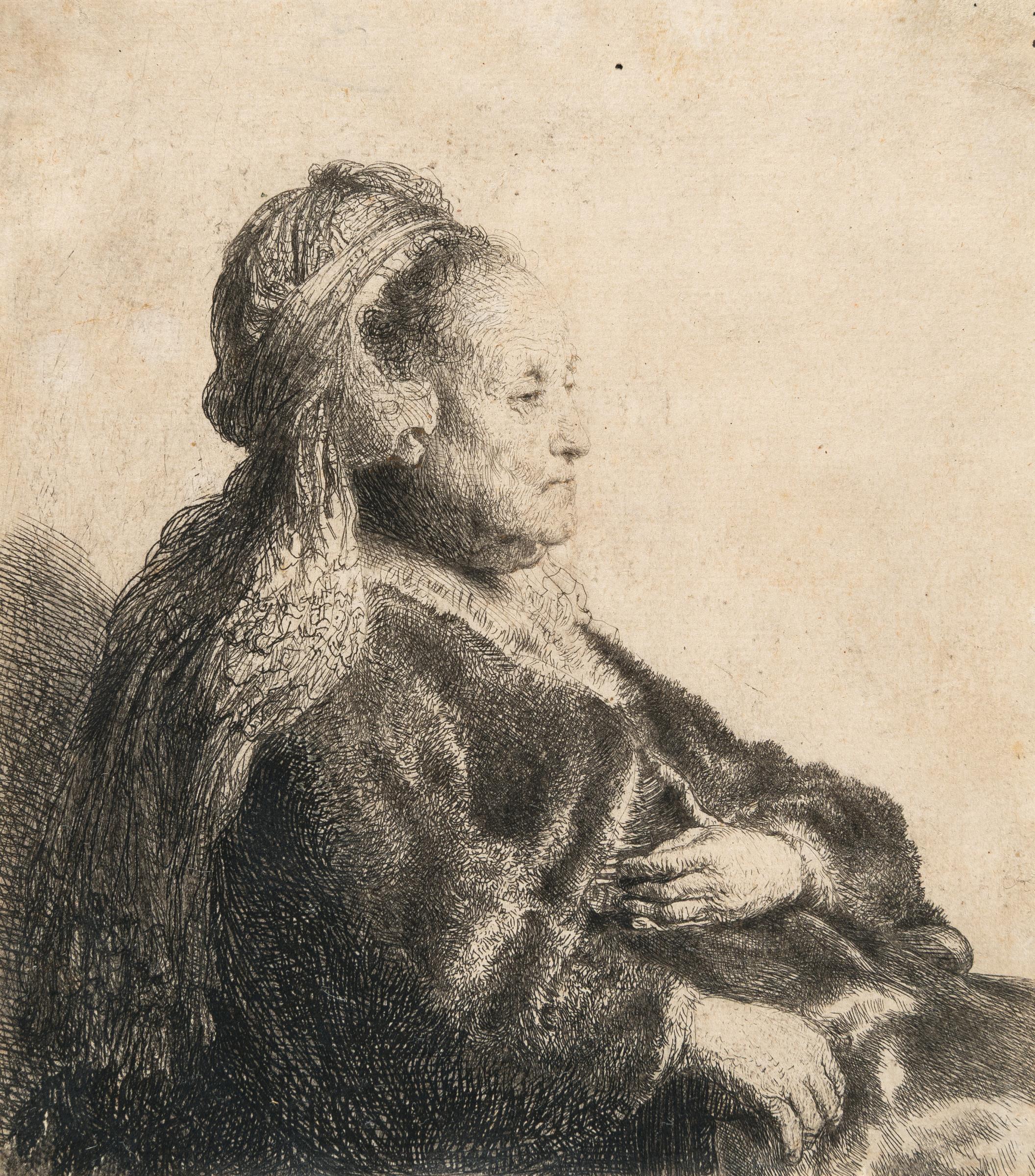 An uncommonly fine, black, early lifetime impression of the fourth state, after the addition of a few short diagonal lines in front of the sitter's neck. Trimmed within the platemark. Touches of grey wash. – Paper slightly time-stained with very faint foxing. A few small, carefully restored tears in the corners, otherwise in good condition.