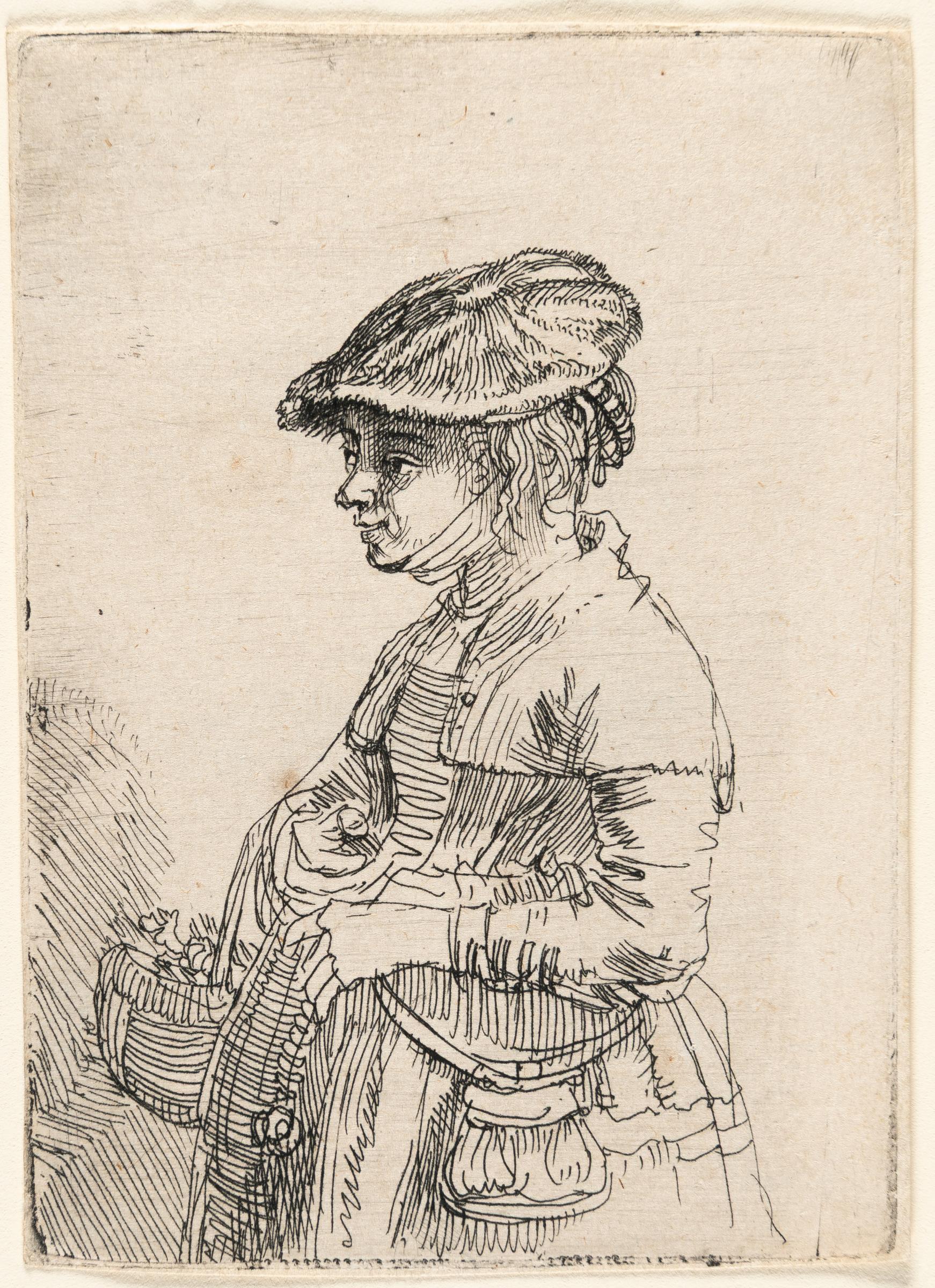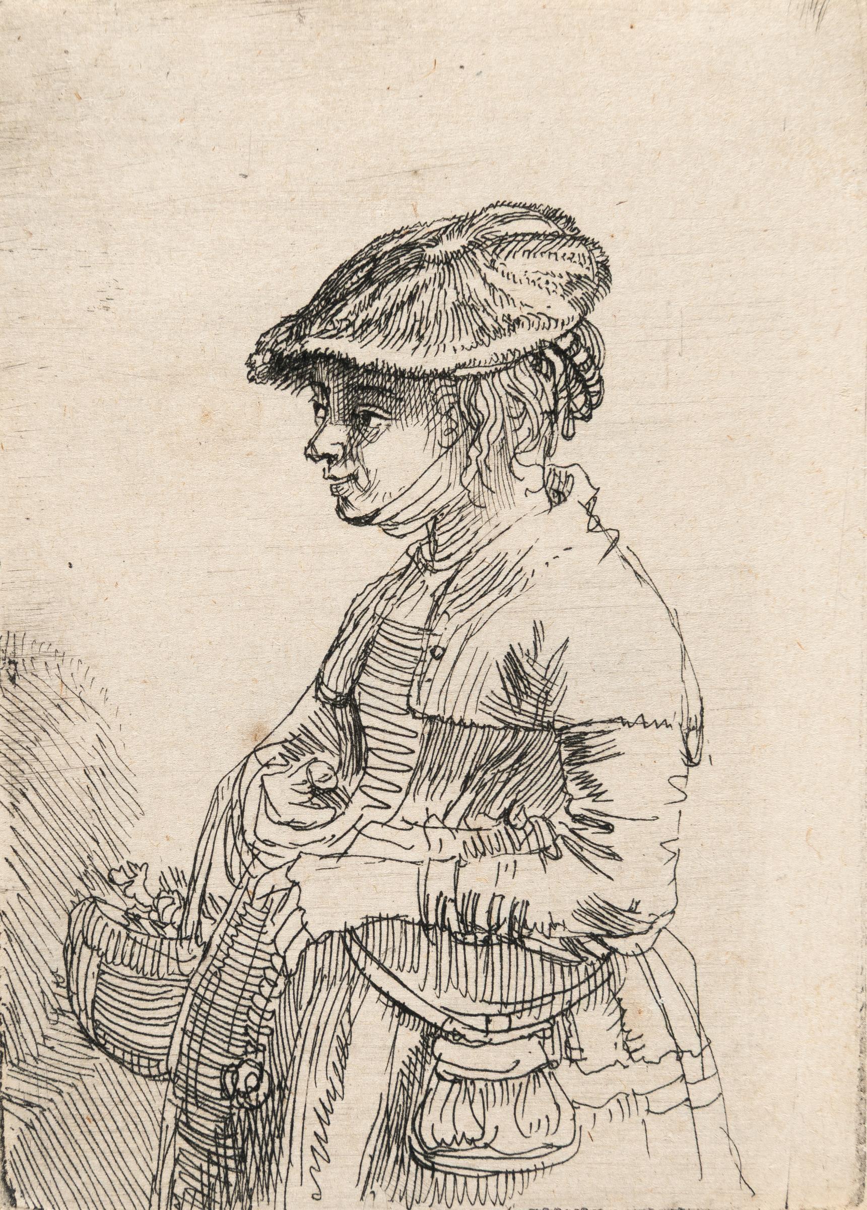 A very fine, fresh impression of the third state, with slight burr under the cap and with the fine horizontal wiping scratches and tone. With the shading lines added to the girl's forehead and nose. This young woman carrying a reed basket gives the impression that Rembrandt might have encountered her at the market. Yet, such a meeting is virtually impossible. Her 16th-century German attire appears decidedly outdated, and the chin strap around her jaw had not been worn in the Netherlands for centuries. For this portrayal, Rembrandt likely drew inspiration from 16th-century costume print series. With narrow margins around the inky platemark. – Verso with slight foxing and one very faint water stain. Verso remnants of former mounting along the right margin. Otherwise in very good condition. Very rare!