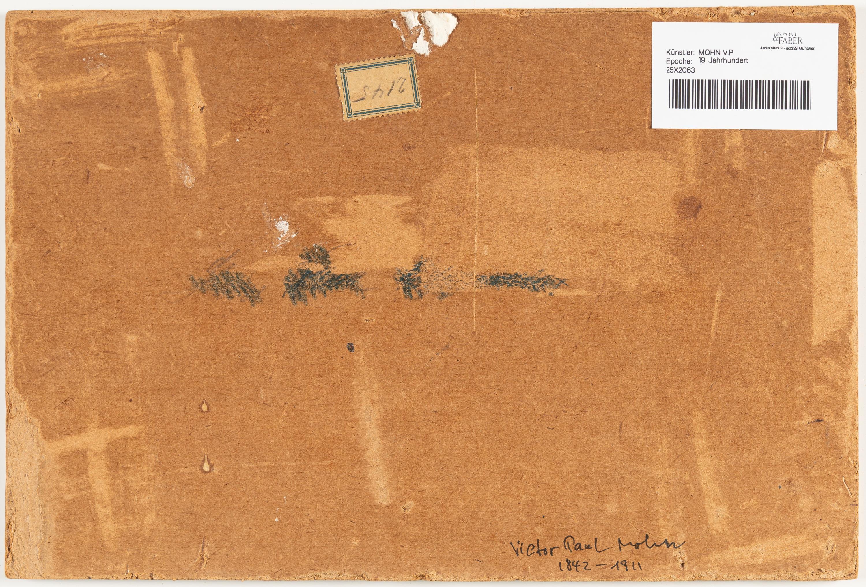 Victor Paul Mohn Landschaftsausschnitt mit Baumgruppe Previous Lot overview Next Lot ID Lot 4021 Artist Victor Paul Mohn Öl auf Leinwand, über Bleistiftspuren, aufgezogen auf Pappe. 17,7 x 27 cm (Untersatz 19,2 x 28,5 cm). Unten rechts signiert und undeutlich datiert. Öl auf Leinwand, über Bleistiftspuren, aufgezogen auf Pappe. 17,7 x 27 cm (Untersatz 19,2 x 28,5 cm). Unten rechts signiert und undeutlich datiert. Description Die Bildkanten teils geringfügig berieben. Einzelne Reißnadellöchlein im oberen Rand. Von schöner Erhaltung. Add to favourites Download PDF Share Öl auf Leinwand, über Bleistiftspuren, aufgezogen auf Pappe. 17,7 x 27 cm (Untersatz 19,2 x 28,5 cm). Unten rechts signiert und undeutlich datiert. Description Die Bildkanten teils geringfügig berieben. Einzelne Reißnadellöchlein im oberen Rand. Von schöner Erhaltung.