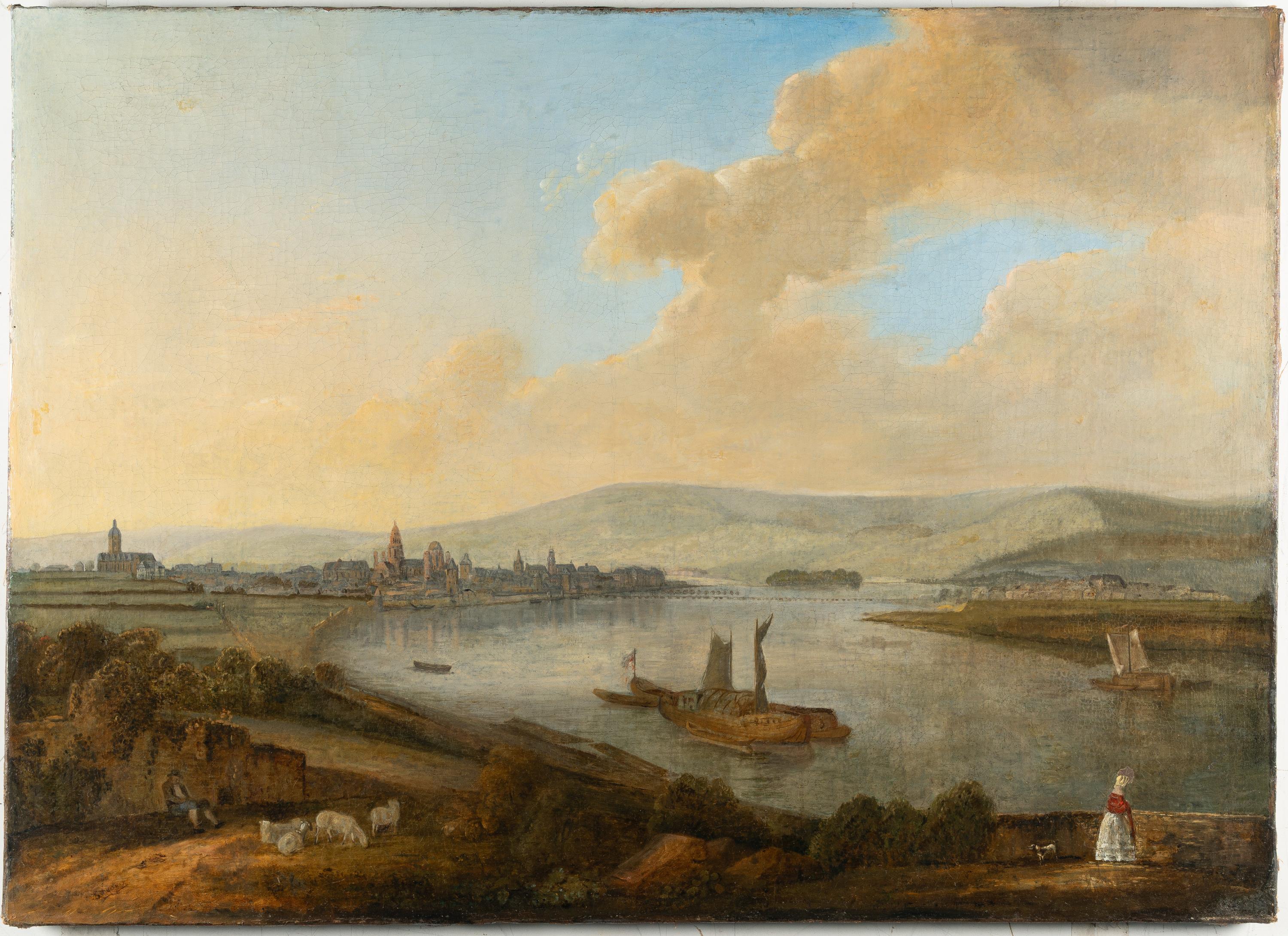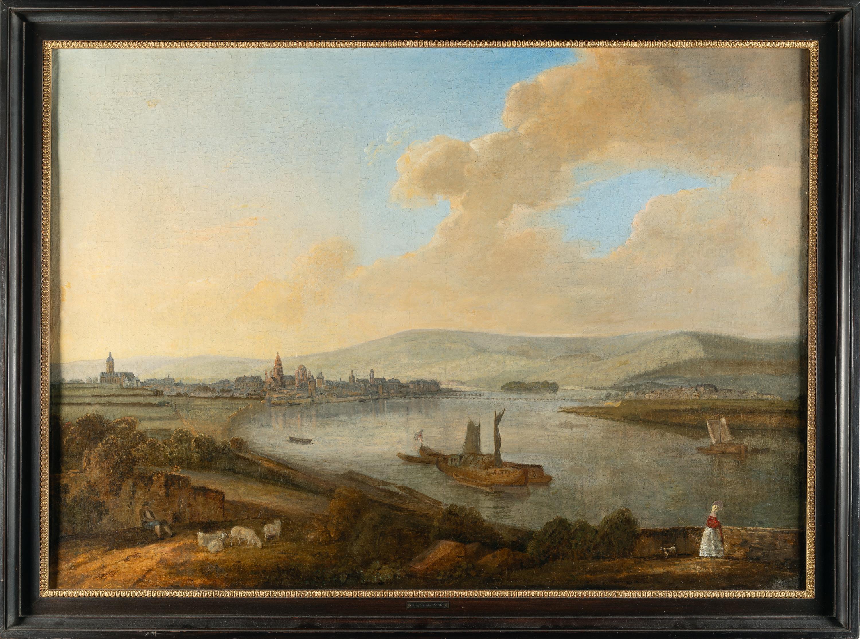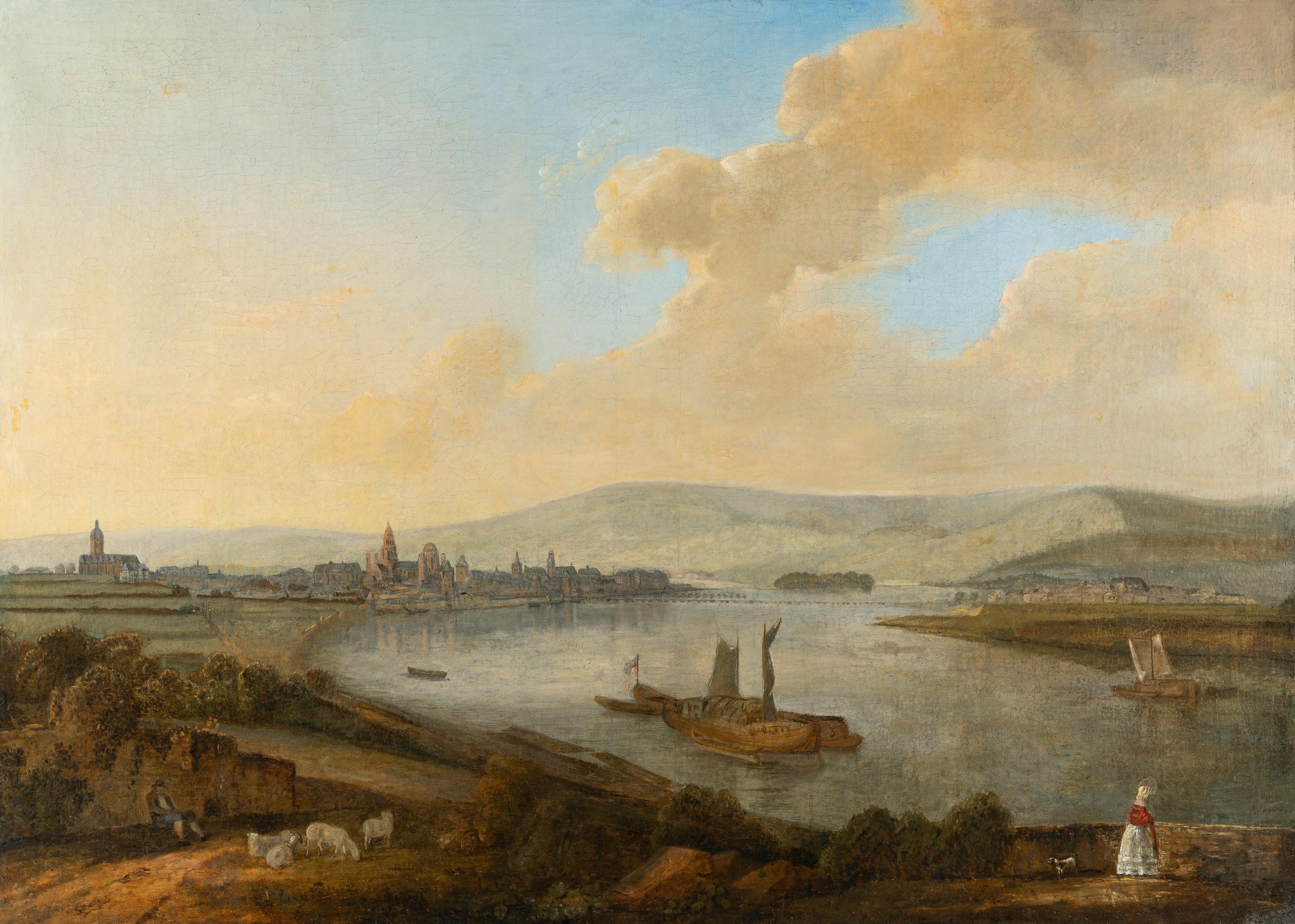 Wiederholung einer Rheinansicht von Johann Kaspar Schneider, datiert auf 1815, die vielfach ausgestellt und zuletzt im Oktober 2023 bei Sotheby's angeboten wurde (Los 89). Eingefangen ist der Blick vom ehemaligen Standort des Schlosses Favorite, welches zwischen 1700–20 von Lothar Franz von Schönborn, dem Kurfürsten von Mainz, errichtet und 1793 während der Napoleonischen Kriege zerstört wurde. Im linken Mittelgrund ist die Stadtsilhouette von Mainz zu erkennen; markant sind der Mainzer Dom ganz links sowie die Peterskirche mit ihren Zwiebelkuppeltürmen. Am gegenüberliegenden Rheinufer zeichnet sich Schloss Biebrich ab, die ehemalige Residenz der Fürsten von Nassau-Usingen. – Firnis etwas vergilbt. Durchgehendes Craquelé. Die Bildkanten rahmungsbedingt teils leicht berieben. In altersgemäß guter Erhaltung.