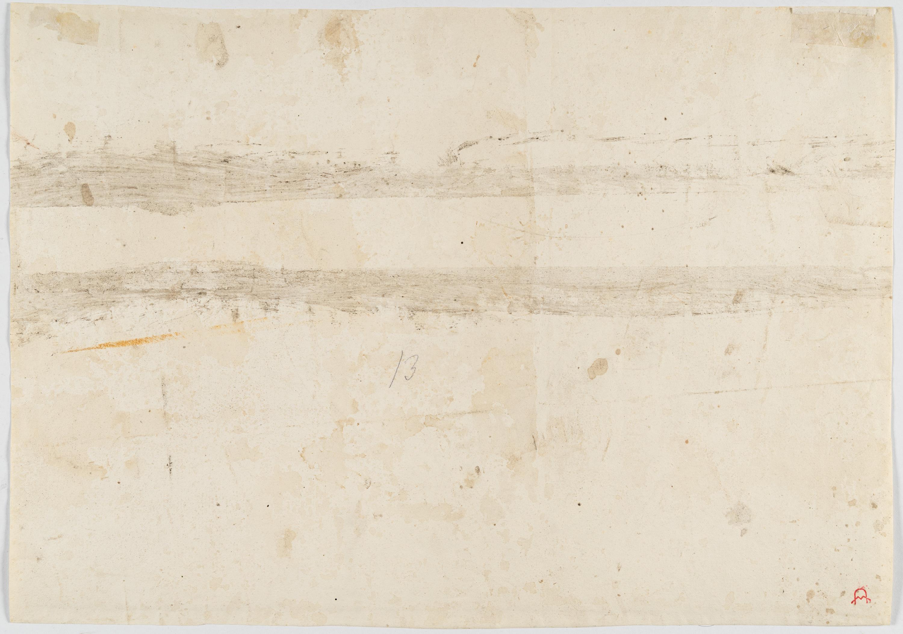Schwach braunfleckig; ein größerer Fleck in der unteren rechten Ecke. Eine Bleistiftskizze verso sich schwach recto abzeichnend. Die untere Blattkante rechts etwas ungleichmäßig. In altersgemäß guter Erhaltung.