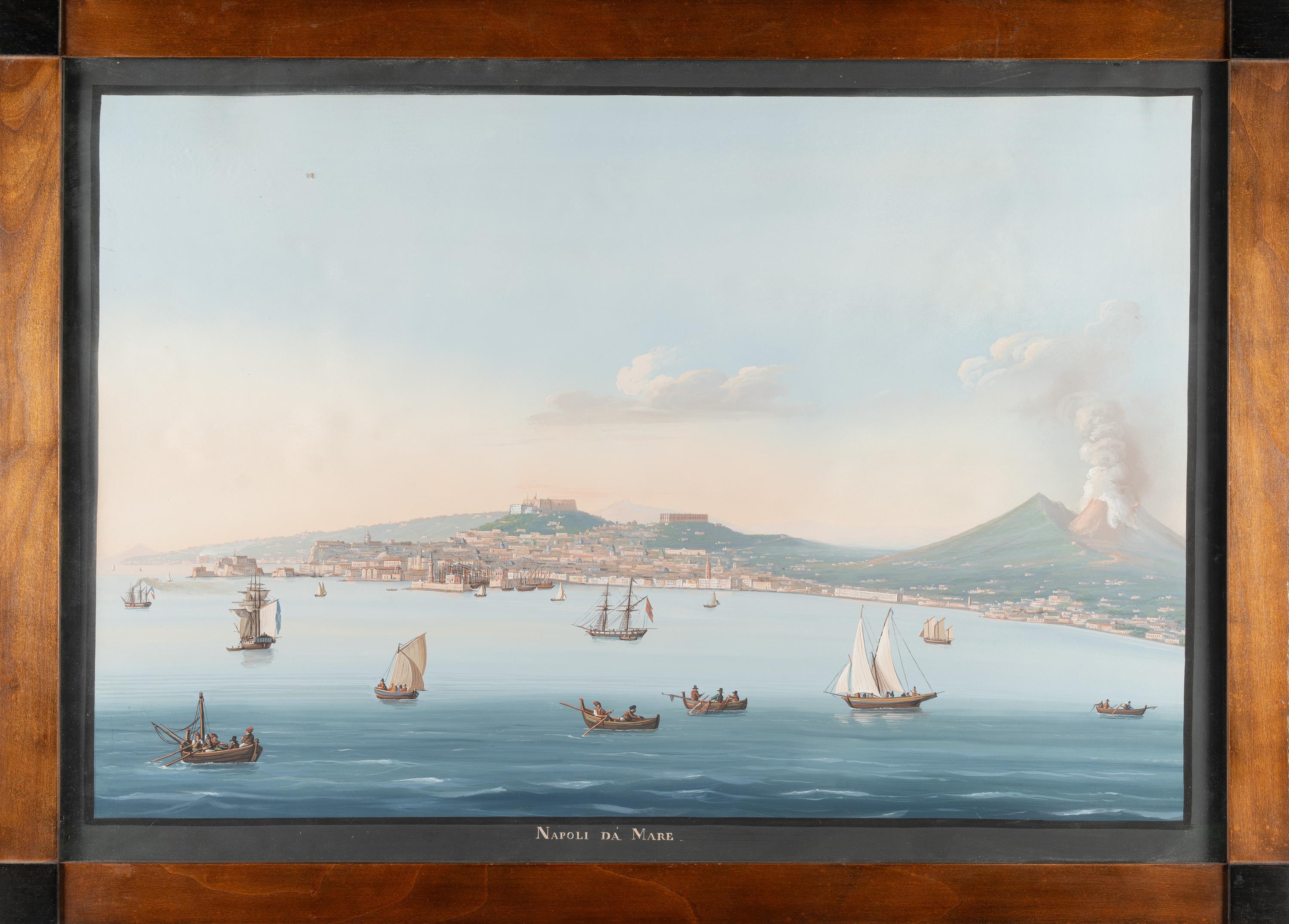 Gouache, partiell mit Deckweiß gehöht, auf Velin. (1. Hälfte 19. Jh.). 51 x 73,6 cm (Blattgröße). Mit einer Einfassungslinie in schwarzem Pinsel und schwarzgrau gouachierten Rändern. Im Unterrand mittig mit weißer Feder ortsbezeichnet „Napoli da Mare“.