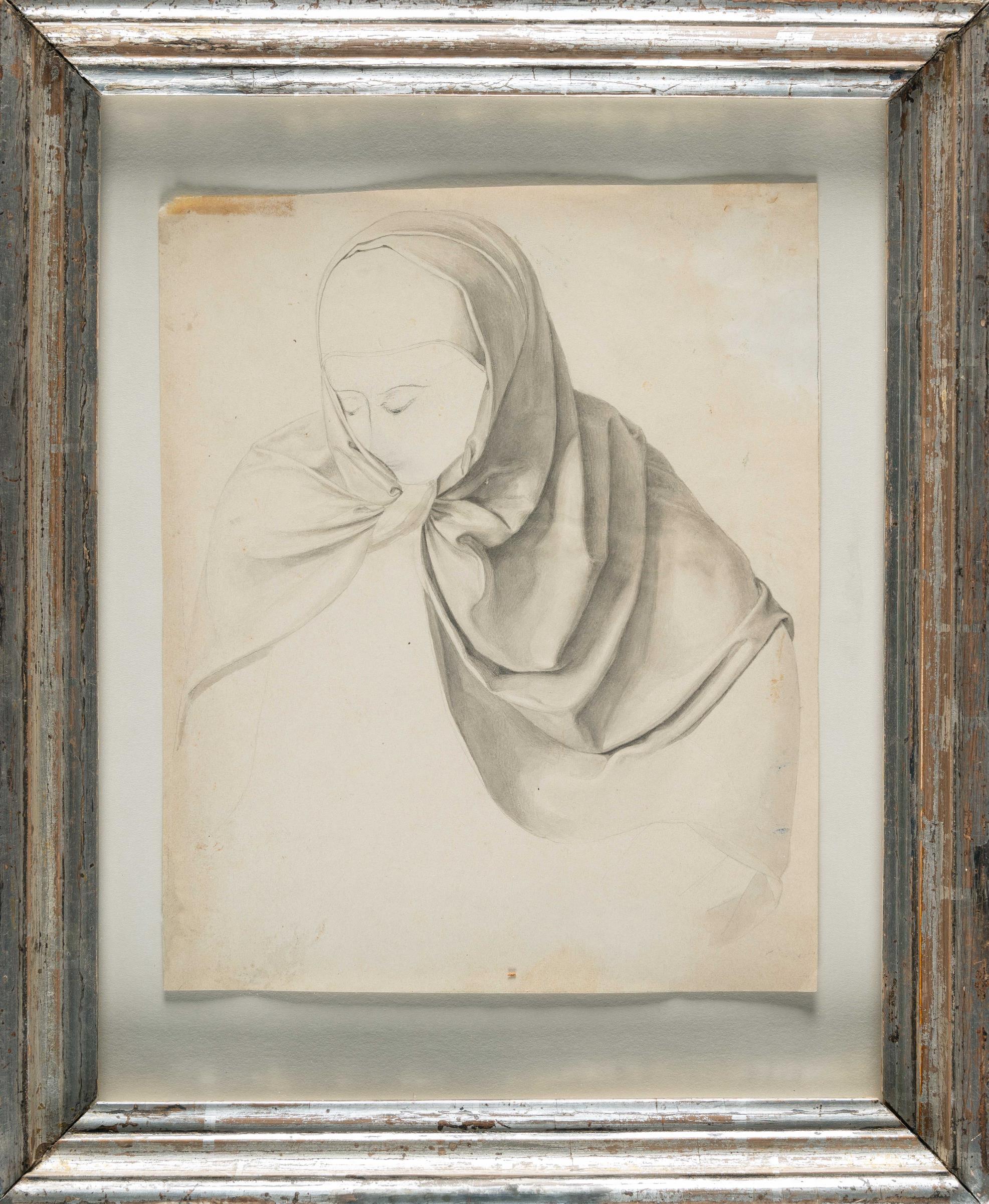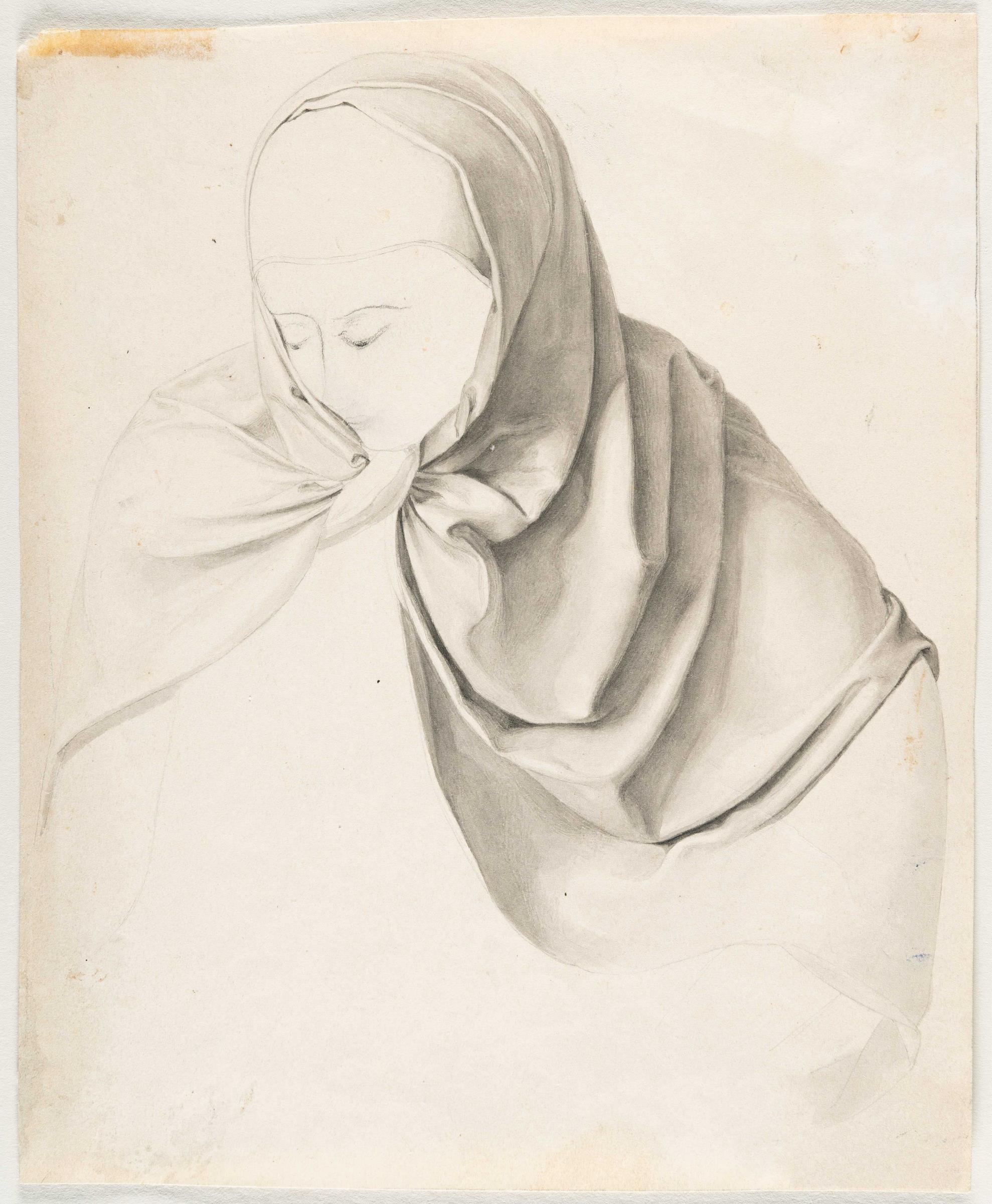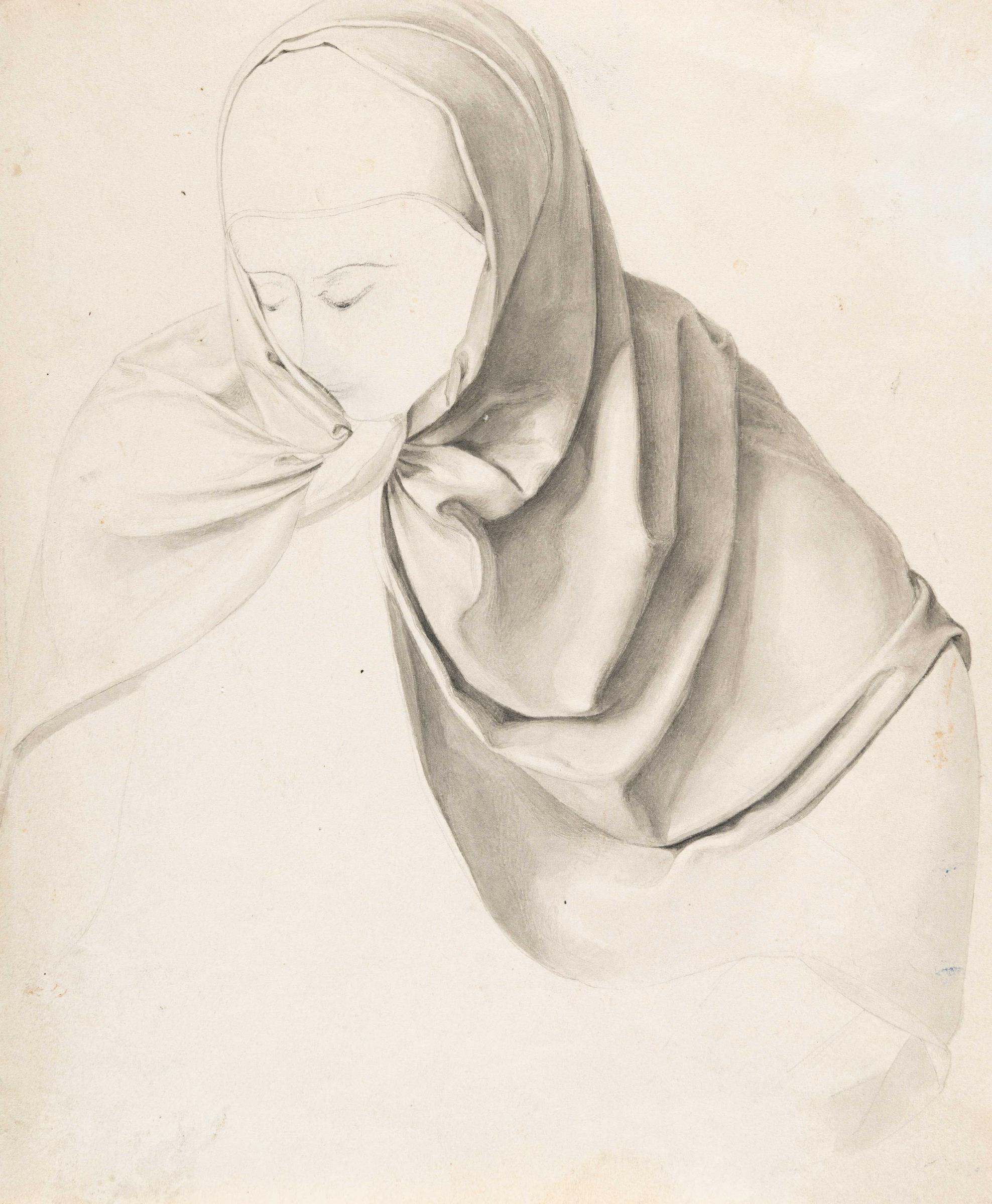 Kopfstudie einer Frau mit Kopftuch, niederblickend