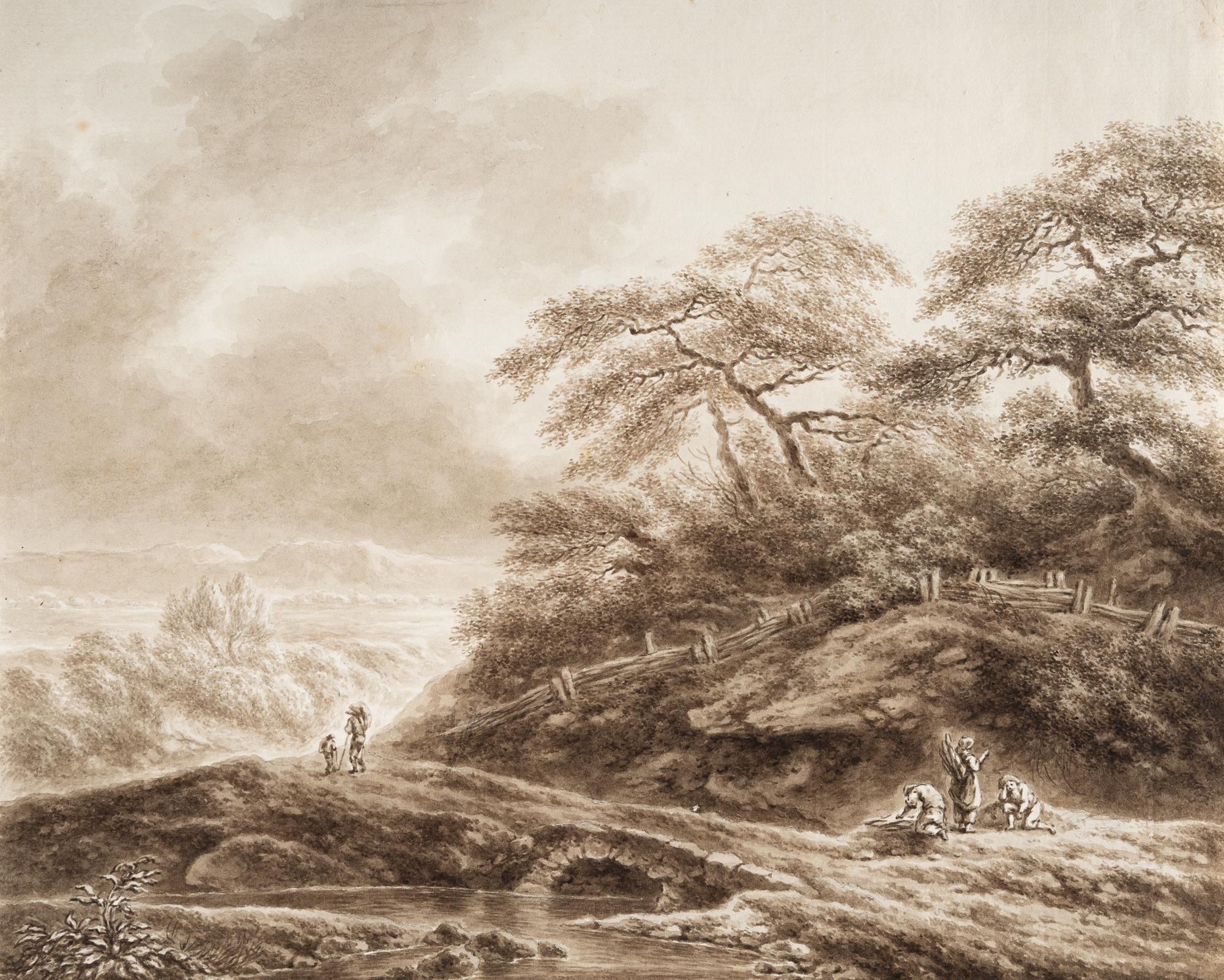 Feder und Pinsel in Braun auf cremefarbenem Velin mit angeschnittenem Wz. „Wappen mit Schrägbalken, darunter C & I HONIG“ (Heawood 64, dort datiert nach 1710). 1787. 23,7 x 29,1 cm. Signiert und datiert verso.