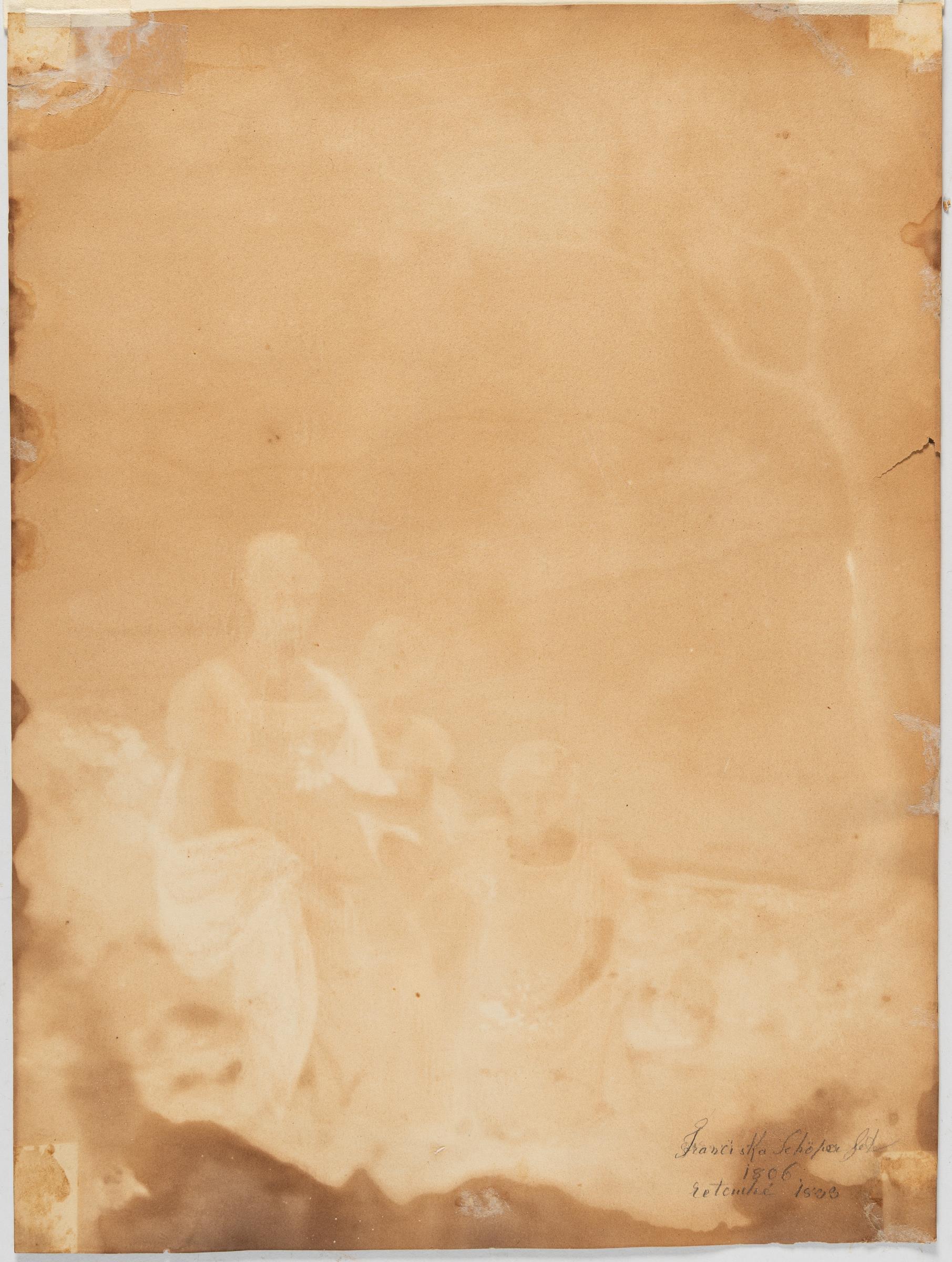Laut Angaben des Besitzers auf ehemaliger rückseitiger Pappe bezeichnet: „Gattin des Hofgartendirektors Karl Friedrich v. Sckell, der für Ludwig I. den Englischen Garten umgestaltete mit ihren beiden Töchtern: Ältere, spätere Gattin des Malers Carl Rottmann, jüngere später Gattin des Generals Stoeber, Mutter des Kriegsrats Stoeber, dessen Tochter Irene (gest. 1960) Hofsekretärin des Prinzen Alfons von Bayern war.“ – Papier insgesamt nachgedunkelt. Ein 2 cm langer Einriss im linken Rand. Die obere linke Ecke mit mehreren restaurierten Einrissen. Einzelne winzige Fleckchen. In altersgemäß guter Erhaltung.