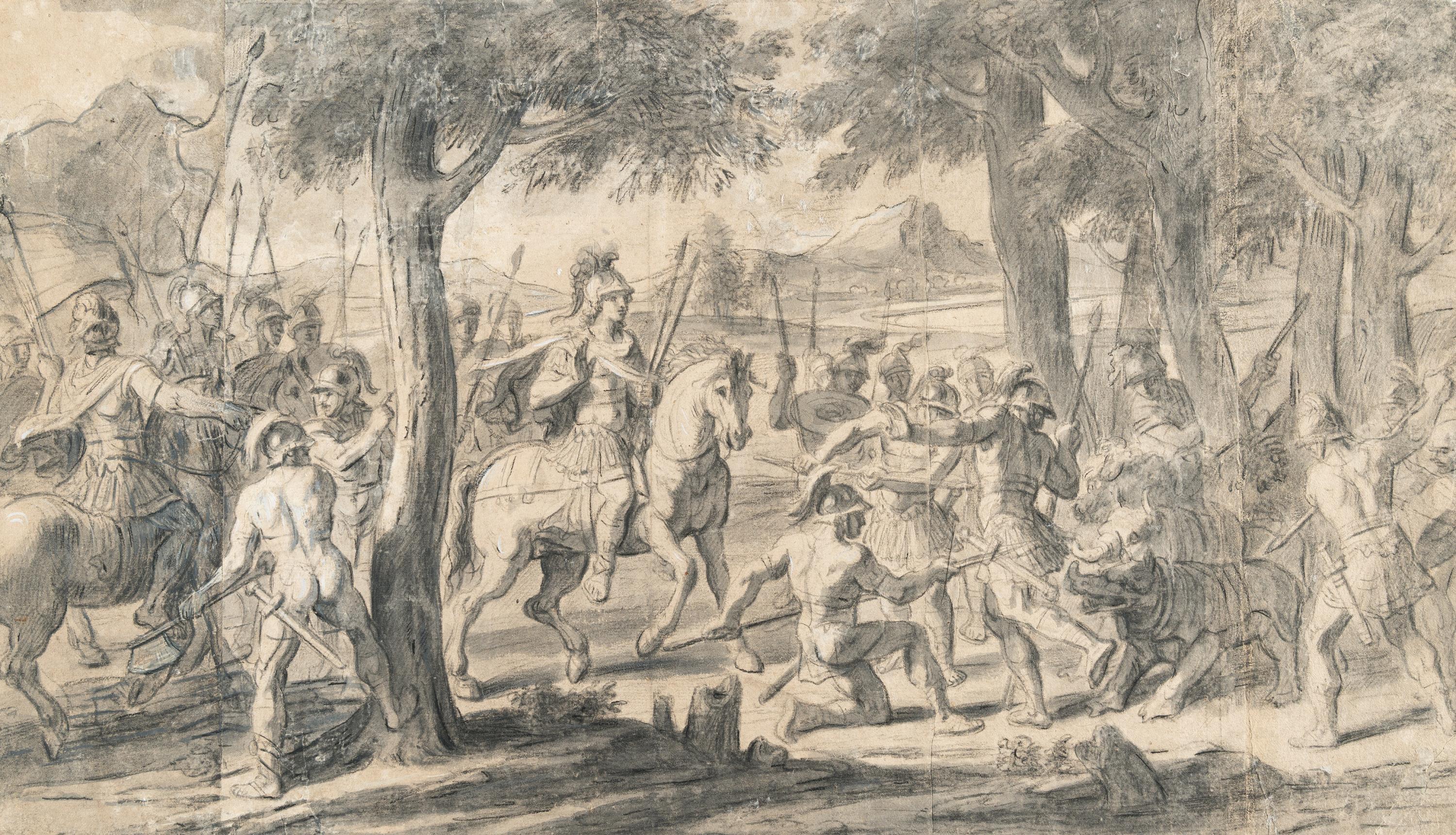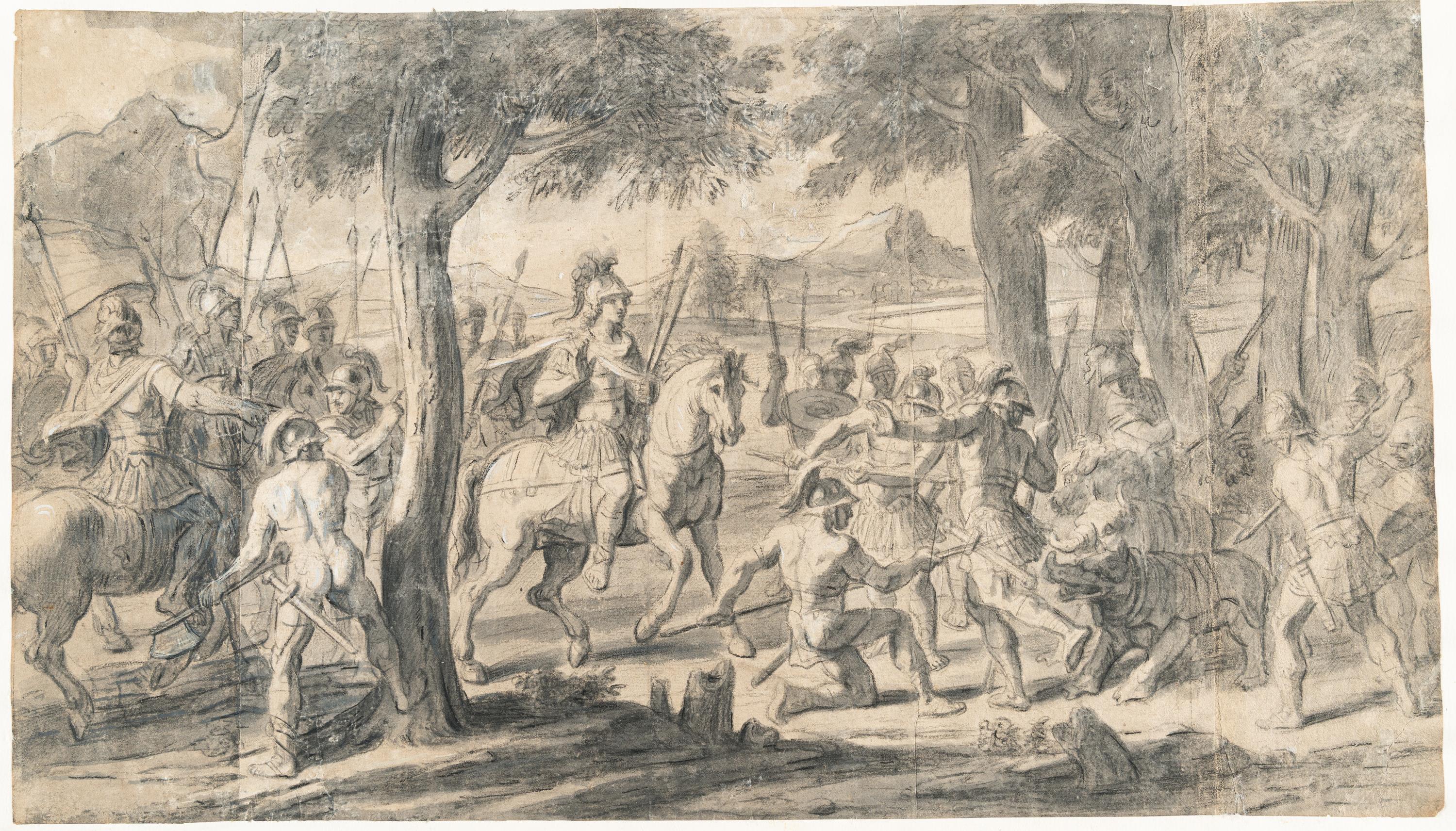 Francois Verdier Szene aus dem Eroberungsfeldzug Alexanders des Großen in Indien. Kampf gegen wilde Tiere Previous Lot overview Next Lot ID Lot 4122 Artist Francois Verdier Additional Description Schwarze Kreide, grau laviert und partiell mit Deckweiß gehöht, auf blaugrauem Bütten, links und rechts vom Künstler angestückt, aufgezogen auf Velin. 26,3 x 45,6 cm (Untersatz 33,7 x 53,8 cm). Period (1651 - Paris - 1730) Technique Arbeiten auf Papier Add favourite Status enquiry Share Description Papier oberflächlich berieben und mit hinterlegten Randeinrissen. In altersgemäßer Erhaltung.