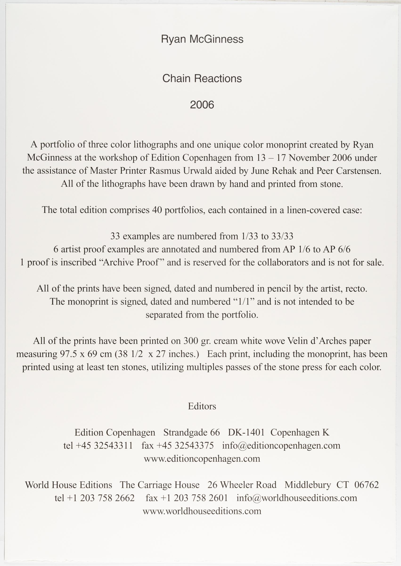 Mappe mit 3 farbigen Lithografien und 1 farbiger Monotypie auf Velin. Mit einem Titelblatt mit Impressum, in O.-HLn.-Mappe mit typografischem Titel. Herausgegeben von der Edition Copenhagen, Copenhagen, mit dem Trockenstempel, und World House Editions, Middlebury/Connecticut, 2006. Ca. 98 x 69 cm. Eines von 33 nummerierten Exemplaren, jeweils mit einer unikatären Monotypie. Jeweils signiert und datiert unten rechts.