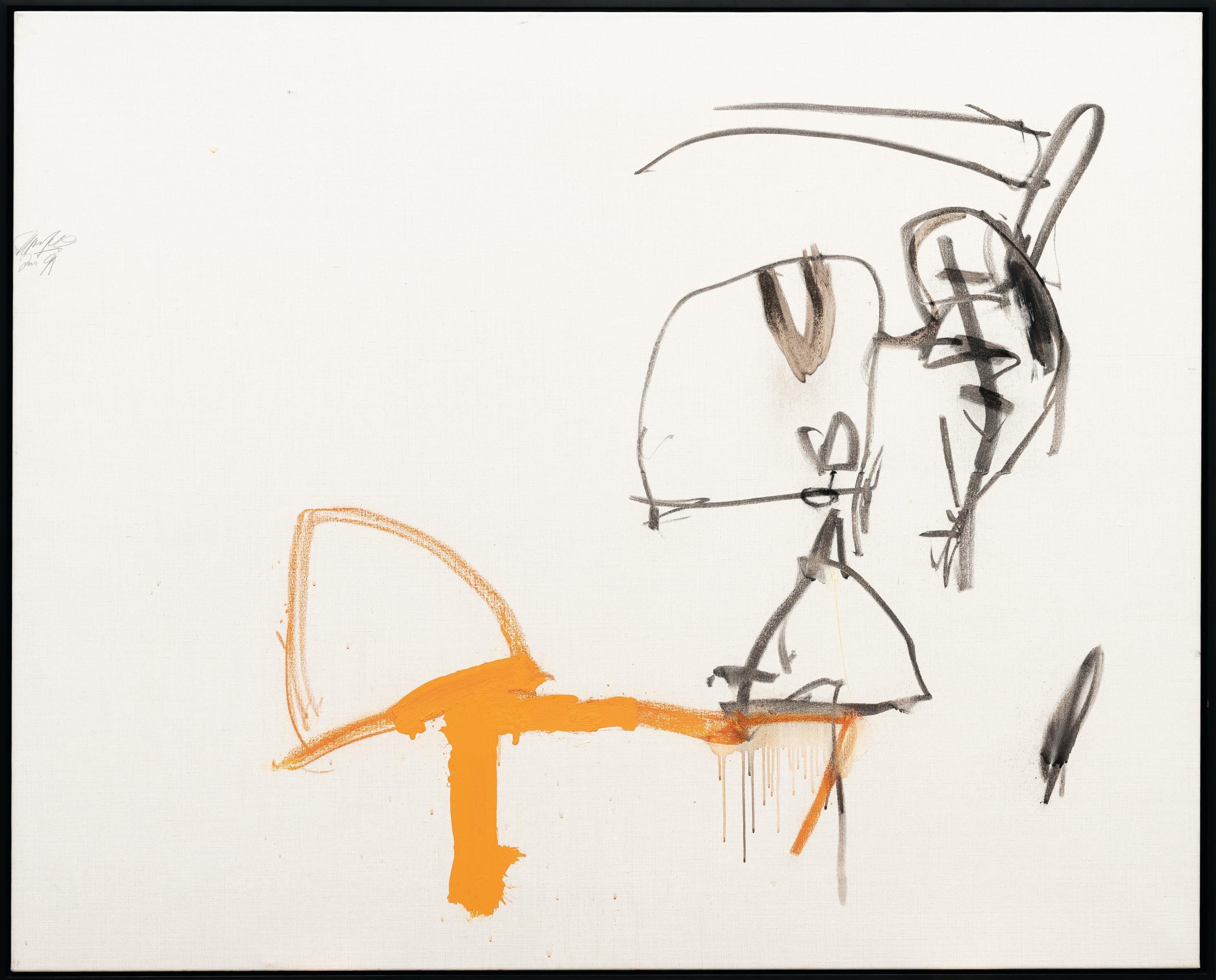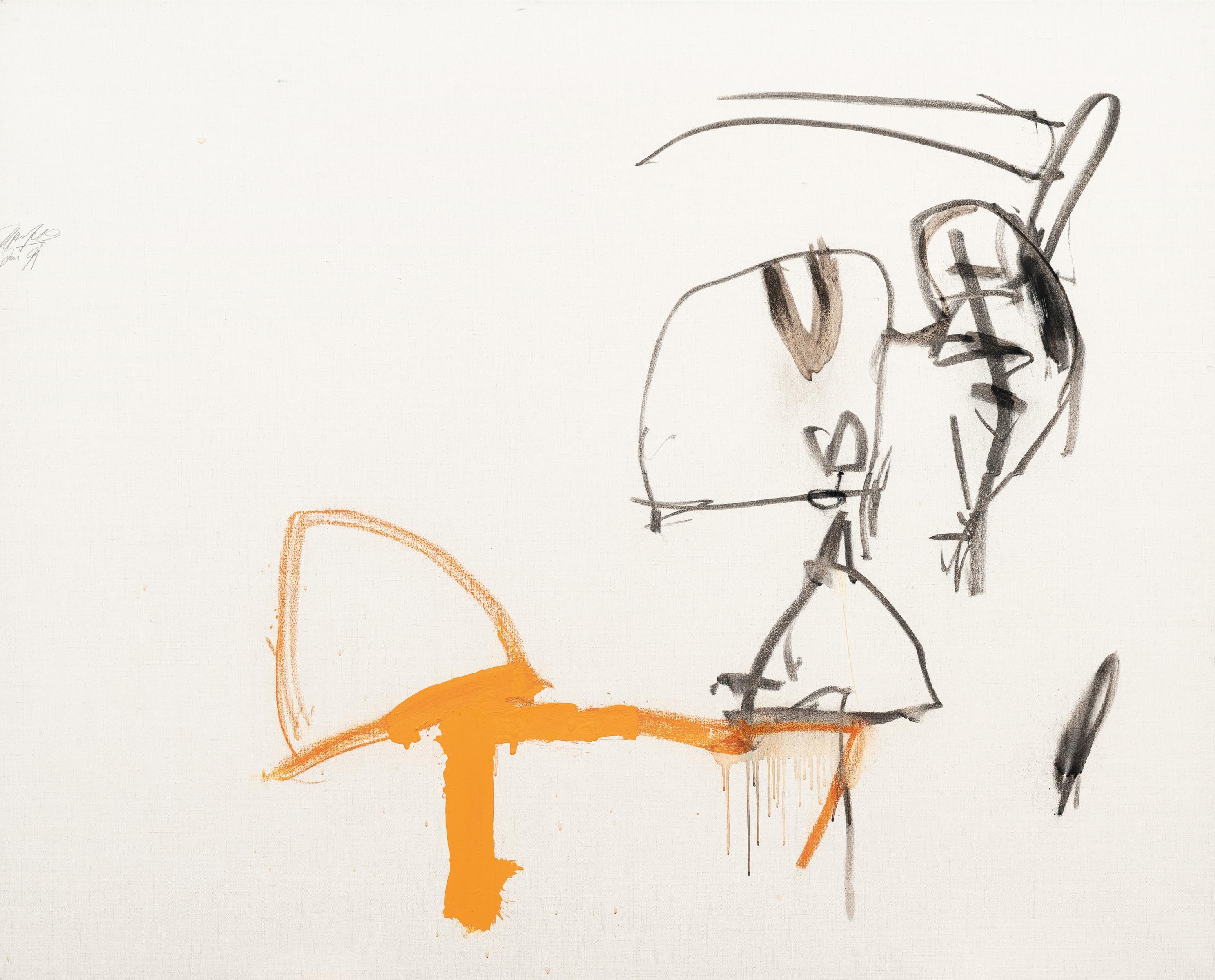 Mischtechnik mit Kohle, Acryl und Öl auf Leinwand. (19)91. Ca. 130 x 162 cm. Signiert sowie datiert „Jan 91“ oben am linken Rand. Verso auf der Leinwand betitelt sowie mit Technikangaben und der Werknummer „91-036“ bezeichnet.