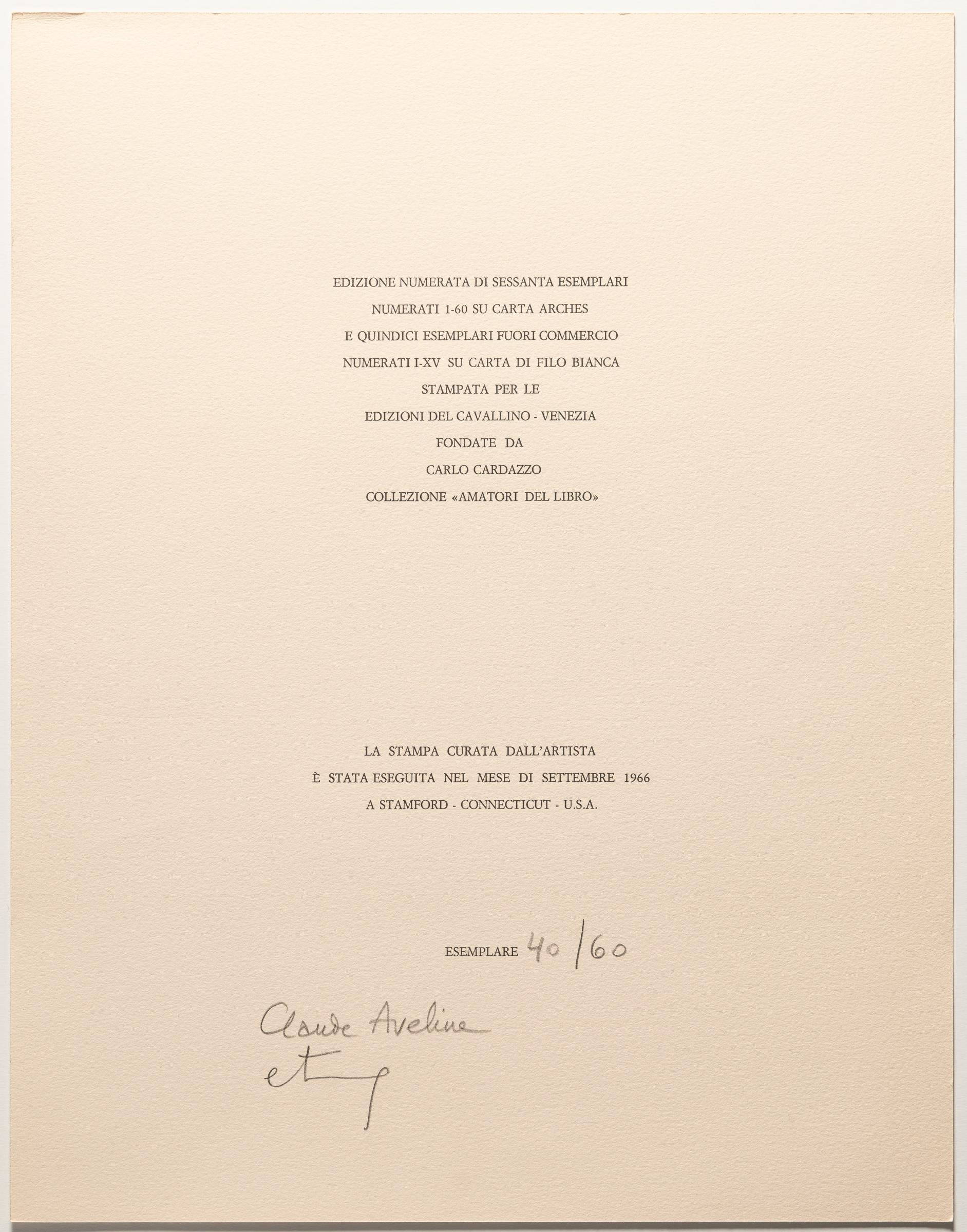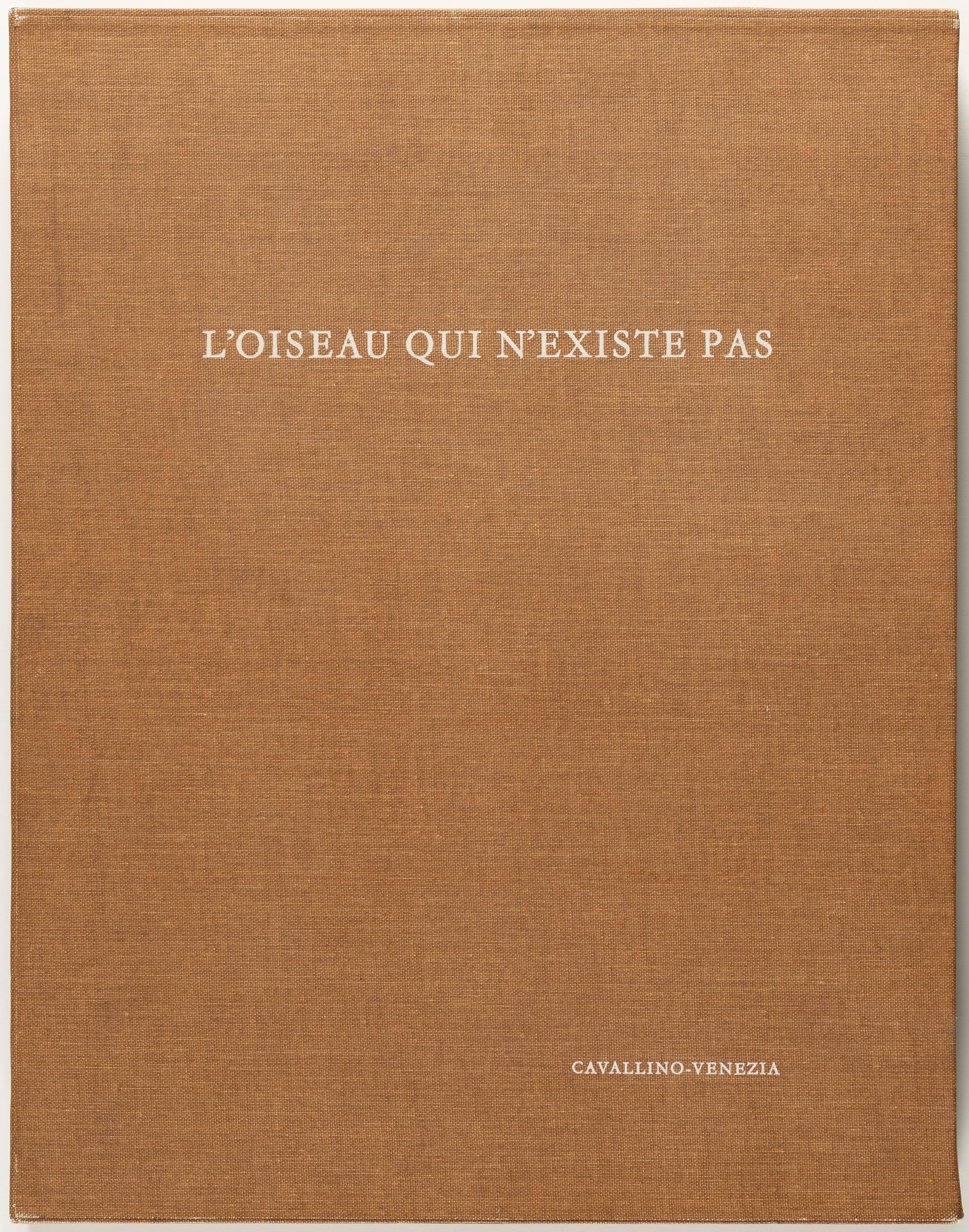 In dem 1966 entstandenen Künstlerbuch lässt Sorel Etrog Claude Avelines Gedicht „Portrait de l'Oiseau-Qui-N'Existe-Pas“ aus dem Jahr 1950 in eindrucksvollen Prägedrucken lebendig werden. Blattkanten vom Impressum und Titelblatt minimal bestoßen sowie mit leicht knickigen Ecken. O.-Mappe und -Schuber stellenweise schwach berieben und verschmutzt. Prägedrucke vereinzelt mit winzigen Fleckchen, sonst in sehr gutem Zustand.