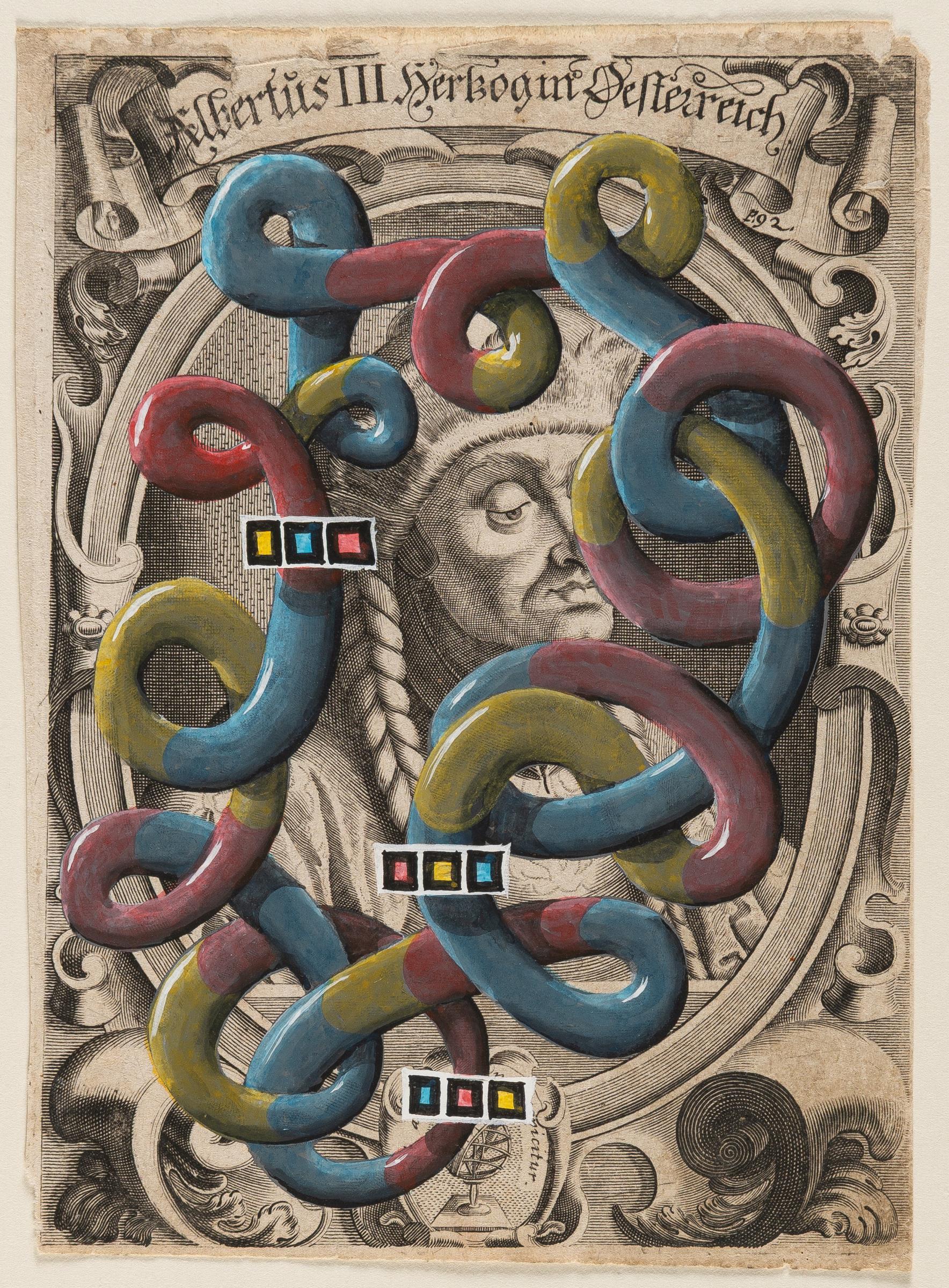 Gouache auf antikem Kupferstich auf Bütten. (2009). Ca. 19 x 14 cm. Verso betitelt.