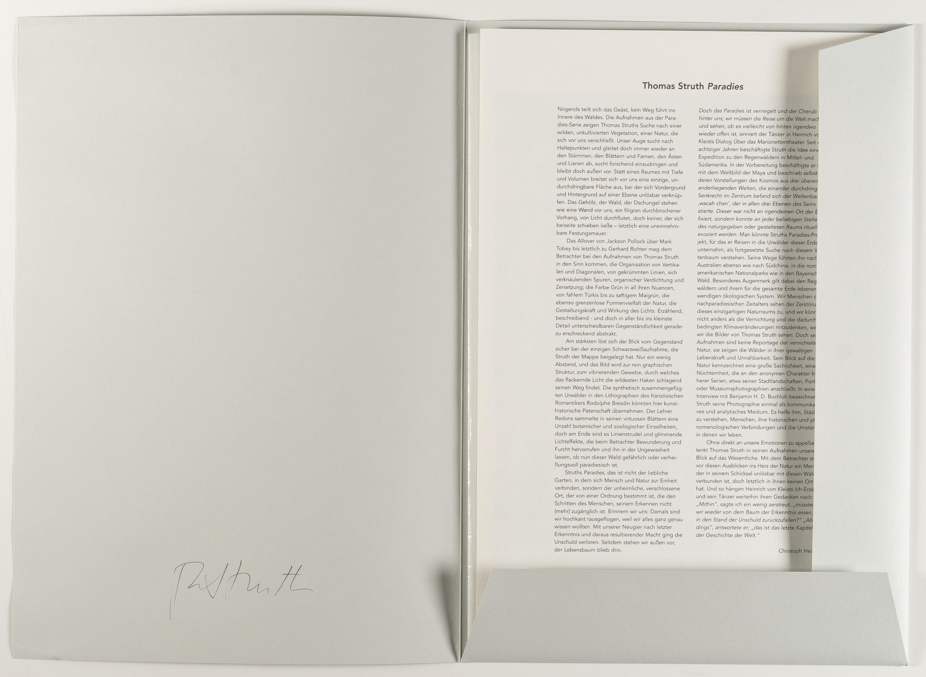 Mappe mit 6 Tintenstrahldrucken, davon 5 farbig, auf Karton sowie mit Textblatt inklusive Inhaltsverzeichnis. In O.-Kartonmappe. (2004). Ca. 31 x 39 bzw. 39 x 31 cm (Blattgröße ca. 33 x 48,5 cm bzw. ca. 48,5 x 33 cm). Herausgegeben von der Edition Griffelkunst, Hamburg. Auflagenhöhe unbekannt. Signiert auf dem Innendeckel der Mappe. Je verso typografisch bezeichnet.