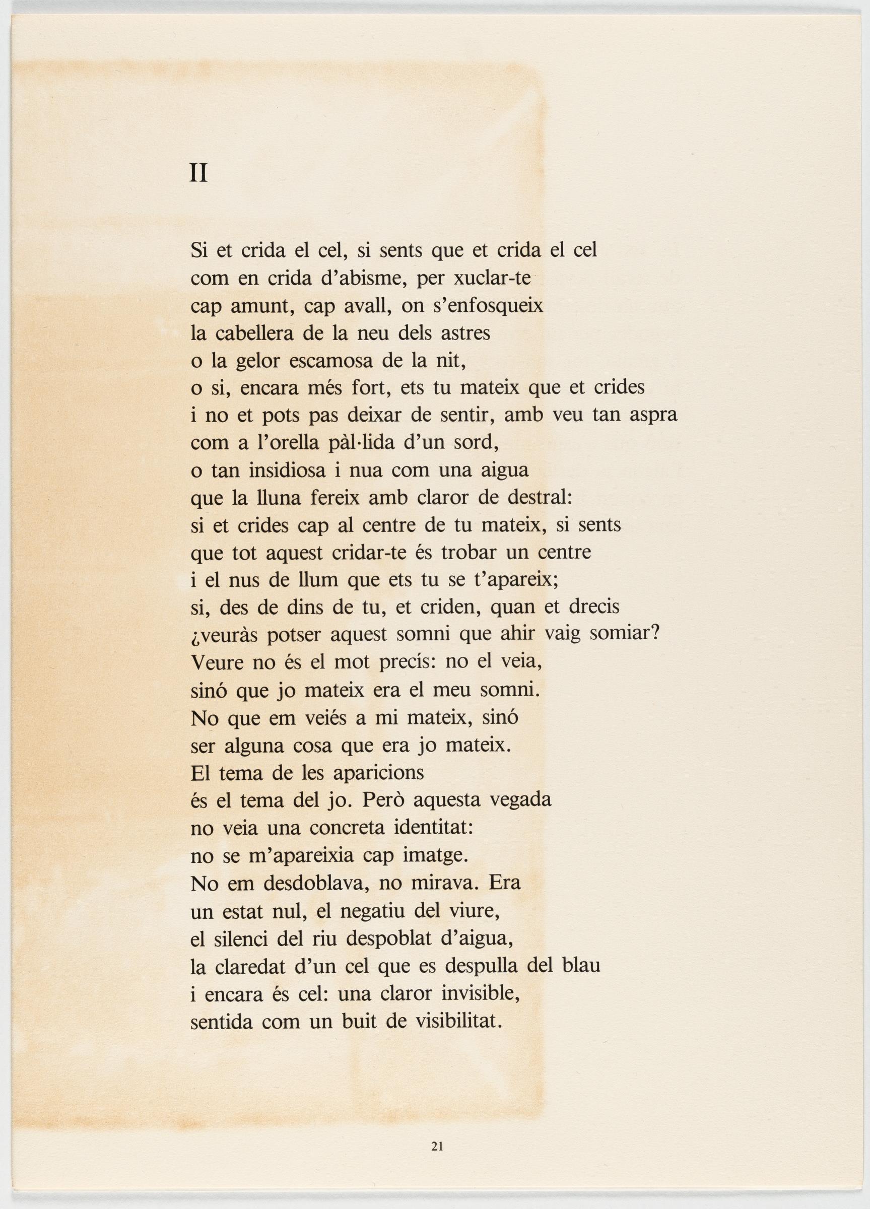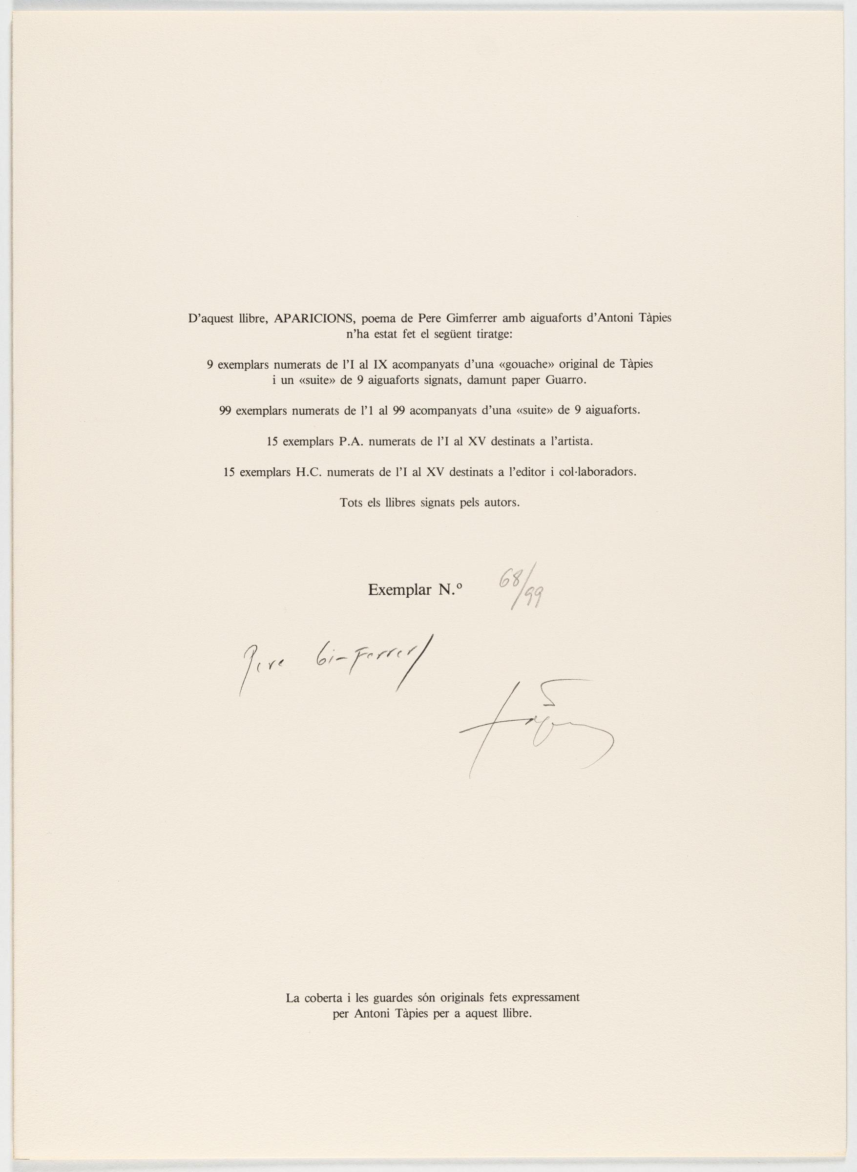 Mappenwerk mit 9 Radierungen mit Aquatinta, teils mit Prägedruck (davon 7 farbig), und 2 farbigen Lithografien. Mit Impressum, Titelblatt und einem Gedicht von Pere Gimferrer. In O.-Hln.-Mappe mit typografischem Titel und Bezeichnung sowie O.-HLn.-Schuber, beides bedruckt mit Reproduktionen nach Zeichnungen des Künstlers. Herausgegeben vom Verlag Edicions Polígrafa SA, Barcelona, 1982. Bis ca. 65 x 45 cm bzw. ca. 45 x 65 cm (teils blattgroß) (Schuber ca. 47 x 34 x 4 cm). Eines von 99 nummerierten Exemplaren. Im Impressum signiert sowie zusätzlich vom Autor signiert.